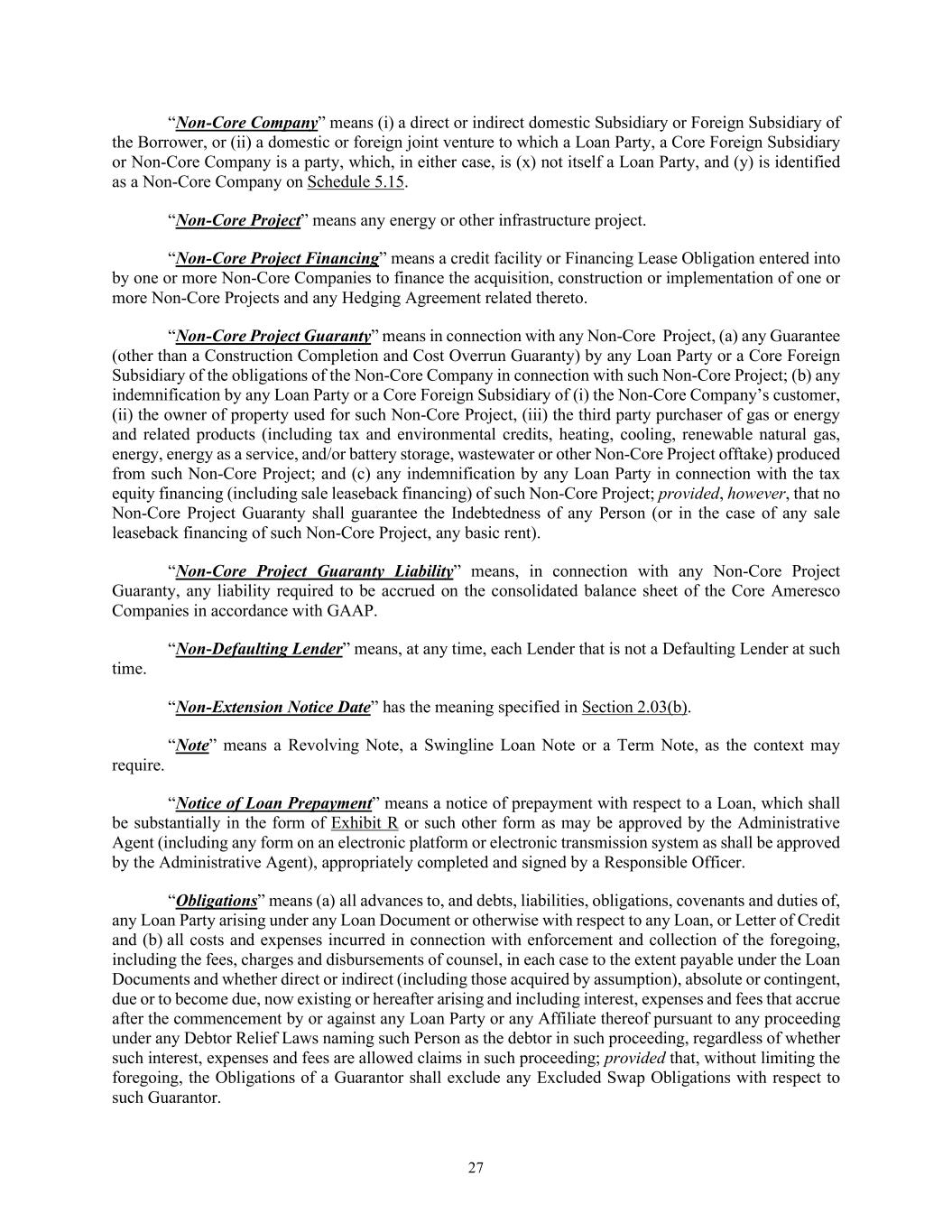 27 “Non-Core Company” means (i) a direct or indirect domestic Subsidiary or Foreign Subsidiary of the Borrower, or (ii) a domestic or foreign joint venture to which a Loan Party, a Core Foreign Subsidiary or Non-Core Company is a party, which, in either case, is (x) not itself a Loan Party, and (y) is identified as a Non-Core Company on Schedule 5.15. “Non-Core Project” means any energy or other infrastructure project. “Non-Core Project Financing” means a credit facility or Financing Lease Obligation entered into by one or more Non-Core Companies to finance the acquisition, construction or implementation of one or more Non-Core Projects and any Hedging Agreement related thereto. “Non-Core Project Guaranty” means in connection with any Non-Core Project, (a) any Guarantee (other than a Construction Completion and Cost Overrun Guaranty) by any Loan Party or a Core Foreign Subsidiary of the obligations of the Non-Core Company in connection with such Non-Core Project; (b) any indemnification by any Loan Party or a Core Foreign Subsidiary of (i) the Non-Core Company’s customer, (ii) the owner of property used for such Non-Core Project, (iii) the third party purchaser of gas or energy and related products (including tax and environmental credits, heating, cooling, renewable natural gas, energy, energy as a service, and/or battery storage, wastewater or other Non-Core Project offtake) produced from such Non-Core Project; and (c) any indemnification by any Loan Party in connection with the tax equity financing (including sale leaseback financing) of such Non-Core Project; provided, however, that no Non-Core Project Guaranty shall guarantee the Indebtedness of any Person (or in the case of any sale leaseback financing of such Non-Core Project, any basic rent). “Non-Core Project Guaranty Liability” means, in connection with any Non-Core Project Guaranty, any liability required to be accrued on the consolidated balance sheet of the Core Ameresco Companies in accordance with GAAP. “Non-Defaulting Lender” means, at any time, each Lender that is not a Defaulting Lender at such time. “Non-Extension Notice Date” has the meaning specified in Section 2.03(b). “Note” means a Revolving Note, a Swingline Loan Note or a Term Note, as the context may require. “Notice of Loan Prepayment” means a notice of prepayment with respect to a Loan, which shall be substantially in the form of Exhibit R or such other form as may be approved by the Administrative Agent (including any form on an electronic platform or electronic transmission system as shall be approved by the Administrative Agent), appropriately completed and signed by a Responsible Officer. “Obligations” means (a) all advances to, and debts, liabilities, obligations, covenants and duties of, any Loan Party arising under any Loan Document or otherwise with respect to any Loan, or Letter of Credit and (b) all costs and expenses incurred in connection with enforcement and collection of the foregoing, including the fees, charges and disbursements of counsel, in each case to the extent payable under the Loan Documents and whether direct or indirect (including those acquired by assumption), absolute or contingent, due or to become due, now existing or hereafter arising and including interest, expenses and fees that accrue after the commencement by or against any Loan Party or any Affiliate thereof pursuant to any proceeding under any Debtor Relief Laws naming such Person as the debtor in such proceeding, regardless of whether such interest, expenses and fees are allowed claims in such proceeding; provided that, without limiting the foregoing, the Obligations of a Guarantor shall exclude any Excluded Swap Obligations with respect to such Guarantor.