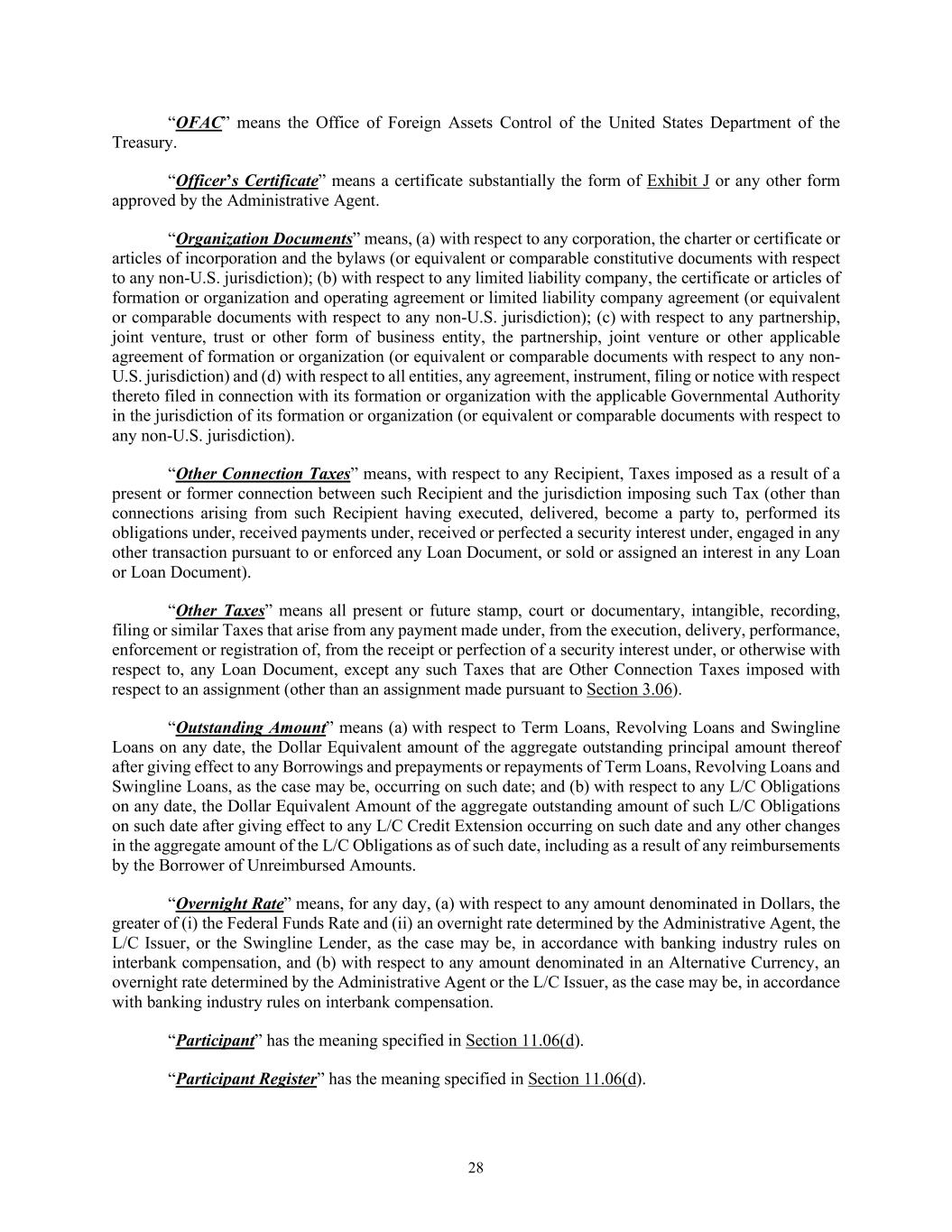 28 “OFAC” means the Office of Foreign Assets Control of the United States Department of the Treasury. “Officer’s Certificate” means a certificate substantially the form of Exhibit J or any other form approved by the Administrative Agent. “Organization Documents” means, (a) with respect to any corporation, the charter or certificate or articles of incorporation and the bylaws (or equivalent or comparable constitutive documents with respect to any non-U.S. jurisdiction); (b) with respect to any limited liability company, the certificate or articles of formation or organization and operating agreement or limited liability company agreement (or equivalent or comparable documents with respect to any non-U.S. jurisdiction); (c) with respect to any partnership, joint venture, trust or other form of business entity, the partnership, joint venture or other applicable agreement of formation or organization (or equivalent or comparable documents with respect to any non- U.S. jurisdiction) and (d) with respect to all entities, any agreement, instrument, filing or notice with respect thereto filed in connection with its formation or organization with the applicable Governmental Authority in the jurisdiction of its formation or organization (or equivalent or comparable documents with respect to any non-U.S. jurisdiction). “Other Connection Taxes” means, with respect to any Recipient, Taxes imposed as a result of a present or former connection between such Recipient and the jurisdiction imposing such Tax (other than connections arising from such Recipient having executed, delivered, become a party to, performed its obligations under, received payments under, received or perfected a security interest under, engaged in any other transaction pursuant to or enforced any Loan Document, or sold or assigned an interest in any Loan or Loan Document). “Other Taxes” means all present or future stamp, court or documentary, intangible, recording, filing or similar Taxes that arise from any payment made under, from the execution, delivery, performance, enforcement or registration of, from the receipt or perfection of a security interest under, or otherwise with respect to, any Loan Document, except any such Taxes that are Other Connection Taxes imposed with respect to an assignment (other than an assignment made pursuant to Section 3.06). “Outstanding Amount” means (a) with respect to Term Loans, Revolving Loans and Swingline Loans on any date, the Dollar Equivalent amount of the aggregate outstanding principal amount thereof after giving effect to any Borrowings and prepayments or repayments of Term Loans, Revolving Loans and Swingline Loans, as the case may be, occurring on such date; and (b) with respect to any L/C Obligations on any date, the Dollar Equivalent Amount of the aggregate outstanding amount of such L/C Obligations on such date after giving effect to any L/C Credit Extension occurring on such date and any other changes in the aggregate amount of the L/C Obligations as of such date, including as a result of any reimbursements by the Borrower of Unreimbursed Amounts. “Overnight Rate” means, for any day, (a) with respect to any amount denominated in Dollars, the greater of (i) the Federal Funds Rate and (ii) an overnight rate determined by the Administrative Agent, the L/C Issuer, or the Swingline Lender, as the case may be, in accordance with banking industry rules on interbank compensation, and (b) with respect to any amount denominated in an Alternative Currency, an overnight rate determined by the Administrative Agent or the L/C Issuer, as the case may be, in accordance with banking industry rules on interbank compensation. “Participant” has the meaning specified in Section 11.06(d). “Participant Register” has the meaning specified in Section 11.06(d).