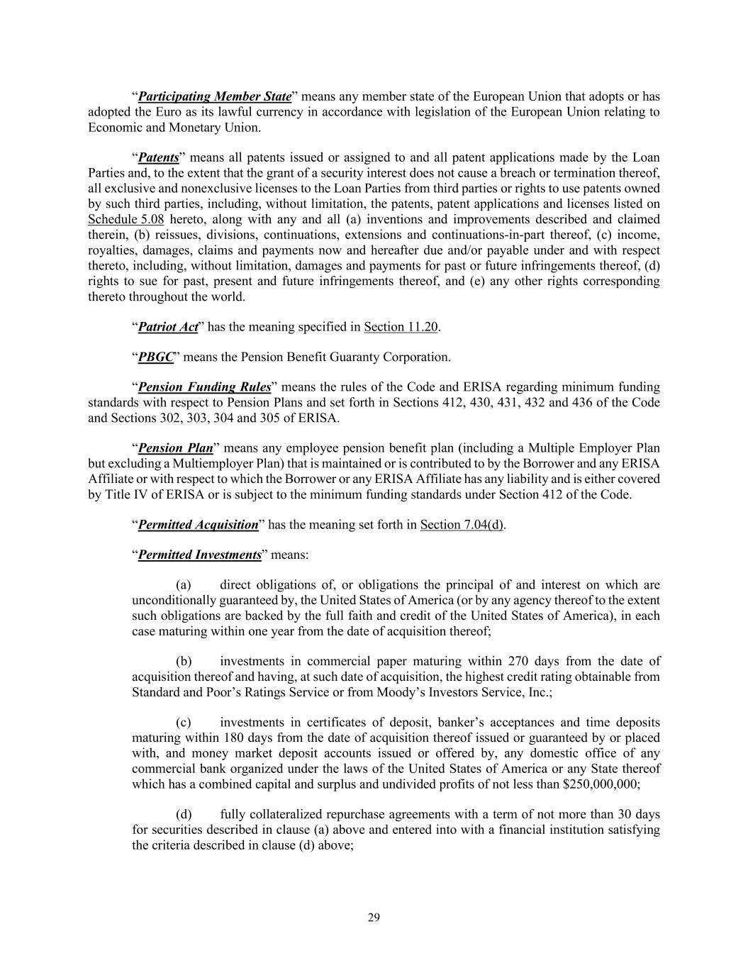 29 “Participating Member State” means any member state of the European Union that adopts or has adopted the Euro as its lawful currency in accordance with legislation of the European Union relating to Economic and Monetary Union. “Patents” means all patents issued or assigned to and all patent applications made by the Loan Parties and, to the extent that the grant of a security interest does not cause a breach or termination thereof, all exclusive and nonexclusive licenses to the Loan Parties from third parties or rights to use patents owned by such third parties, including, without limitation, the patents, patent applications and licenses listed on Schedule 5.08 hereto, along with any and all (a) inventions and improvements described and claimed therein, (b) reissues, divisions, continuations, extensions and continuations-in-part thereof, (c) income, royalties, damages, claims and payments now and hereafter due and/or payable under and with respect thereto, including, without limitation, damages and payments for past or future infringements thereof, (d) rights to sue for past, present and future infringements thereof, and (e) any other rights corresponding thereto throughout the world. “Patriot Act” has the meaning specified in Section 11.20. “PBGC” means the Pension Benefit Guaranty Corporation. “Pension Funding Rules” means the rules of the Code and ERISA regarding minimum funding standards with respect to Pension Plans and set forth in Sections 412, 430, 431, 432 and 436 of the Code and Sections 302, 303, 304 and 305 of ERISA. “Pension Plan” means any employee pension benefit plan (including a Multiple Employer Plan but excluding a Multiemployer Plan) that is maintained or is contributed to by the Borrower and any ERISA Affiliate or with respect to which the Borrower or any ERISA Affiliate has any liability and is either covered by Title IV of ERISA or is subject to the minimum funding standards under Section 412 of the Code. “Permitted Acquisition” has the meaning set forth in Section 7.04(d). “Permitted Investments” means: (a) direct obligations of, or obligations the principal of and interest on which are unconditionally guaranteed by, the United States of America (or by any agency thereof to the extent such obligations are backed by the full faith and credit of the United States of America), in each case maturing within one year from the date of acquisition thereof; (b) investments in commercial paper maturing within 270 days from the date of acquisition thereof and having, at such date of acquisition, the highest credit rating obtainable from Standard and Poor’s Ratings Service or from Moody’s Investors Service, Inc.; (c) investments in certificates of deposit, banker’s acceptances and time deposits maturing within 180 days from the date of acquisition thereof issued or guaranteed by or placed with, and money market deposit accounts issued or offered by, any domestic office of any commercial bank organized under the laws of the United States of America or any State thereof which has a combined capital and surplus and undivided profits of not less than $250,000,000; (d) fully collateralized repurchase agreements with a term of not more than 30 days for securities described in clause (a) above and entered into with a financial institution satisfying the criteria described in clause (d) above;