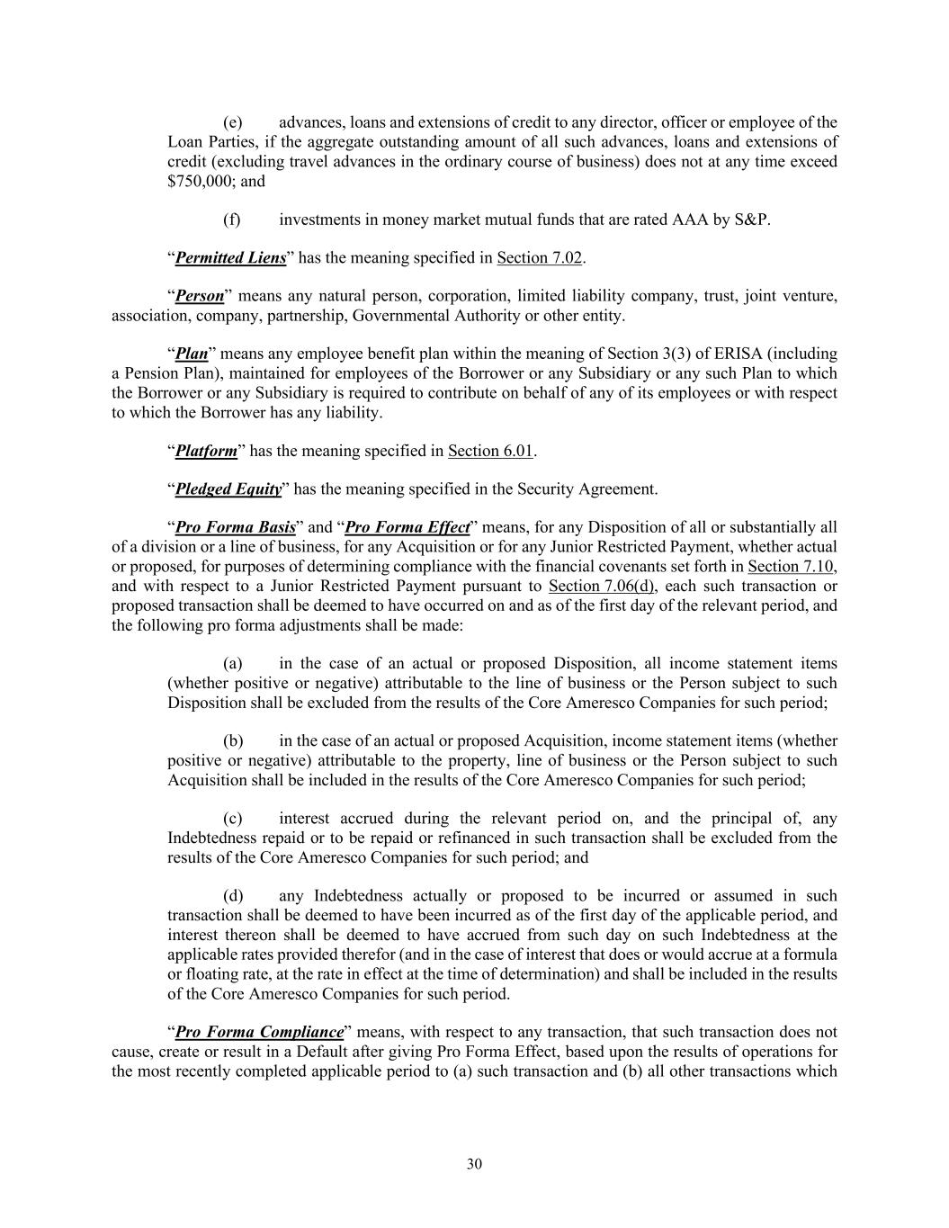 30 (e) advances, loans and extensions of credit to any director, officer or employee of the Loan Parties, if the aggregate outstanding amount of all such advances, loans and extensions of credit (excluding travel advances in the ordinary course of business) does not at any time exceed $750,000; and (f) investments in money market mutual funds that are rated AAA by S&P. “Permitted Liens” has the meaning specified in Section 7.02. “Person” means any natural person, corporation, limited liability company, trust, joint venture, association, company, partnership, Governmental Authority or other entity. “Plan” means any employee benefit plan within the meaning of Section 3(3) of ERISA (including a Pension Plan), maintained for employees of the Borrower or any Subsidiary or any such Plan to which the Borrower or any Subsidiary is required to contribute on behalf of any of its employees or with respect to which the Borrower has any liability. “Platform” has the meaning specified in Section 6.01. “Pledged Equity” has the meaning specified in the Security Agreement. “Pro Forma Basis” and “Pro Forma Effect” means, for any Disposition of all or substantially all of a division or a line of business, for any Acquisition or for any Junior Restricted Payment, whether actual or proposed, for purposes of determining compliance with the financial covenants set forth in Section 7.10, and with respect to a Junior Restricted Payment pursuant to Section 7.06(d), each such transaction or proposed transaction shall be deemed to have occurred on and as of the first day of the relevant period, and the following pro forma adjustments shall be made: (a) in the case of an actual or proposed Disposition, all income statement items (whether positive or negative) attributable to the line of business or the Person subject to such Disposition shall be excluded from the results of the Core Ameresco Companies for such period; (b) in the case of an actual or proposed Acquisition, income statement items (whether positive or negative) attributable to the property, line of business or the Person subject to such Acquisition shall be included in the results of the Core Ameresco Companies for such period; (c) interest accrued during the relevant period on, and the principal of, any Indebtedness repaid or to be repaid or refinanced in such transaction shall be excluded from the results of the Core Ameresco Companies for such period; and (d) any Indebtedness actually or proposed to be incurred or assumed in such transaction shall be deemed to have been incurred as of the first day of the applicable period, and interest thereon shall be deemed to have accrued from such day on such Indebtedness at the applicable rates provided therefor (and in the case of interest that does or would accrue at a formula or floating rate, at the rate in effect at the time of determination) and shall be included in the results of the Core Ameresco Companies for such period. “Pro Forma Compliance” means, with respect to any transaction, that such transaction does not cause, create or result in a Default after giving Pro Forma Effect, based upon the results of operations for the most recently completed applicable period to (a) such transaction and (b) all other transactions which