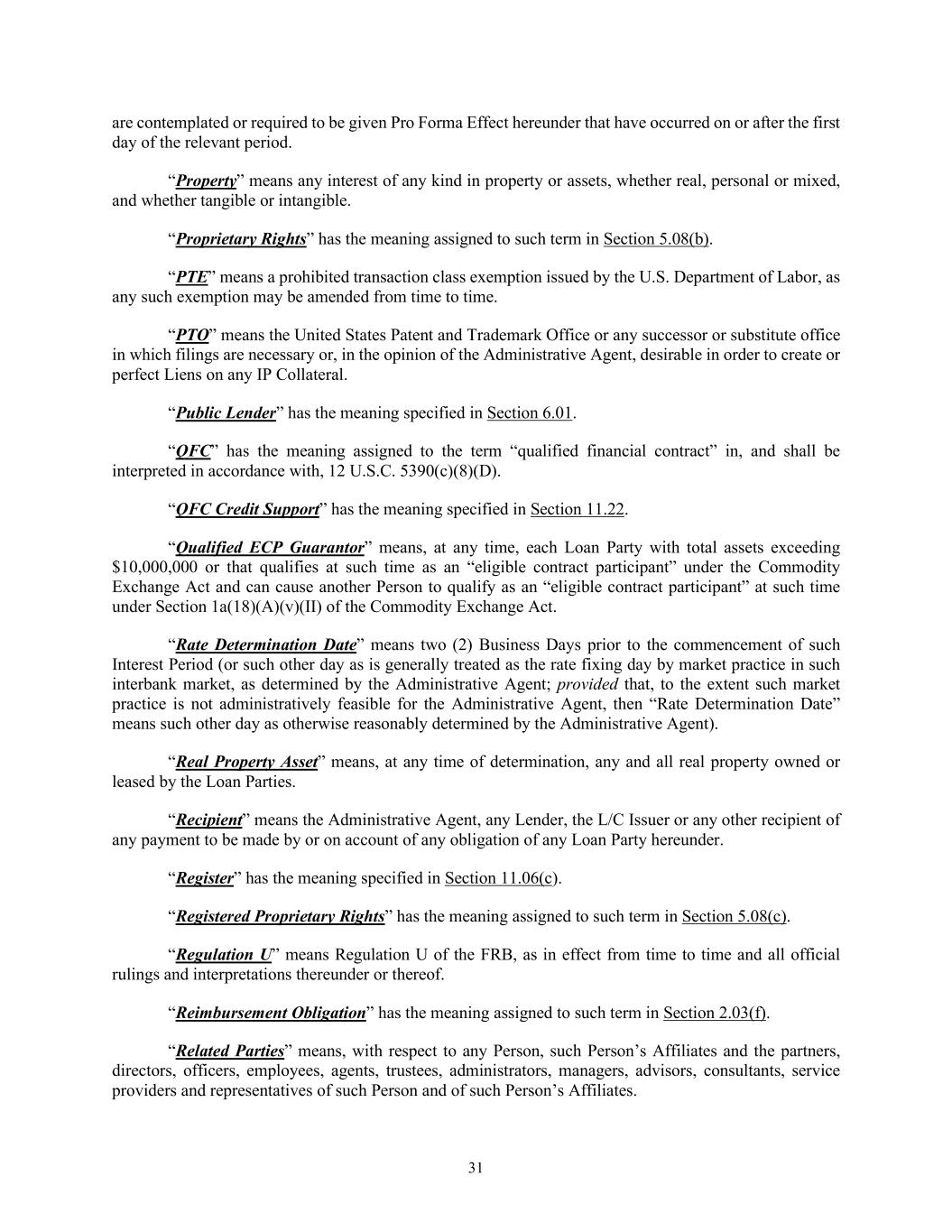 31 are contemplated or required to be given Pro Forma Effect hereunder that have occurred on or after the first day of the relevant period. “Property” means any interest of any kind in property or assets, whether real, personal or mixed, and whether tangible or intangible. “Proprietary Rights” has the meaning assigned to such term in Section 5.08(b). “PTE” means a prohibited transaction class exemption issued by the U.S. Department of Labor, as any such exemption may be amended from time to time. “PTO” means the United States Patent and Trademark Office or any successor or substitute office in which filings are necessary or, in the opinion of the Administrative Agent, desirable in order to create or perfect Liens on any IP Collateral. “Public Lender” has the meaning specified in Section 6.01. “QFC” has the meaning assigned to the term “qualified financial contract” in, and shall be interpreted in accordance with, 12 U.S.C. 5390(c)(8)(D). “QFC Credit Support” has the meaning specified in Section 11.22. “Qualified ECP Guarantor” means, at any time, each Loan Party with total assets exceeding $10,000,000 or that qualifies at such time as an “eligible contract participant” under the Commodity Exchange Act and can cause another Person to qualify as an “eligible contract participant” at such time under Section 1a(18)(A)(v)(II) of the Commodity Exchange Act. “Rate Determination Date” means two (2) Business Days prior to the commencement of such Interest Period (or such other day as is generally treated as the rate fixing day by market practice in such interbank market, as determined by the Administrative Agent; provided that, to the extent such market practice is not administratively feasible for the Administrative Agent, then “Rate Determination Date” means such other day as otherwise reasonably determined by the Administrative Agent). “Real Property Asset” means, at any time of determination, any and all real property owned or leased by the Loan Parties. “Recipient” means the Administrative Agent, any Lender, the L/C Issuer or any other recipient of any payment to be made by or on account of any obligation of any Loan Party hereunder. “Register” has the meaning specified in Section 11.06(c). “Registered Proprietary Rights” has the meaning assigned to such term in Section 5.08(c). “Regulation U” means Regulation U of the FRB, as in effect from time to time and all official rulings and interpretations thereunder or thereof. “Reimbursement Obligation” has the meaning assigned to such term in Section 2.03(f). “Related Parties” means, with respect to any Person, such Person’s Affiliates and the partners, directors, officers, employees, agents, trustees, administrators, managers, advisors, consultants, service providers and representatives of such Person and of such Person’s Affiliates.
