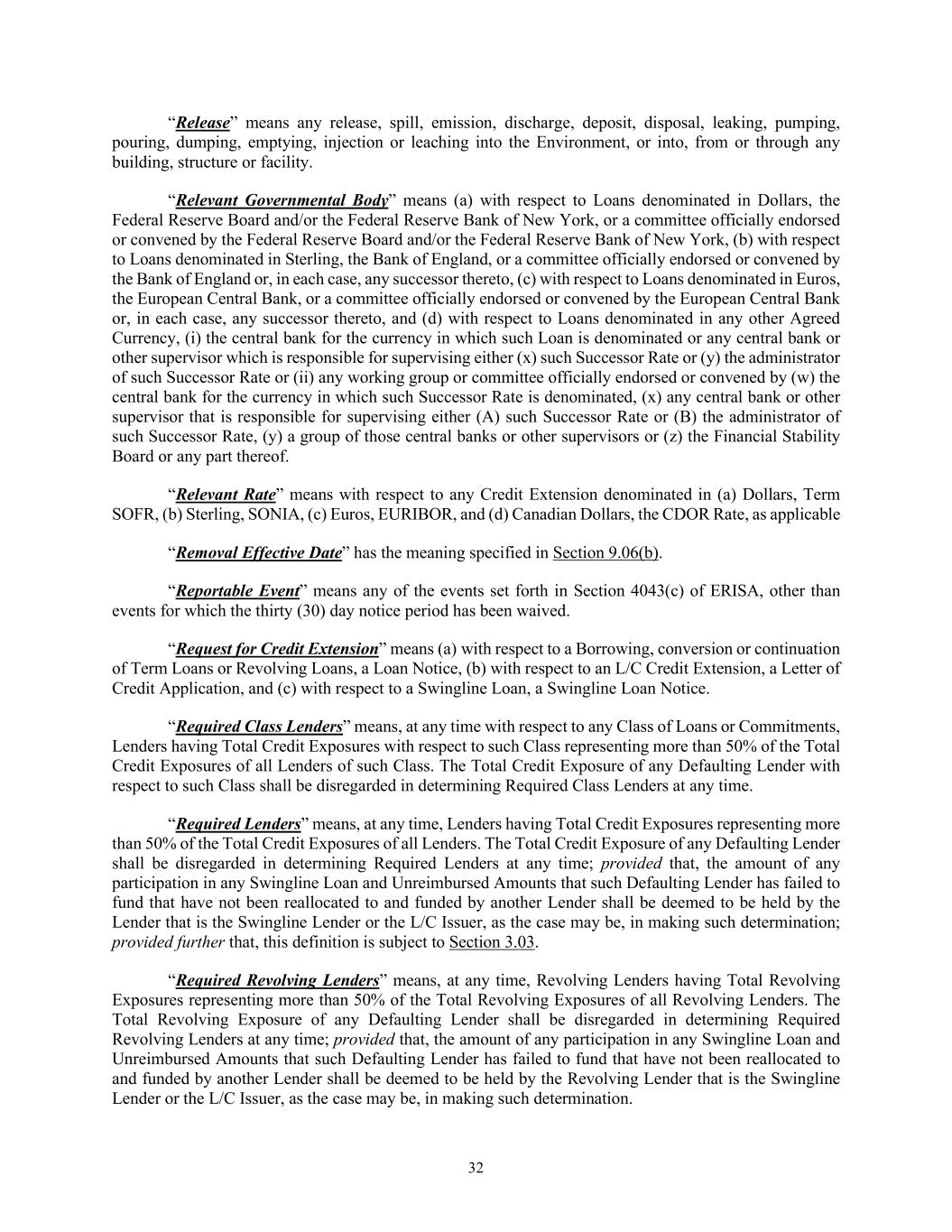 32 “Release” means any release, spill, emission, discharge, deposit, disposal, leaking, pumping, pouring, dumping, emptying, injection or leaching into the Environment, or into, from or through any building, structure or facility. “Relevant Governmental Body” means (a) with respect to Loans denominated in Dollars, the Federal Reserve Board and/or the Federal Reserve Bank of New York, or a committee officially endorsed or convened by the Federal Reserve Board and/or the Federal Reserve Bank of New York, (b) with respect to Loans denominated in Sterling, the Bank of England, or a committee officially endorsed or convened by the Bank of England or, in each case, any successor thereto, (c) with respect to Loans denominated in Euros, the European Central Bank, or a committee officially endorsed or convened by the European Central Bank or, in each case, any successor thereto, and (d) with respect to Loans denominated in any other Agreed Currency, (i) the central bank for the currency in which such Loan is denominated or any central bank or other supervisor which is responsible for supervising either (x) such Successor Rate or (y) the administrator of such Successor Rate or (ii) any working group or committee officially endorsed or convened by (w) the central bank for the currency in which such Successor Rate is denominated, (x) any central bank or other supervisor that is responsible for supervising either (A) such Successor Rate or (B) the administrator of such Successor Rate, (y) a group of those central banks or other supervisors or (z) the Financial Stability Board or any part thereof. “Relevant Rate” means with respect to any Credit Extension denominated in (a) Dollars, Term SOFR, (b) Sterling, SONIA, (c) Euros, EURIBOR, and (d) Canadian Dollars, the CDOR Rate, as applicable “Removal Effective Date” has the meaning specified in Section 9.06(b). “Reportable Event” means any of the events set forth in Section 4043(c) of ERISA, other than events for which the thirty (30) day notice period has been waived. “Request for Credit Extension” means (a) with respect to a Borrowing, conversion or continuation of Term Loans or Revolving Loans, a Loan Notice, (b) with respect to an L/C Credit Extension, a Letter of Credit Application, and (c) with respect to a Swingline Loan, a Swingline Loan Notice. “Required Class Lenders” means, at any time with respect to any Class of Loans or Commitments, Lenders having Total Credit Exposures with respect to such Class representing more than 50% of the Total Credit Exposures of all Lenders of such Class. The Total Credit Exposure of any Defaulting Lender with respect to such Class shall be disregarded in determining Required Class Lenders at any time. “Required Lenders” means, at any time, Lenders having Total Credit Exposures representing more than 50% of the Total Credit Exposures of all Lenders. The Total Credit Exposure of any Defaulting Lender shall be disregarded in determining Required Lenders at any time; provided that, the amount of any participation in any Swingline Loan and Unreimbursed Amounts that such Defaulting Lender has failed to fund that have not been reallocated to and funded by another Lender shall be deemed to be held by the Lender that is the Swingline Lender or the L/C Issuer, as the case may be, in making such determination; provided further that, this definition is subject to Section 3.03. “Required Revolving Lenders” means, at any time, Revolving Lenders having Total Revolving Exposures representing more than 50% of the Total Revolving Exposures of all Revolving Lenders. The Total Revolving Exposure of any Defaulting Lender shall be disregarded in determining Required Revolving Lenders at any time; provided that, the amount of any participation in any Swingline Loan and Unreimbursed Amounts that such Defaulting Lender has failed to fund that have not been reallocated to and funded by another Lender shall be deemed to be held by the Revolving Lender that is the Swingline Lender or the L/C Issuer, as the case may be, in making such determination.