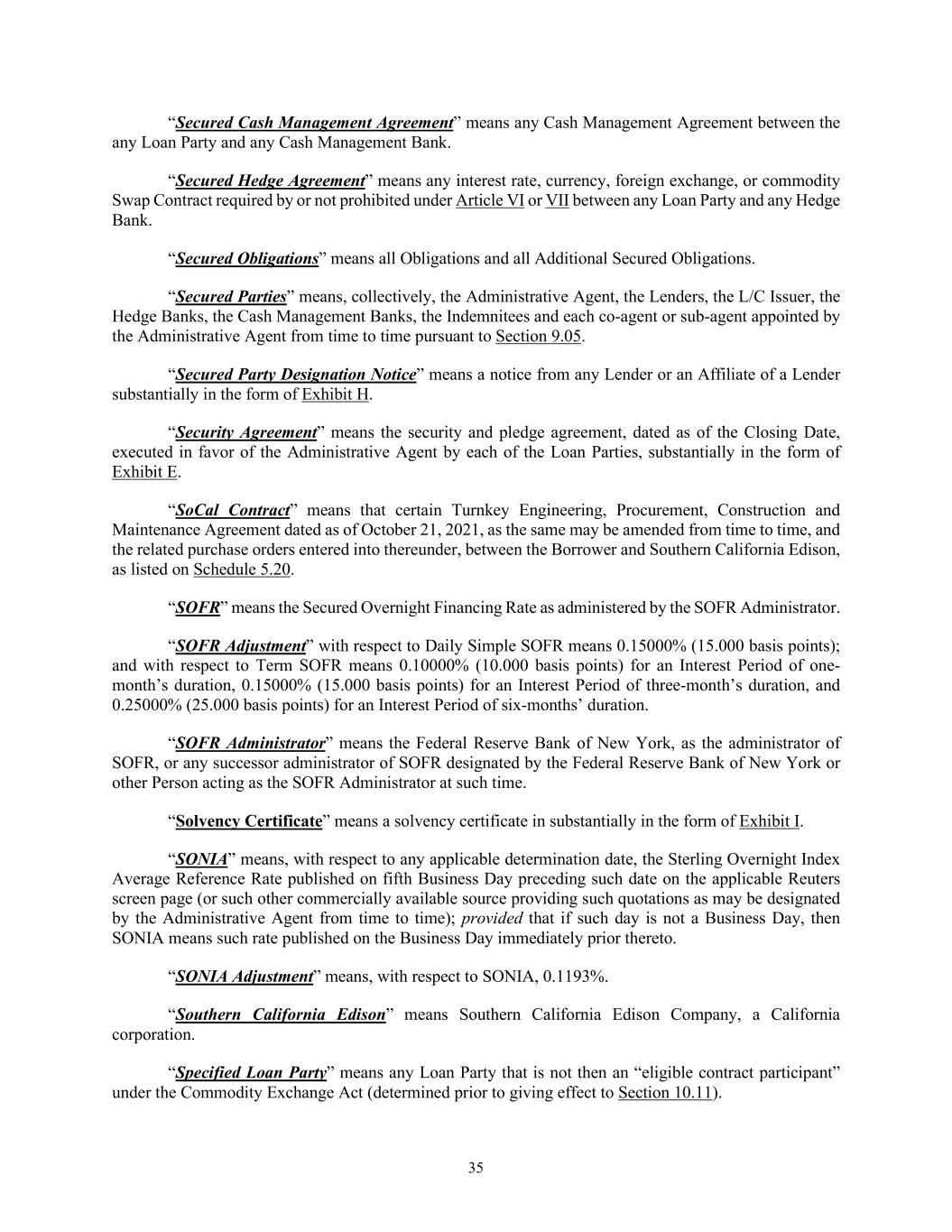 35 “Secured Cash Management Agreement” means any Cash Management Agreement between the any Loan Party and any Cash Management Bank. “Secured Hedge Agreement” means any interest rate, currency, foreign exchange, or commodity Swap Contract required by or not prohibited under Article VI or VII between any Loan Party and any Hedge Bank. “Secured Obligations” means all Obligations and all Additional Secured Obligations. “Secured Parties” means, collectively, the Administrative Agent, the Lenders, the L/C Issuer, the Hedge Banks, the Cash Management Banks, the Indemnitees and each co-agent or sub-agent appointed by the Administrative Agent from time to time pursuant to Section 9.05. “Secured Party Designation Notice” means a notice from any Lender or an Affiliate of a Lender substantially in the form of Exhibit H. “Security Agreement” means the security and pledge agreement, dated as of the Closing Date, executed in favor of the Administrative Agent by each of the Loan Parties, substantially in the form of Exhibit E. “SoCal Contract” means that certain Turnkey Engineering, Procurement, Construction and Maintenance Agreement dated as of October 21, 2021, as the same may be amended from time to time, and the related purchase orders entered into thereunder, between the Borrower and Southern California Edison, as listed on Schedule 5.20. “SOFR” means the Secured Overnight Financing Rate as administered by the SOFR Administrator. “SOFR Adjustment” with respect to Daily Simple SOFR means 0.15000% (15.000 basis points); and with respect to Term SOFR means 0.10000% (10.000 basis points) for an Interest Period of one- month’s duration, 0.15000% (15.000 basis points) for an Interest Period of three-month’s duration, and 0.25000% (25.000 basis points) for an Interest Period of six-months’ duration. “SOFR Administrator” means the Federal Reserve Bank of New York, as the administrator of SOFR, or any successor administrator of SOFR designated by the Federal Reserve Bank of New York or other Person acting as the SOFR Administrator at such time. “Solvency Certificate” means a solvency certificate in substantially in the form of Exhibit I. “SONIA” means, with respect to any applicable determination date, the Sterling Overnight Index Average Reference Rate published on fifth Business Day preceding such date on the applicable Reuters screen page (or such other commercially available source providing such quotations as may be designated by the Administrative Agent from time to time); provided that if such day is not a Business Day, then SONIA means such rate published on the Business Day immediately prior thereto. “SONIA Adjustment” means, with respect to SONIA, 0.1193%. “Southern California Edison” means Southern California Edison Company, a California corporation. “Specified Loan Party” means any Loan Party that is not then an “eligible contract participant” under the Commodity Exchange Act (determined prior to giving effect to Section 10.11).