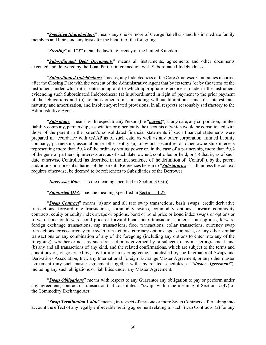 36 “Specified Shareholders” means any one or more of George Sakellaris and his immediate family members and heirs and any trusts for the benefit of the foregoing. “Sterling” and “£” mean the lawful currency of the United Kingdom. “Subordinated Debt Documents” means all instruments, agreements and other documents executed and delivered by the Loan Parties in connection with Subordinated Indebtedness. “Subordinated Indebtedness” means, any Indebtedness of the Core Ameresco Companies incurred after the Closing Date with the consent of the Administrative Agent that by its terms (or by the terms of the instrument under which it is outstanding and to which appropriate reference is made in the instrument evidencing such Subordinated Indebtedness) (a) is subordinated in right of payment to the prior payment of the Obligations and (b) contains other terms, including without limitation, standstill, interest rate, maturity and amortization, and insolvency-related provisions, in all respects reasonably satisfactory to the Administrative Agent. “Subsidiary” means, with respect to any Person (the “parent”) at any date, any corporation, limited liability company, partnership, association or other entity the accounts of which would be consolidated with those of the parent in the parent’s consolidated financial statements if such financial statements were prepared in accordance with GAAP as of such date, as well as any other corporation, limited liability company, partnership, association or other entity (a) of which securities or other ownership interests representing more than 50% of the ordinary voting power or, in the case of a partnership, more than 50% of the general partnership interests are, as of such date, owned, controlled or held, or (b) that is, as of such date, otherwise Controlled (as described in the first sentence of the definition of “Control”), by the parent and/or one or more subsidiaries of the parent. References herein to “Subsidiaries” shall, unless the context requires otherwise, be deemed to be references to Subsidiaries of the Borrower. “Successor Rate” has the meaning specified in Section 3.03(b). “Supported QFC” has the meaning specified in Section 11.22. “Swap Contract” means (a) any and all rate swap transactions, basis swaps, credit derivative transactions, forward rate transactions, commodity swaps, commodity options, forward commodity contracts, equity or equity index swaps or options, bond or bond price or bond index swaps or options or forward bond or forward bond price or forward bond index transactions, interest rate options, forward foreign exchange transactions, cap transactions, floor transactions, collar transactions, currency swap transactions, cross-currency rate swap transactions, currency options, spot contracts, or any other similar transactions or any combination of any of the foregoing (including any options to enter into any of the foregoing), whether or not any such transaction is governed by or subject to any master agreement, and (b) any and all transactions of any kind, and the related confirmations, which are subject to the terms and conditions of, or governed by, any form of master agreement published by the International Swaps and Derivatives Association, Inc., any International Foreign Exchange Master Agreement, or any other master agreement (any such master agreement, together with any related schedules, a “Master Agreement”), including any such obligations or liabilities under any Master Agreement. “Swap Obligations” means with respect to any Guarantor any obligation to pay or perform under any agreement, contract or transaction that constitutes a “swap” within the meaning of Section 1a(47) of the Commodity Exchange Act. “Swap Termination Value” means, in respect of any one or more Swap Contracts, after taking into account the effect of any legally enforceable netting agreement relating to such Swap Contracts, (a) for any