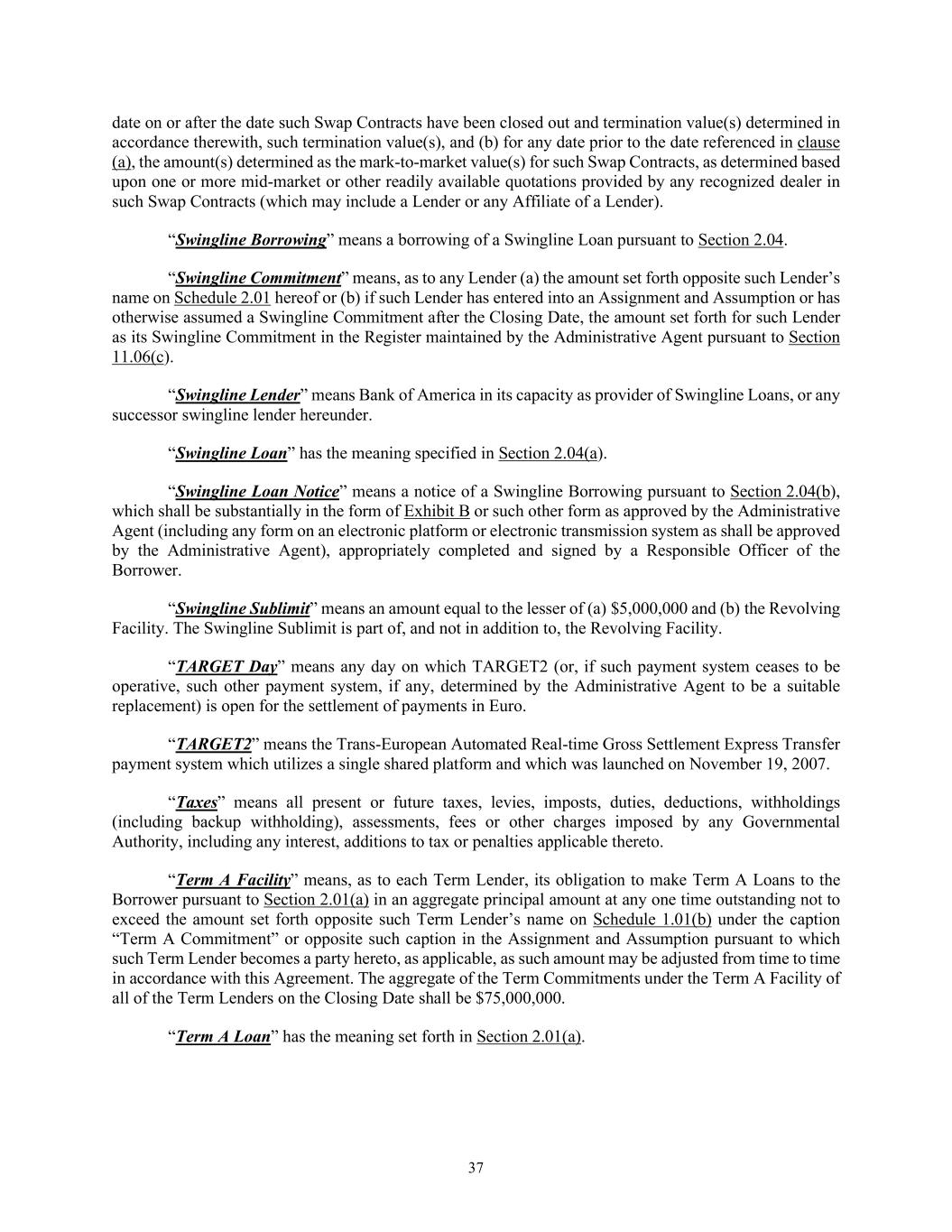 37 date on or after the date such Swap Contracts have been closed out and termination value(s) determined in accordance therewith, such termination value(s), and (b) for any date prior to the date referenced in clause (a), the amount(s) determined as the mark-to-market value(s) for such Swap Contracts, as determined based upon one or more mid-market or other readily available quotations provided by any recognized dealer in such Swap Contracts (which may include a Lender or any Affiliate of a Lender). “Swingline Borrowing” means a borrowing of a Swingline Loan pursuant to Section 2.04. “Swingline Commitment” means, as to any Lender (a) the amount set forth opposite such Lender’s name on Schedule 2.01 hereof or (b) if such Lender has entered into an Assignment and Assumption or has otherwise assumed a Swingline Commitment after the Closing Date, the amount set forth for such Lender as its Swingline Commitment in the Register maintained by the Administrative Agent pursuant to Section 11.06(c). “Swingline Lender” means Bank of America in its capacity as provider of Swingline Loans, or any successor swingline lender hereunder. “Swingline Loan” has the meaning specified in Section 2.04(a). “Swingline Loan Notice” means a notice of a Swingline Borrowing pursuant to Section 2.04(b), which shall be substantially in the form of Exhibit B or such other form as approved by the Administrative Agent (including any form on an electronic platform or electronic transmission system as shall be approved by the Administrative Agent), appropriately completed and signed by a Responsible Officer of the Borrower. “Swingline Sublimit” means an amount equal to the lesser of (a) $5,000,000 and (b) the Revolving Facility. The Swingline Sublimit is part of, and not in addition to, the Revolving Facility. “TARGET Day” means any day on which TARGET2 (or, if such payment system ceases to be operative, such other payment system, if any, determined by the Administrative Agent to be a suitable replacement) is open for the settlement of payments in Euro. “TARGET2” means the Trans-European Automated Real-time Gross Settlement Express Transfer payment system which utilizes a single shared platform and which was launched on November 19, 2007. “Taxes” means all present or future taxes, levies, imposts, duties, deductions, withholdings (including backup withholding), assessments, fees or other charges imposed by any Governmental Authority, including any interest, additions to tax or penalties applicable thereto. “Term A Facility” means, as to each Term Lender, its obligation to make Term A Loans to the Borrower pursuant to Section 2.01(a) in an aggregate principal amount at any one time outstanding not to exceed the amount set forth opposite such Term Lender’s name on Schedule 1.01(b) under the caption “Term A Commitment” or opposite such caption in the Assignment and Assumption pursuant to which such Term Lender becomes a party hereto, as applicable, as such amount may be adjusted from time to time in accordance with this Agreement. The aggregate of the Term Commitments under the Term A Facility of all of the Term Lenders on the Closing Date shall be $75,000,000. “Term A Loan” has the meaning set forth in Section 2.01(a).