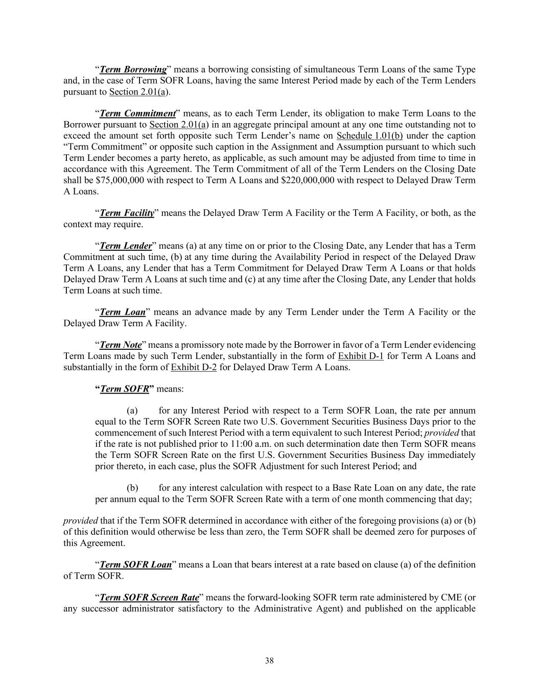 38 “Term Borrowing” means a borrowing consisting of simultaneous Term Loans of the same Type and, in the case of Term SOFR Loans, having the same Interest Period made by each of the Term Lenders pursuant to Section 2.01(a). “Term Commitment” means, as to each Term Lender, its obligation to make Term Loans to the Borrower pursuant to Section 2.01(a) in an aggregate principal amount at any one time outstanding not to exceed the amount set forth opposite such Term Lender’s name on Schedule 1.01(b) under the caption “Term Commitment” or opposite such caption in the Assignment and Assumption pursuant to which such Term Lender becomes a party hereto, as applicable, as such amount may be adjusted from time to time in accordance with this Agreement. The Term Commitment of all of the Term Lenders on the Closing Date shall be $75,000,000 with respect to Term A Loans and $220,000,000 with respect to Delayed Draw Term A Loans. “Term Facility” means the Delayed Draw Term A Facility or the Term A Facility, or both, as the context may require. “Term Lender” means (a) at any time on or prior to the Closing Date, any Lender that has a Term Commitment at such time, (b) at any time during the Availability Period in respect of the Delayed Draw Term A Loans, any Lender that has a Term Commitment for Delayed Draw Term A Loans or that holds Delayed Draw Term A Loans at such time and (c) at any time after the Closing Date, any Lender that holds Term Loans at such time. “Term Loan” means an advance made by any Term Lender under the Term A Facility or the Delayed Draw Term A Facility. “Term Note” means a promissory note made by the Borrower in favor of a Term Lender evidencing Term Loans made by such Term Lender, substantially in the form of Exhibit D-1 for Term A Loans and substantially in the form of Exhibit D-2 for Delayed Draw Term A Loans. “Term SOFR” means: (a) for any Interest Period with respect to a Term SOFR Loan, the rate per annum equal to the Term SOFR Screen Rate two U.S. Government Securities Business Days prior to the commencement of such Interest Period with a term equivalent to such Interest Period; provided that if the rate is not published prior to 11:00 a.m. on such determination date then Term SOFR means the Term SOFR Screen Rate on the first U.S. Government Securities Business Day immediately prior thereto, in each case, plus the SOFR Adjustment for such Interest Period; and (b) for any interest calculation with respect to a Base Rate Loan on any date, the rate per annum equal to the Term SOFR Screen Rate with a term of one month commencing that day; provided that if the Term SOFR determined in accordance with either of the foregoing provisions (a) or (b) of this definition would otherwise be less than zero, the Term SOFR shall be deemed zero for purposes of this Agreement. “Term SOFR Loan” means a Loan that bears interest at a rate based on clause (a) of the definition of Term SOFR. “Term SOFR Screen Rate” means the forward-looking SOFR term rate administered by CME (or any successor administrator satisfactory to the Administrative Agent) and published on the applicable