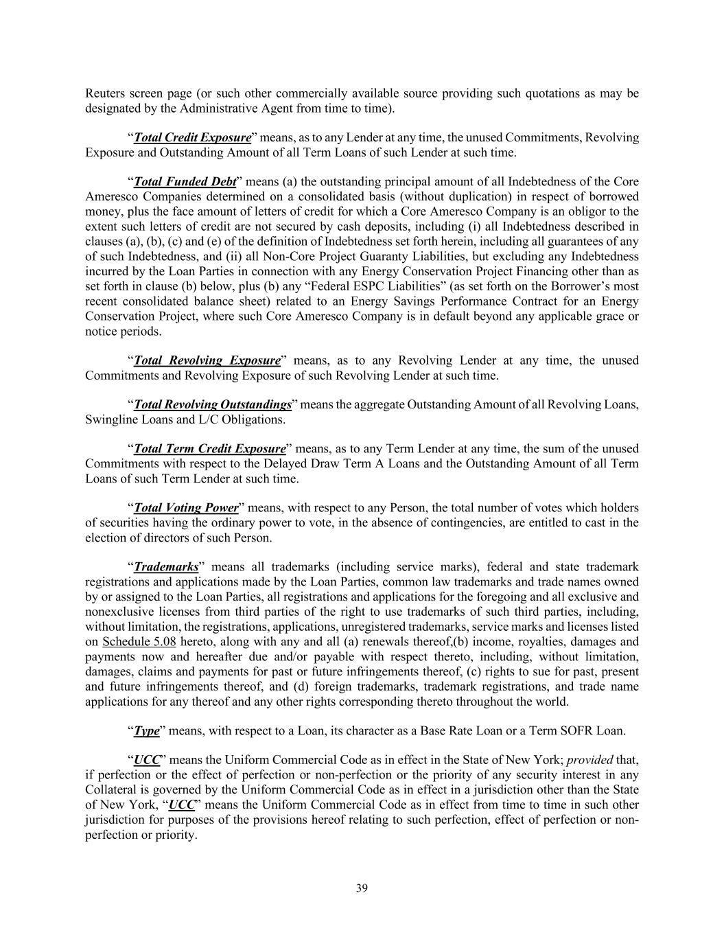 39 Reuters screen page (or such other commercially available source providing such quotations as may be designated by the Administrative Agent from time to time). “Total Credit Exposure” means, as to any Lender at any time, the unused Commitments, Revolving Exposure and Outstanding Amount of all Term Loans of such Lender at such time. “Total Funded Debt” means (a) the outstanding principal amount of all Indebtedness of the Core Ameresco Companies determined on a consolidated basis (without duplication) in respect of borrowed money, plus the face amount of letters of credit for which a Core Ameresco Company is an obligor to the extent such letters of credit are not secured by cash deposits, including (i) all Indebtedness described in clauses (a), (b), (c) and (e) of the definition of Indebtedness set forth herein, including all guarantees of any of such Indebtedness, and (ii) all Non-Core Project Guaranty Liabilities, but excluding any Indebtedness incurred by the Loan Parties in connection with any Energy Conservation Project Financing other than as set forth in clause (b) below, plus (b) any “Federal ESPC Liabilities” (as set forth on the Borrower’s most recent consolidated balance sheet) related to an Energy Savings Performance Contract for an Energy Conservation Project, where such Core Ameresco Company is in default beyond any applicable grace or notice periods. “Total Revolving Exposure” means, as to any Revolving Lender at any time, the unused Commitments and Revolving Exposure of such Revolving Lender at such time. “Total Revolving Outstandings” means the aggregate Outstanding Amount of all Revolving Loans, Swingline Loans and L/C Obligations. “Total Term Credit Exposure” means, as to any Term Lender at any time, the sum of the unused Commitments with respect to the Delayed Draw Term A Loans and the Outstanding Amount of all Term Loans of such Term Lender at such time. “Total Voting Power” means, with respect to any Person, the total number of votes which holders of securities having the ordinary power to vote, in the absence of contingencies, are entitled to cast in the election of directors of such Person. “Trademarks” means all trademarks (including service marks), federal and state trademark registrations and applications made by the Loan Parties, common law trademarks and trade names owned by or assigned to the Loan Parties, all registrations and applications for the foregoing and all exclusive and nonexclusive licenses from third parties of the right to use trademarks of such third parties, including, without limitation, the registrations, applications, unregistered trademarks, service marks and licenses listed on Schedule 5.08 hereto, along with any and all (a) renewals thereof,(b) income, royalties, damages and payments now and hereafter due and/or payable with respect thereto, including, without limitation, damages, claims and payments for past or future infringements thereof, (c) rights to sue for past, present and future infringements thereof, and (d) foreign trademarks, trademark registrations, and trade name applications for any thereof and any other rights corresponding thereto throughout the world. “Type” means, with respect to a Loan, its character as a Base Rate Loan or a Term SOFR Loan. “UCC” means the Uniform Commercial Code as in effect in the State of New York; provided that, if perfection or the effect of perfection or non-perfection or the priority of any security interest in any Collateral is governed by the Uniform Commercial Code as in effect in a jurisdiction other than the State of New York, “UCC” means the Uniform Commercial Code as in effect from time to time in such other jurisdiction for purposes of the provisions hereof relating to such perfection, effect of perfection or non- perfection or priority.