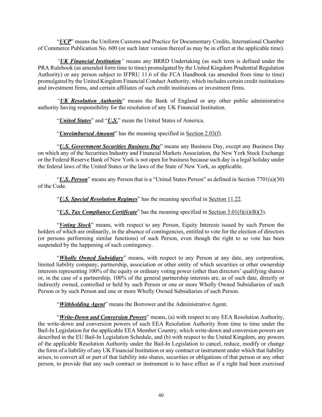 40 “UCP” means the Uniform Customs and Practice for Documentary Credits, International Chamber of Commerce Publication No. 600 (or such later version thereof as may be in effect at the applicable time). “UK Financial Institution” means any BRRD Undertaking (as such term is defined under the PRA Rulebook (as amended form time to time) promulgated by the United Kingdom Prudential Regulation Authority) or any person subject to IFPRU 11.6 of the FCA Handbook (as amended from time to time) promulgated by the United Kingdom Financial Conduct Authority, which includes certain credit institutions and investment firms, and certain affiliates of such credit institutions or investment firms. “UK Resolution Authority” means the Bank of England or any other public administrative authority having responsibility for the resolution of any UK Financial Institution. “United States” and “U.S.” mean the United States of America. “Unreimbursed Amount” has the meaning specified in Section 2.03(f). “U.S. Government Securities Business Day” means any Business Day, except any Business Day on which any of the Securities Industry and Financial Markets Association, the New York Stock Exchange or the Federal Reserve Bank of New York is not open for business because such day is a legal holiday under the federal laws of the United States or the laws of the State of New York, as applicable. “U.S. Person” means any Person that is a “United States Person” as defined in Section 7701(a)(30) of the Code. “U.S. Special Resolution Regimes” has the meaning specified in Section 11.22. “U.S. Tax Compliance Certificate” has the meaning specified in Section 3.01(f)(ii)(B)(3). “Voting Stock” means, with respect to any Person, Equity Interests issued by such Person the holders of which are ordinarily, in the absence of contingencies, entitled to vote for the election of directors (or persons performing similar functions) of such Person, even though the right to so vote has been suspended by the happening of such contingency. “Wholly Owned Subsidiary” means, with respect to any Person at any date, any corporation, limited liability company, partnership, association or other entity of which securities or other ownership interests representing 100% of the equity or ordinary voting power (other than directors’ qualifying shares) or, in the case of a partnership, 100% of the general partnership interests are, as of such date, directly or indirectly owned, controlled or held by such Person or one or more Wholly Owned Subsidiaries of such Person or by such Person and one or more Wholly Owned Subsidiaries of such Person. “Withholding Agent” means the Borrower and the Administrative Agent. “Write-Down and Conversion Powers” means, (a) with respect to any EEA Resolution Authority, the write-down and conversion powers of such EEA Resolution Authority from time to time under the Bail-In Legislation for the applicable EEA Member Country, which write-down and conversion powers are described in the EU Bail-In Legislation Schedule, and (b) with respect to the United Kingdom, any powers of the applicable Resolution Authority under the Bail-In Legislation to cancel, reduce, modify or change the form of a liability of any UK Financial Institution or any contract or instrument under which that liability arises, to convert all or part of that liability into shares, securities or obligations of that person or any other person, to provide that any such contract or instrument is to have effect as if a right had been exercised
