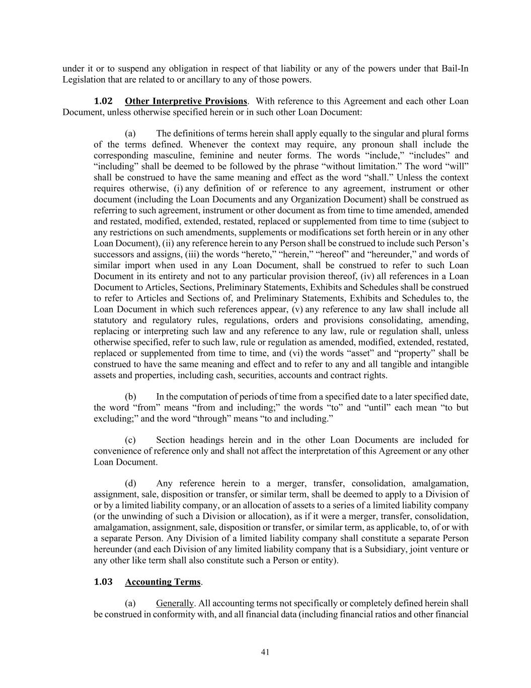 41 under it or to suspend any obligation in respect of that liability or any of the powers under that Bail-In Legislation that are related to or ancillary to any of those powers. 1.02 Other Interpretive Provisions. With reference to this Agreement and each other Loan Document, unless otherwise specified herein or in such other Loan Document: (a) The definitions of terms herein shall apply equally to the singular and plural forms of the terms defined. Whenever the context may require, any pronoun shall include the corresponding masculine, feminine and neuter forms. The words “include,” “includes” and “including” shall be deemed to be followed by the phrase “without limitation.” The word “will” shall be construed to have the same meaning and effect as the word “shall.” Unless the context requires otherwise, (i) any definition of or reference to any agreement, instrument or other document (including the Loan Documents and any Organization Document) shall be construed as referring to such agreement, instrument or other document as from time to time amended, amended and restated, modified, extended, restated, replaced or supplemented from time to time (subject to any restrictions on such amendments, supplements or modifications set forth herein or in any other Loan Document), (ii) any reference herein to any Person shall be construed to include such Person’s successors and assigns, (iii) the words “hereto,” “herein,” “hereof” and “hereunder,” and words of similar import when used in any Loan Document, shall be construed to refer to such Loan Document in its entirety and not to any particular provision thereof, (iv) all references in a Loan Document to Articles, Sections, Preliminary Statements, Exhibits and Schedules shall be construed to refer to Articles and Sections of, and Preliminary Statements, Exhibits and Schedules to, the Loan Document in which such references appear, (v) any reference to any law shall include all statutory and regulatory rules, regulations, orders and provisions consolidating, amending, replacing or interpreting such law and any reference to any law, rule or regulation shall, unless otherwise specified, refer to such law, rule or regulation as amended, modified, extended, restated, replaced or supplemented from time to time, and (vi) the words “asset” and “property” shall be construed to have the same meaning and effect and to refer to any and all tangible and intangible assets and properties, including cash, securities, accounts and contract rights. (b) In the computation of periods of time from a specified date to a later specified date, the word “from” means “from and including;” the words “to” and “until” each mean “to but excluding;” and the word “through” means “to and including.” (c) Section headings herein and in the other Loan Documents are included for convenience of reference only and shall not affect the interpretation of this Agreement or any other Loan Document. (d) Any reference herein to a merger, transfer, consolidation, amalgamation, assignment, sale, disposition or transfer, or similar term, shall be deemed to apply to a Division of or by a limited liability company, or an allocation of assets to a series of a limited liability company (or the unwinding of such a Division or allocation), as if it were a merger, transfer, consolidation, amalgamation, assignment, sale, disposition or transfer, or similar term, as applicable, to, of or with a separate Person. Any Division of a limited liability company shall constitute a separate Person hereunder (and each Division of any limited liability company that is a Subsidiary, joint venture or any other like term shall also constitute such a Person or entity). 1.03 Accounting Terms. (a) Generally. All accounting terms not specifically or completely defined herein shall be construed in conformity with, and all financial data (including financial ratios and other financial