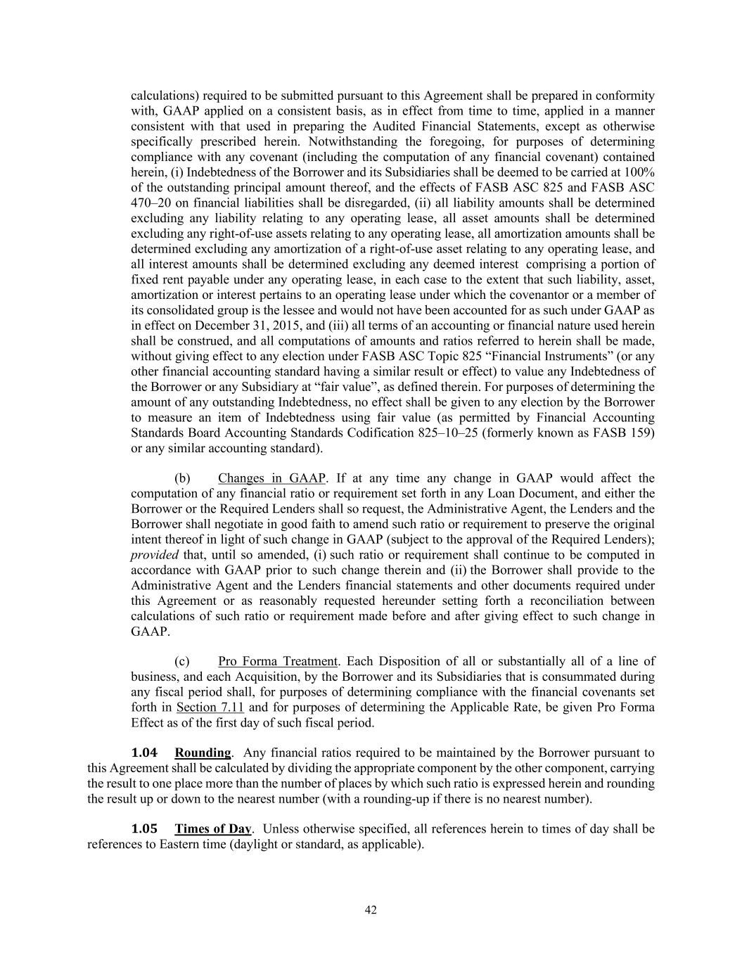 42 calculations) required to be submitted pursuant to this Agreement shall be prepared in conformity with, GAAP applied on a consistent basis, as in effect from time to time, applied in a manner consistent with that used in preparing the Audited Financial Statements, except as otherwise specifically prescribed herein. Notwithstanding the foregoing, for purposes of determining compliance with any covenant (including the computation of any financial covenant) contained herein, (i) Indebtedness of the Borrower and its Subsidiaries shall be deemed to be carried at 100% of the outstanding principal amount thereof, and the effects of FASB ASC 825 and FASB ASC 470–20 on financial liabilities shall be disregarded, (ii) all liability amounts shall be determined excluding any liability relating to any operating lease, all asset amounts shall be determined excluding any right-of-use assets relating to any operating lease, all amortization amounts shall be determined excluding any amortization of a right-of-use asset relating to any operating lease, and all interest amounts shall be determined excluding any deemed interest comprising a portion of fixed rent payable under any operating lease, in each case to the extent that such liability, asset, amortization or interest pertains to an operating lease under which the covenantor or a member of its consolidated group is the lessee and would not have been accounted for as such under GAAP as in effect on December 31, 2015, and (iii) all terms of an accounting or financial nature used herein shall be construed, and all computations of amounts and ratios referred to herein shall be made, without giving effect to any election under FASB ASC Topic 825 “Financial Instruments” (or any other financial accounting standard having a similar result or effect) to value any Indebtedness of the Borrower or any Subsidiary at “fair value”, as defined therein. For purposes of determining the amount of any outstanding Indebtedness, no effect shall be given to any election by the Borrower to measure an item of Indebtedness using fair value (as permitted by Financial Accounting Standards Board Accounting Standards Codification 825–10–25 (formerly known as FASB 159) or any similar accounting standard). (b) Changes in GAAP. If at any time any change in GAAP would affect the computation of any financial ratio or requirement set forth in any Loan Document, and either the Borrower or the Required Lenders shall so request, the Administrative Agent, the Lenders and the Borrower shall negotiate in good faith to amend such ratio or requirement to preserve the original intent thereof in light of such change in GAAP (subject to the approval of the Required Lenders); provided that, until so amended, (i) such ratio or requirement shall continue to be computed in accordance with GAAP prior to such change therein and (ii) the Borrower shall provide to the Administrative Agent and the Lenders financial statements and other documents required under this Agreement or as reasonably requested hereunder setting forth a reconciliation between calculations of such ratio or requirement made before and after giving effect to such change in GAAP. (c) Pro Forma Treatment. Each Disposition of all or substantially all of a line of business, and each Acquisition, by the Borrower and its Subsidiaries that is consummated during any fiscal period shall, for purposes of determining compliance with the financial covenants set forth in Section 7.11 and for purposes of determining the Applicable Rate, be given Pro Forma Effect as of the first day of such fiscal period. 1.04 Rounding. Any financial ratios required to be maintained by the Borrower pursuant to this Agreement shall be calculated by dividing the appropriate component by the other component, carrying the result to one place more than the number of places by which such ratio is expressed herein and rounding the result up or down to the nearest number (with a rounding-up if there is no nearest number). 1.05 Times of Day. Unless otherwise specified, all references herein to times of day shall be references to Eastern time (daylight or standard, as applicable).