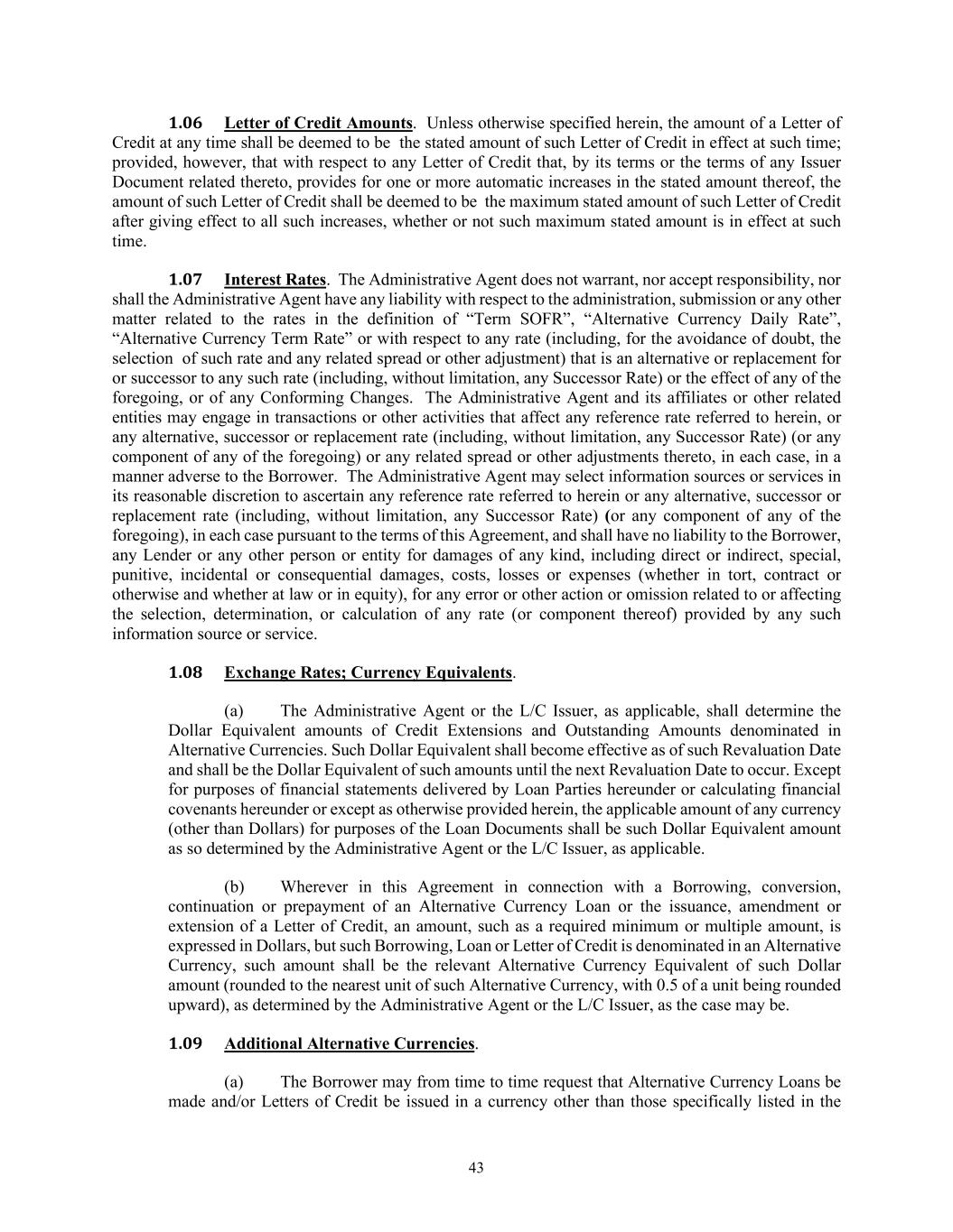 43 1.06 Letter of Credit Amounts. Unless otherwise specified herein, the amount of a Letter of Credit at any time shall be deemed to be the stated amount of such Letter of Credit in effect at such time; provided, however, that with respect to any Letter of Credit that, by its terms or the terms of any Issuer Document related thereto, provides for one or more automatic increases in the stated amount thereof, the amount of such Letter of Credit shall be deemed to be the maximum stated amount of such Letter of Credit after giving effect to all such increases, whether or not such maximum stated amount is in effect at such time. 1.07 Interest Rates. The Administrative Agent does not warrant, nor accept responsibility, nor shall the Administrative Agent have any liability with respect to the administration, submission or any other matter related to the rates in the definition of “Term SOFR”, “Alternative Currency Daily Rate”, “Alternative Currency Term Rate” or with respect to any rate (including, for the avoidance of doubt, the selection of such rate and any related spread or other adjustment) that is an alternative or replacement for or successor to any such rate (including, without limitation, any Successor Rate) or the effect of any of the foregoing, or of any Conforming Changes. The Administrative Agent and its affiliates or other related entities may engage in transactions or other activities that affect any reference rate referred to herein, or any alternative, successor or replacement rate (including, without limitation, any Successor Rate) (or any component of any of the foregoing) or any related spread or other adjustments thereto, in each case, in a manner adverse to the Borrower. The Administrative Agent may select information sources or services in its reasonable discretion to ascertain any reference rate referred to herein or any alternative, successor or replacement rate (including, without limitation, any Successor Rate) (or any component of any of the foregoing), in each case pursuant to the terms of this Agreement, and shall have no liability to the Borrower, any Lender or any other person or entity for damages of any kind, including direct or indirect, special, punitive, incidental or consequential damages, costs, losses or expenses (whether in tort, contract or otherwise and whether at law or in equity), for any error or other action or omission related to or affecting the selection, determination, or calculation of any rate (or component thereof) provided by any such information source or service. 1.08 Exchange Rates; Currency Equivalents. (a) The Administrative Agent or the L/C Issuer, as applicable, shall determine the Dollar Equivalent amounts of Credit Extensions and Outstanding Amounts denominated in Alternative Currencies. Such Dollar Equivalent shall become effective as of such Revaluation Date and shall be the Dollar Equivalent of such amounts until the next Revaluation Date to occur. Except for purposes of financial statements delivered by Loan Parties hereunder or calculating financial covenants hereunder or except as otherwise provided herein, the applicable amount of any currency (other than Dollars) for purposes of the Loan Documents shall be such Dollar Equivalent amount as so determined by the Administrative Agent or the L/C Issuer, as applicable. (b) Wherever in this Agreement in connection with a Borrowing, conversion, continuation or prepayment of an Alternative Currency Loan or the issuance, amendment or extension of a Letter of Credit, an amount, such as a required minimum or multiple amount, is expressed in Dollars, but such Borrowing, Loan or Letter of Credit is denominated in an Alternative Currency, such amount shall be the relevant Alternative Currency Equivalent of such Dollar amount (rounded to the nearest unit of such Alternative Currency, with 0.5 of a unit being rounded upward), as determined by the Administrative Agent or the L/C Issuer, as the case may be. 1.09 Additional Alternative Currencies. (a) The Borrower may from time to time request that Alternative Currency Loans be made and/or Letters of Credit be issued in a currency other than those specifically listed in the
