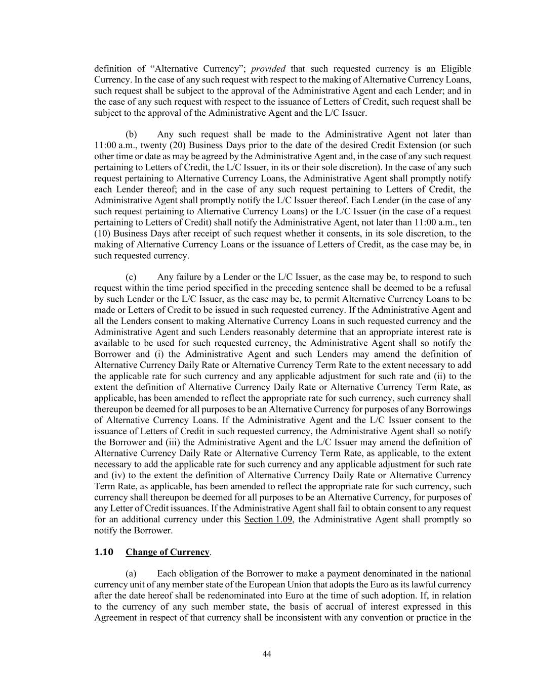 44 definition of “Alternative Currency”; provided that such requested currency is an Eligible Currency. In the case of any such request with respect to the making of Alternative Currency Loans, such request shall be subject to the approval of the Administrative Agent and each Lender; and in the case of any such request with respect to the issuance of Letters of Credit, such request shall be subject to the approval of the Administrative Agent and the L/C Issuer. (b) Any such request shall be made to the Administrative Agent not later than 11:00 a.m., twenty (20) Business Days prior to the date of the desired Credit Extension (or such other time or date as may be agreed by the Administrative Agent and, in the case of any such request pertaining to Letters of Credit, the L/C Issuer, in its or their sole discretion). In the case of any such request pertaining to Alternative Currency Loans, the Administrative Agent shall promptly notify each Lender thereof; and in the case of any such request pertaining to Letters of Credit, the Administrative Agent shall promptly notify the L/C Issuer thereof. Each Lender (in the case of any such request pertaining to Alternative Currency Loans) or the L/C Issuer (in the case of a request pertaining to Letters of Credit) shall notify the Administrative Agent, not later than 11:00 a.m., ten (10) Business Days after receipt of such request whether it consents, in its sole discretion, to the making of Alternative Currency Loans or the issuance of Letters of Credit, as the case may be, in such requested currency. (c) Any failure by a Lender or the L/C Issuer, as the case may be, to respond to such request within the time period specified in the preceding sentence shall be deemed to be a refusal by such Lender or the L/C Issuer, as the case may be, to permit Alternative Currency Loans to be made or Letters of Credit to be issued in such requested currency. If the Administrative Agent and all the Lenders consent to making Alternative Currency Loans in such requested currency and the Administrative Agent and such Lenders reasonably determine that an appropriate interest rate is available to be used for such requested currency, the Administrative Agent shall so notify the Borrower and (i) the Administrative Agent and such Lenders may amend the definition of Alternative Currency Daily Rate or Alternative Currency Term Rate to the extent necessary to add the applicable rate for such currency and any applicable adjustment for such rate and (ii) to the extent the definition of Alternative Currency Daily Rate or Alternative Currency Term Rate, as applicable, has been amended to reflect the appropriate rate for such currency, such currency shall thereupon be deemed for all purposes to be an Alternative Currency for purposes of any Borrowings of Alternative Currency Loans. If the Administrative Agent and the L/C Issuer consent to the issuance of Letters of Credit in such requested currency, the Administrative Agent shall so notify the Borrower and (iii) the Administrative Agent and the L/C Issuer may amend the definition of Alternative Currency Daily Rate or Alternative Currency Term Rate, as applicable, to the extent necessary to add the applicable rate for such currency and any applicable adjustment for such rate and (iv) to the extent the definition of Alternative Currency Daily Rate or Alternative Currency Term Rate, as applicable, has been amended to reflect the appropriate rate for such currency, such currency shall thereupon be deemed for all purposes to be an Alternative Currency, for purposes of any Letter of Credit issuances. If the Administrative Agent shall fail to obtain consent to any request for an additional currency under this Section 1.09, the Administrative Agent shall promptly so notify the Borrower. 1.10 Change of Currency. (a) Each obligation of the Borrower to make a payment denominated in the national currency unit of any member state of the European Union that adopts the Euro as its lawful currency after the date hereof shall be redenominated into Euro at the time of such adoption. If, in relation to the currency of any such member state, the basis of accrual of interest expressed in this Agreement in respect of that currency shall be inconsistent with any convention or practice in the