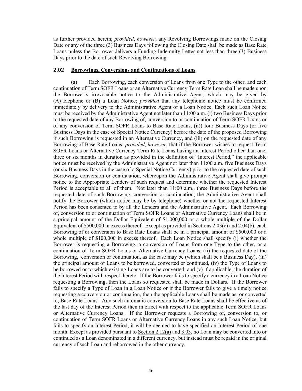 46 as further provided herein; provided, however, any Revolving Borrowings made on the Closing Date or any of the three (3) Business Days following the Closing Date shall be made as Base Rate Loans unless the Borrower delivers a Funding Indemnity Letter not less than three (3) Business Days prior to the date of such Revolving Borrowing. 2.02 Borrowings, Conversions and Continuations of Loans. (a) Each Borrowing, each conversion of Loans from one Type to the other, and each continuation of Term SOFR Loans or an Alternative Currency Term Rate Loan shall be made upon the Borrower’s irrevocable notice to the Administrative Agent, which may be given by (A) telephone or (B) a Loan Notice; provided that any telephonic notice must be confirmed immediately by delivery to the Administrative Agent of a Loan Notice. Each such Loan Notice must be received by the Administrative Agent not later than 11:00 a.m. (i) two Business Days prior to the requested date of any Borrowing of, conversion to or continuation of Term SOFR Loans or of any conversion of Term SOFR Loans to Base Rate Loans, (ii)) four Business Days (or five Business Days in the case of Special Notice Currency) before the date of the proposed Borrowing if such Borrowing is requested in an Alternative Currency, and (iii) on the requested date of any Borrowing of Base Rate Loans; provided, however, that if the Borrower wishes to request Term SOFR Loans or Alternative Currency Term Rate Loans having an Interest Period other than one, three or six months in duration as provided in the definition of “Interest Period,” the applicable notice must be received by the Administrative Agent not later than 11:00 a.m. five Business Days (or six Business Days in the case of a Special Notice Currency) prior to the requested date of such Borrowing, conversion or continuation, whereupon the Administrative Agent shall give prompt notice to the Appropriate Lenders of such request and determine whether the requested Interest Period is acceptable to all of them. Not later than 11:00 a.m., three Business Days before the requested date of such Borrowing, conversion or continuation, the Administrative Agent shall notify the Borrower (which notice may be by telephone) whether or not the requested Interest Period has been consented to by all the Lenders and the Administrative Agent. Each Borrowing of, conversion to or continuation of Term SOFR Loans or Alternative Currency Loans shall be in a principal amount of the Dollar Equivalent of $1,000,000 or a whole multiple of the Dollar Equivalent of $500,000 in excess thereof. Except as provided in Sections 2.03(c) and 2.04(b), each Borrowing of or conversion to Base Rate Loans shall be in a principal amount of $500,000 or a whole multiple of $100,000 in excess thereof. Each Loan Notice shall specify (i) whether the Borrower is requesting a Borrowing, a conversion of Loans from one Type to the other, or a continuation of Term SOFR Loans or Alternative Currency Loans, (ii) the requested date of the Borrowing, conversion or continuation, as the case may be (which shall be a Business Day), (iii) the principal amount of Loans to be borrowed, converted or continued, (iv) the Type of Loans to be borrowed or to which existing Loans are to be converted, and (v) if applicable, the duration of the Interest Period with respect thereto. If the Borrower fails to specify a currency in a Loan Notice requesting a Borrowing, then the Loans so requested shall be made in Dollars. If the Borrower fails to specify a Type of Loan in a Loan Notice or if the Borrower fails to give a timely notice requesting a conversion or continuation, then the applicable Loans shall be made as, or converted to, Base Rate Loans. Any such automatic conversion to Base Rate Loans shall be effective as of the last day of the Interest Period then in effect with respect to the applicable Term SOFR Loans or Alternative Currency Loans. If the Borrower requests a Borrowing of, conversion to, or continuation of Term SOFR Loans or Alternative Currency Loans in any such Loan Notice, but fails to specify an Interest Period, it will be deemed to have specified an Interest Period of one month. Except as provided pursuant to Section 2.12(a) and 3.03, no Loan may be converted into or continued as a Loan denominated in a different currency, but instead must be repaid in the original currency of such Loan and reborrowed in the other currency.