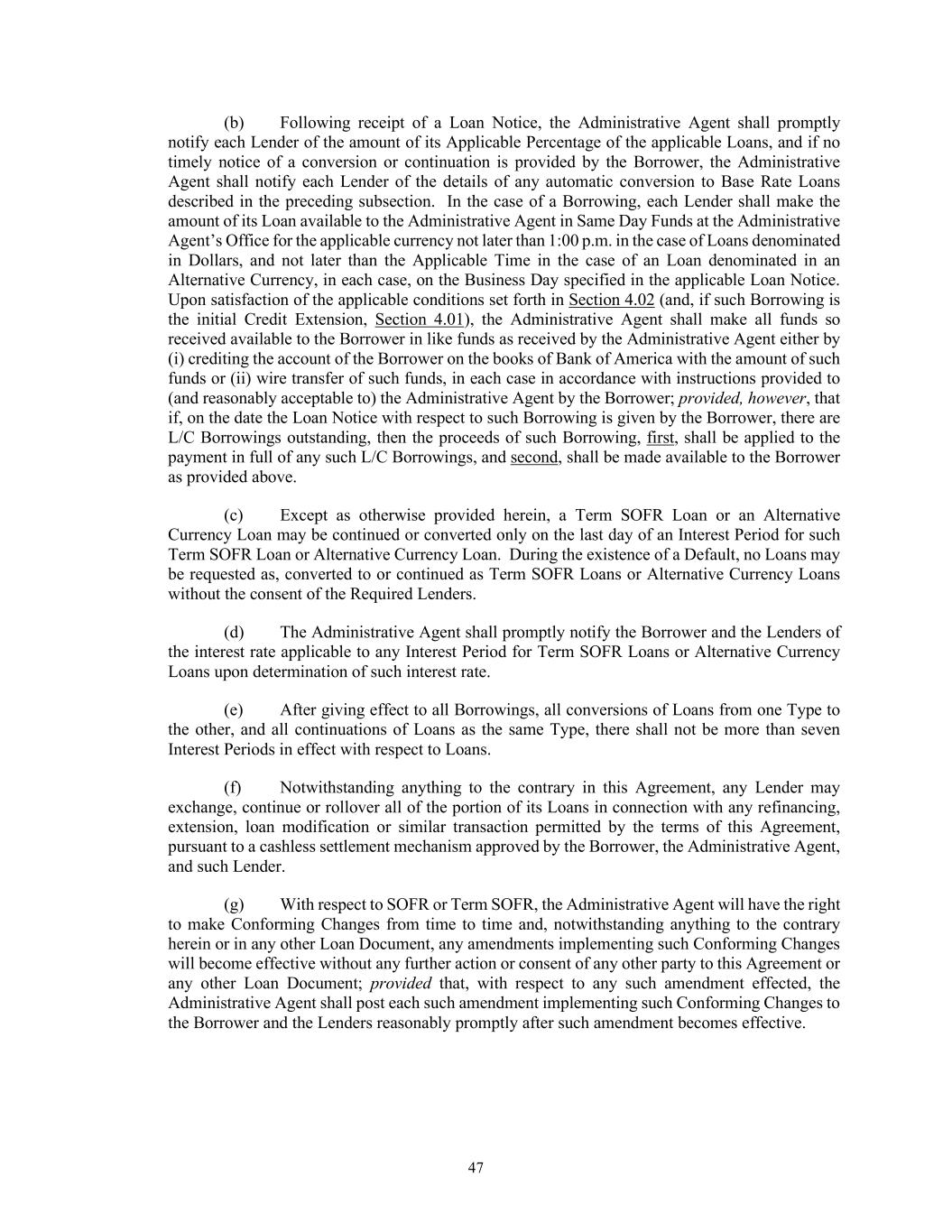 47 (b) Following receipt of a Loan Notice, the Administrative Agent shall promptly notify each Lender of the amount of its Applicable Percentage of the applicable Loans, and if no timely notice of a conversion or continuation is provided by the Borrower, the Administrative Agent shall notify each Lender of the details of any automatic conversion to Base Rate Loans described in the preceding subsection. In the case of a Borrowing, each Lender shall make the amount of its Loan available to the Administrative Agent in Same Day Funds at the Administrative Agent’s Office for the applicable currency not later than 1:00 p.m. in the case of Loans denominated in Dollars, and not later than the Applicable Time in the case of an Loan denominated in an Alternative Currency, in each case, on the Business Day specified in the applicable Loan Notice. Upon satisfaction of the applicable conditions set forth in Section 4.02 (and, if such Borrowing is the initial Credit Extension, Section 4.01), the Administrative Agent shall make all funds so received available to the Borrower in like funds as received by the Administrative Agent either by (i) crediting the account of the Borrower on the books of Bank of America with the amount of such funds or (ii) wire transfer of such funds, in each case in accordance with instructions provided to (and reasonably acceptable to) the Administrative Agent by the Borrower; provided, however, that if, on the date the Loan Notice with respect to such Borrowing is given by the Borrower, there are L/C Borrowings outstanding, then the proceeds of such Borrowing, first, shall be applied to the payment in full of any such L/C Borrowings, and second, shall be made available to the Borrower as provided above. (c) Except as otherwise provided herein, a Term SOFR Loan or an Alternative Currency Loan may be continued or converted only on the last day of an Interest Period for such Term SOFR Loan or Alternative Currency Loan. During the existence of a Default, no Loans may be requested as, converted to or continued as Term SOFR Loans or Alternative Currency Loans without the consent of the Required Lenders. (d) The Administrative Agent shall promptly notify the Borrower and the Lenders of the interest rate applicable to any Interest Period for Term SOFR Loans or Alternative Currency Loans upon determination of such interest rate. (e) After giving effect to all Borrowings, all conversions of Loans from one Type to the other, and all continuations of Loans as the same Type, there shall not be more than seven Interest Periods in effect with respect to Loans. (f) Notwithstanding anything to the contrary in this Agreement, any Lender may exchange, continue or rollover all of the portion of its Loans in connection with any refinancing, extension, loan modification or similar transaction permitted by the terms of this Agreement, pursuant to a cashless settlement mechanism approved by the Borrower, the Administrative Agent, and such Lender. (g) With respect to SOFR or Term SOFR, the Administrative Agent will have the right to make Conforming Changes from time to time and, notwithstanding anything to the contrary herein or in any other Loan Document, any amendments implementing such Conforming Changes will become effective without any further action or consent of any other party to this Agreement or any other Loan Document; provided that, with respect to any such amendment effected, the Administrative Agent shall post each such amendment implementing such Conforming Changes to the Borrower and the Lenders reasonably promptly after such amendment becomes effective.