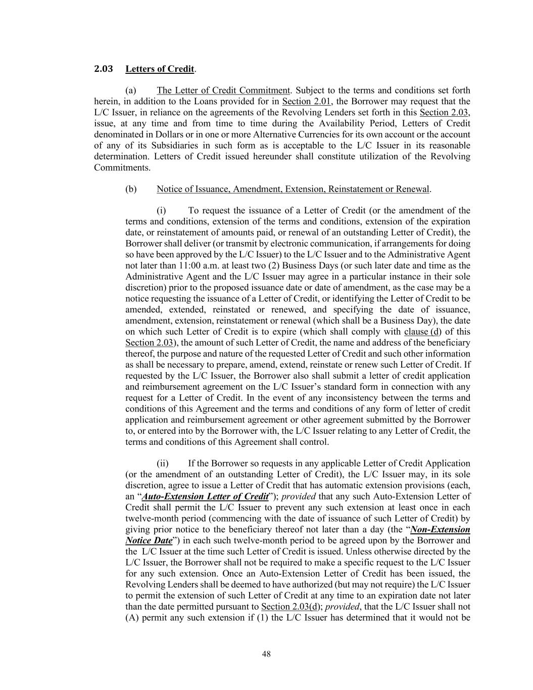 48 2.03 Letters of Credit. (a) The Letter of Credit Commitment. Subject to the terms and conditions set forth herein, in addition to the Loans provided for in Section 2.01, the Borrower may request that the L/C Issuer, in reliance on the agreements of the Revolving Lenders set forth in this Section 2.03, issue, at any time and from time to time during the Availability Period, Letters of Credit denominated in Dollars or in one or more Alternative Currencies for its own account or the account of any of its Subsidiaries in such form as is acceptable to the L/C Issuer in its reasonable determination. Letters of Credit issued hereunder shall constitute utilization of the Revolving Commitments. (b) Notice of Issuance, Amendment, Extension, Reinstatement or Renewal. (i) To request the issuance of a Letter of Credit (or the amendment of the terms and conditions, extension of the terms and conditions, extension of the expiration date, or reinstatement of amounts paid, or renewal of an outstanding Letter of Credit), the Borrower shall deliver (or transmit by electronic communication, if arrangements for doing so have been approved by the L/C Issuer) to the L/C Issuer and to the Administrative Agent not later than 11:00 a.m. at least two (2) Business Days (or such later date and time as the Administrative Agent and the L/C Issuer may agree in a particular instance in their sole discretion) prior to the proposed issuance date or date of amendment, as the case may be a notice requesting the issuance of a Letter of Credit, or identifying the Letter of Credit to be amended, extended, reinstated or renewed, and specifying the date of issuance, amendment, extension, reinstatement or renewal (which shall be a Business Day), the date on which such Letter of Credit is to expire (which shall comply with clause (d) of this Section 2.03), the amount of such Letter of Credit, the name and address of the beneficiary thereof, the purpose and nature of the requested Letter of Credit and such other information as shall be necessary to prepare, amend, extend, reinstate or renew such Letter of Credit. If requested by the L/C Issuer, the Borrower also shall submit a letter of credit application and reimbursement agreement on the L/C Issuer’s standard form in connection with any request for a Letter of Credit. In the event of any inconsistency between the terms and conditions of this Agreement and the terms and conditions of any form of letter of credit application and reimbursement agreement or other agreement submitted by the Borrower to, or entered into by the Borrower with, the L/C Issuer relating to any Letter of Credit, the terms and conditions of this Agreement shall control. (ii) If the Borrower so requests in any applicable Letter of Credit Application (or the amendment of an outstanding Letter of Credit), the L/C Issuer may, in its sole discretion, agree to issue a Letter of Credit that has automatic extension provisions (each, an “Auto-Extension Letter of Credit”); provided that any such Auto-Extension Letter of Credit shall permit the L/C Issuer to prevent any such extension at least once in each twelve-month period (commencing with the date of issuance of such Letter of Credit) by giving prior notice to the beneficiary thereof not later than a day (the “Non-Extension Notice Date”) in each such twelve-month period to be agreed upon by the Borrower and the L/C Issuer at the time such Letter of Credit is issued. Unless otherwise directed by the L/C Issuer, the Borrower shall not be required to make a specific request to the L/C Issuer for any such extension. Once an Auto-Extension Letter of Credit has been issued, the Revolving Lenders shall be deemed to have authorized (but may not require) the L/C Issuer to permit the extension of such Letter of Credit at any time to an expiration date not later than the date permitted pursuant to Section 2.03(d); provided, that the L/C Issuer shall not (A) permit any such extension if (1) the L/C Issuer has determined that it would not be
