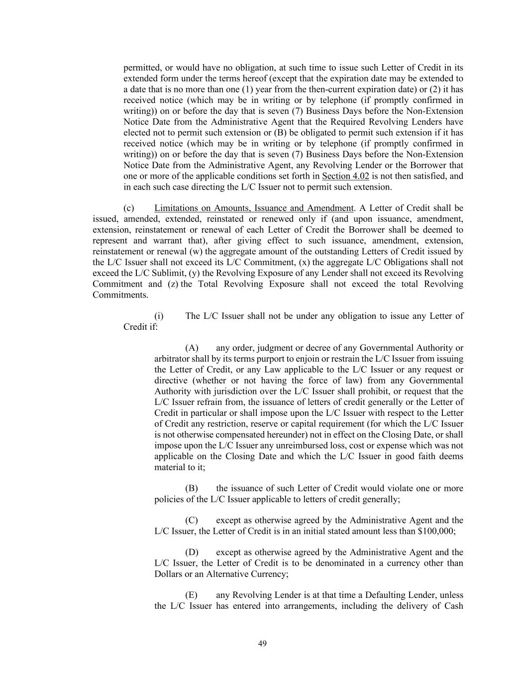 49 permitted, or would have no obligation, at such time to issue such Letter of Credit in its extended form under the terms hereof (except that the expiration date may be extended to a date that is no more than one (1) year from the then-current expiration date) or (2) it has received notice (which may be in writing or by telephone (if promptly confirmed in writing)) on or before the day that is seven (7) Business Days before the Non-Extension Notice Date from the Administrative Agent that the Required Revolving Lenders have elected not to permit such extension or (B) be obligated to permit such extension if it has received notice (which may be in writing or by telephone (if promptly confirmed in writing)) on or before the day that is seven (7) Business Days before the Non-Extension Notice Date from the Administrative Agent, any Revolving Lender or the Borrower that one or more of the applicable conditions set forth in Section 4.02 is not then satisfied, and in each such case directing the L/C Issuer not to permit such extension. (c) Limitations on Amounts, Issuance and Amendment. A Letter of Credit shall be issued, amended, extended, reinstated or renewed only if (and upon issuance, amendment, extension, reinstatement or renewal of each Letter of Credit the Borrower shall be deemed to represent and warrant that), after giving effect to such issuance, amendment, extension, reinstatement or renewal (w) the aggregate amount of the outstanding Letters of Credit issued by the L/C Issuer shall not exceed its L/C Commitment, (x) the aggregate L/C Obligations shall not exceed the L/C Sublimit, (y) the Revolving Exposure of any Lender shall not exceed its Revolving Commitment and (z) the Total Revolving Exposure shall not exceed the total Revolving Commitments. (i) The L/C Issuer shall not be under any obligation to issue any Letter of Credit if: (A) any order, judgment or decree of any Governmental Authority or arbitrator shall by its terms purport to enjoin or restrain the L/C Issuer from issuing the Letter of Credit, or any Law applicable to the L/C Issuer or any request or directive (whether or not having the force of law) from any Governmental Authority with jurisdiction over the L/C Issuer shall prohibit, or request that the L/C Issuer refrain from, the issuance of letters of credit generally or the Letter of Credit in particular or shall impose upon the L/C Issuer with respect to the Letter of Credit any restriction, reserve or capital requirement (for which the L/C Issuer is not otherwise compensated hereunder) not in effect on the Closing Date, or shall impose upon the L/C Issuer any unreimbursed loss, cost or expense which was not applicable on the Closing Date and which the L/C Issuer in good faith deems material to it; (B) the issuance of such Letter of Credit would violate one or more policies of the L/C Issuer applicable to letters of credit generally; (C) except as otherwise agreed by the Administrative Agent and the L/C Issuer, the Letter of Credit is in an initial stated amount less than $100,000; (D) except as otherwise agreed by the Administrative Agent and the L/C Issuer, the Letter of Credit is to be denominated in a currency other than Dollars or an Alternative Currency; (E) any Revolving Lender is at that time a Defaulting Lender, unless the L/C Issuer has entered into arrangements, including the delivery of Cash