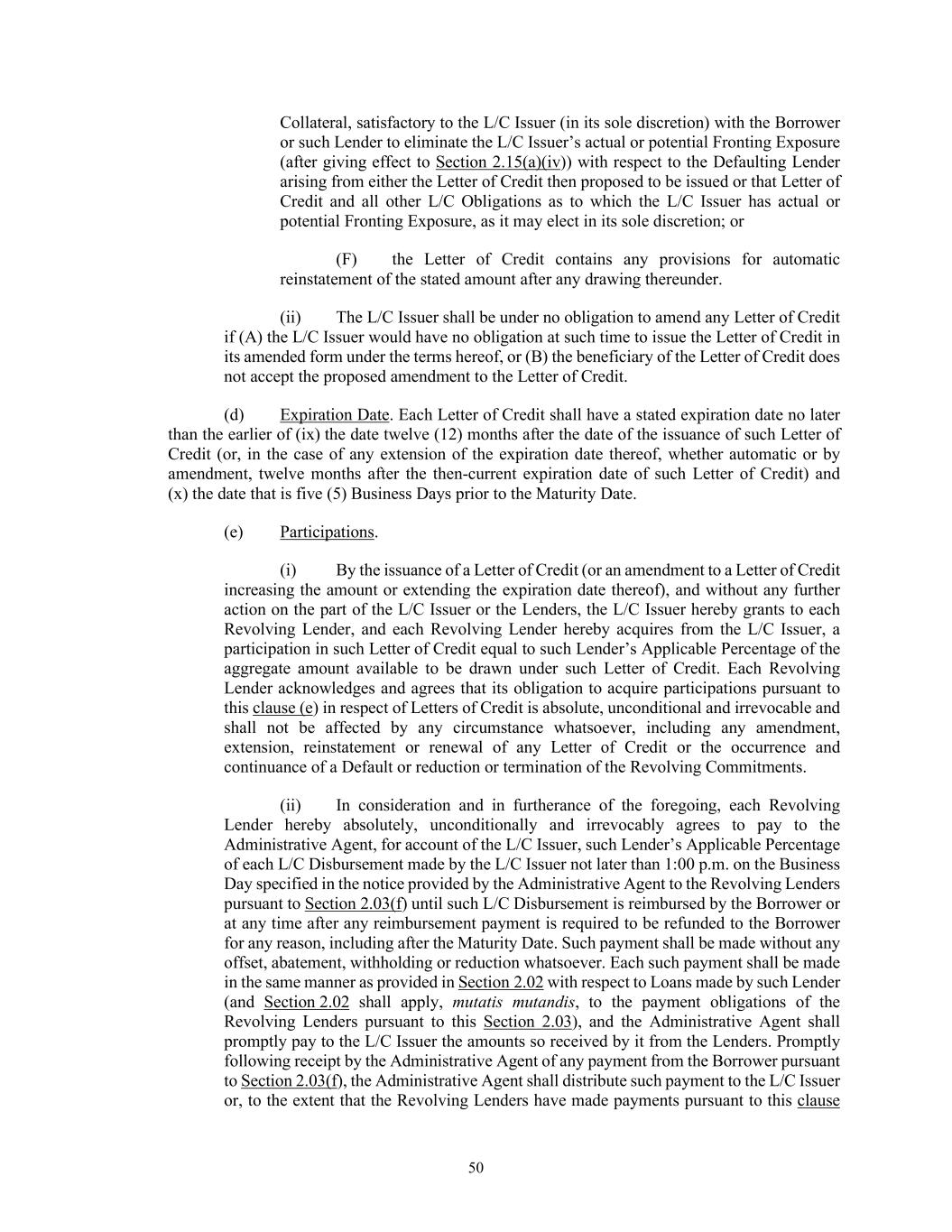 50 Collateral, satisfactory to the L/C Issuer (in its sole discretion) with the Borrower or such Lender to eliminate the L/C Issuer’s actual or potential Fronting Exposure (after giving effect to Section 2.15(a)(iv)) with respect to the Defaulting Lender arising from either the Letter of Credit then proposed to be issued or that Letter of Credit and all other L/C Obligations as to which the L/C Issuer has actual or potential Fronting Exposure, as it may elect in its sole discretion; or (F) the Letter of Credit contains any provisions for automatic reinstatement of the stated amount after any drawing thereunder. (ii) The L/C Issuer shall be under no obligation to amend any Letter of Credit if (A) the L/C Issuer would have no obligation at such time to issue the Letter of Credit in its amended form under the terms hereof, or (B) the beneficiary of the Letter of Credit does not accept the proposed amendment to the Letter of Credit. (d) Expiration Date. Each Letter of Credit shall have a stated expiration date no later than the earlier of (ix) the date twelve (12) months after the date of the issuance of such Letter of Credit (or, in the case of any extension of the expiration date thereof, whether automatic or by amendment, twelve months after the then-current expiration date of such Letter of Credit) and (x) the date that is five (5) Business Days prior to the Maturity Date. (e) Participations. (i) By the issuance of a Letter of Credit (or an amendment to a Letter of Credit increasing the amount or extending the expiration date thereof), and without any further action on the part of the L/C Issuer or the Lenders, the L/C Issuer hereby grants to each Revolving Lender, and each Revolving Lender hereby acquires from the L/C Issuer, a participation in such Letter of Credit equal to such Lender’s Applicable Percentage of the aggregate amount available to be drawn under such Letter of Credit. Each Revolving Lender acknowledges and agrees that its obligation to acquire participations pursuant to this clause (e) in respect of Letters of Credit is absolute, unconditional and irrevocable and shall not be affected by any circumstance whatsoever, including any amendment, extension, reinstatement or renewal of any Letter of Credit or the occurrence and continuance of a Default or reduction or termination of the Revolving Commitments. (ii) In consideration and in furtherance of the foregoing, each Revolving Lender hereby absolutely, unconditionally and irrevocably agrees to pay to the Administrative Agent, for account of the L/C Issuer, such Lender’s Applicable Percentage of each L/C Disbursement made by the L/C Issuer not later than 1:00 p.m. on the Business Day specified in the notice provided by the Administrative Agent to the Revolving Lenders pursuant to Section 2.03(f) until such L/C Disbursement is reimbursed by the Borrower or at any time after any reimbursement payment is required to be refunded to the Borrower for any reason, including after the Maturity Date. Such payment shall be made without any offset, abatement, withholding or reduction whatsoever. Each such payment shall be made in the same manner as provided in Section 2.02 with respect to Loans made by such Lender (and Section 2.02 shall apply, mutatis mutandis, to the payment obligations of the Revolving Lenders pursuant to this Section 2.03), and the Administrative Agent shall promptly pay to the L/C Issuer the amounts so received by it from the Lenders. Promptly following receipt by the Administrative Agent of any payment from the Borrower pursuant to Section 2.03(f), the Administrative Agent shall distribute such payment to the L/C Issuer or, to the extent that the Revolving Lenders have made payments pursuant to this clause