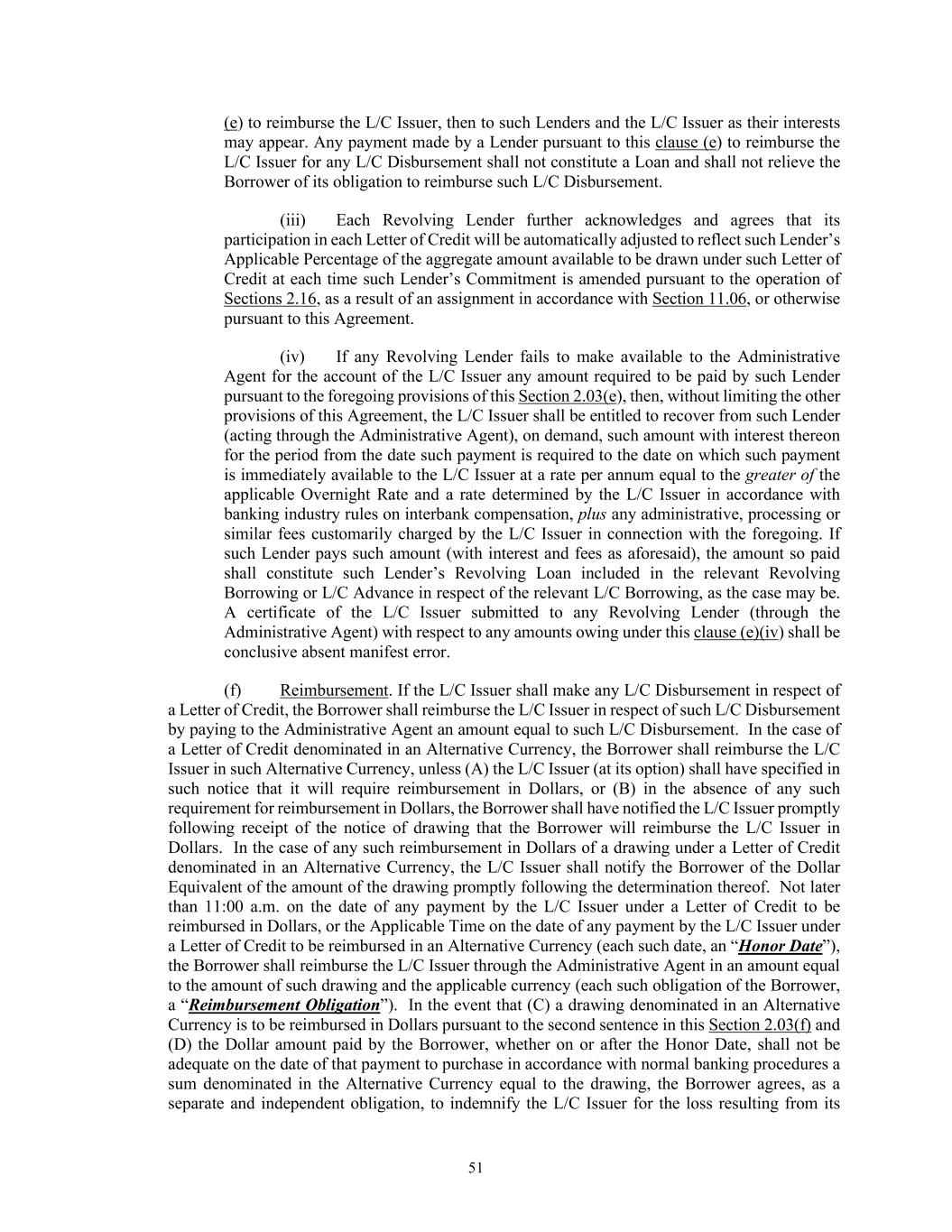 51 (e) to reimburse the L/C Issuer, then to such Lenders and the L/C Issuer as their interests may appear. Any payment made by a Lender pursuant to this clause (e) to reimburse the L/C Issuer for any L/C Disbursement shall not constitute a Loan and shall not relieve the Borrower of its obligation to reimburse such L/C Disbursement. (iii) Each Revolving Lender further acknowledges and agrees that its participation in each Letter of Credit will be automatically adjusted to reflect such Lender’s Applicable Percentage of the aggregate amount available to be drawn under such Letter of Credit at each time such Lender’s Commitment is amended pursuant to the operation of Sections 2.16, as a result of an assignment in accordance with Section 11.06, or otherwise pursuant to this Agreement. (iv) If any Revolving Lender fails to make available to the Administrative Agent for the account of the L/C Issuer any amount required to be paid by such Lender pursuant to the foregoing provisions of this Section 2.03(e), then, without limiting the other provisions of this Agreement, the L/C Issuer shall be entitled to recover from such Lender (acting through the Administrative Agent), on demand, such amount with interest thereon for the period from the date such payment is required to the date on which such payment is immediately available to the L/C Issuer at a rate per annum equal to the greater of the applicable Overnight Rate and a rate determined by the L/C Issuer in accordance with banking industry rules on interbank compensation, plus any administrative, processing or similar fees customarily charged by the L/C Issuer in connection with the foregoing. If such Lender pays such amount (with interest and fees as aforesaid), the amount so paid shall constitute such Lender’s Revolving Loan included in the relevant Revolving Borrowing or L/C Advance in respect of the relevant L/C Borrowing, as the case may be. A certificate of the L/C Issuer submitted to any Revolving Lender (through the Administrative Agent) with respect to any amounts owing under this clause (e)(iv) shall be conclusive absent manifest error. (f) Reimbursement. If the L/C Issuer shall make any L/C Disbursement in respect of a Letter of Credit, the Borrower shall reimburse the L/C Issuer in respect of such L/C Disbursement by paying to the Administrative Agent an amount equal to such L/C Disbursement. In the case of a Letter of Credit denominated in an Alternative Currency, the Borrower shall reimburse the L/C Issuer in such Alternative Currency, unless (A) the L/C Issuer (at its option) shall have specified in such notice that it will require reimbursement in Dollars, or (B) in the absence of any such requirement for reimbursement in Dollars, the Borrower shall have notified the L/C Issuer promptly following receipt of the notice of drawing that the Borrower will reimburse the L/C Issuer in Dollars. In the case of any such reimbursement in Dollars of a drawing under a Letter of Credit denominated in an Alternative Currency, the L/C Issuer shall notify the Borrower of the Dollar Equivalent of the amount of the drawing promptly following the determination thereof. Not later than 11:00 a.m. on the date of any payment by the L/C Issuer under a Letter of Credit to be reimbursed in Dollars, or the Applicable Time on the date of any payment by the L/C Issuer under a Letter of Credit to be reimbursed in an Alternative Currency (each such date, an “Honor Date”), the Borrower shall reimburse the L/C Issuer through the Administrative Agent in an amount equal to the amount of such drawing and the applicable currency (each such obligation of the Borrower, a “Reimbursement Obligation”). In the event that (C) a drawing denominated in an Alternative Currency is to be reimbursed in Dollars pursuant to the second sentence in this Section 2.03(f) and (D) the Dollar amount paid by the Borrower, whether on or after the Honor Date, shall not be adequate on the date of that payment to purchase in accordance with normal banking procedures a sum denominated in the Alternative Currency equal to the drawing, the Borrower agrees, as a separate and independent obligation, to indemnify the L/C Issuer for the loss resulting from its