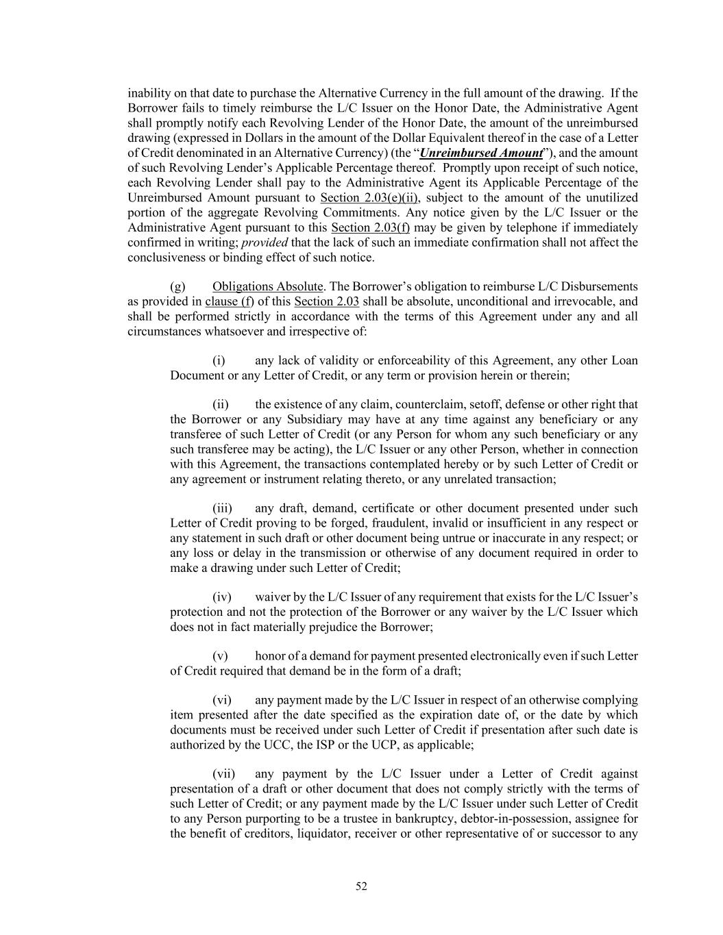 52 inability on that date to purchase the Alternative Currency in the full amount of the drawing. If the Borrower fails to timely reimburse the L/C Issuer on the Honor Date, the Administrative Agent shall promptly notify each Revolving Lender of the Honor Date, the amount of the unreimbursed drawing (expressed in Dollars in the amount of the Dollar Equivalent thereof in the case of a Letter of Credit denominated in an Alternative Currency) (the “Unreimbursed Amount”), and the amount of such Revolving Lender’s Applicable Percentage thereof. Promptly upon receipt of such notice, each Revolving Lender shall pay to the Administrative Agent its Applicable Percentage of the Unreimbursed Amount pursuant to Section 2.03(e)(ii), subject to the amount of the unutilized portion of the aggregate Revolving Commitments. Any notice given by the L/C Issuer or the Administrative Agent pursuant to this Section 2.03(f) may be given by telephone if immediately confirmed in writing; provided that the lack of such an immediate confirmation shall not affect the conclusiveness or binding effect of such notice. (g) Obligations Absolute. The Borrower’s obligation to reimburse L/C Disbursements as provided in clause (f) of this Section 2.03 shall be absolute, unconditional and irrevocable, and shall be performed strictly in accordance with the terms of this Agreement under any and all circumstances whatsoever and irrespective of: (i) any lack of validity or enforceability of this Agreement, any other Loan Document or any Letter of Credit, or any term or provision herein or therein; (ii) the existence of any claim, counterclaim, setoff, defense or other right that the Borrower or any Subsidiary may have at any time against any beneficiary or any transferee of such Letter of Credit (or any Person for whom any such beneficiary or any such transferee may be acting), the L/C Issuer or any other Person, whether in connection with this Agreement, the transactions contemplated hereby or by such Letter of Credit or any agreement or instrument relating thereto, or any unrelated transaction; (iii) any draft, demand, certificate or other document presented under such Letter of Credit proving to be forged, fraudulent, invalid or insufficient in any respect or any statement in such draft or other document being untrue or inaccurate in any respect; or any loss or delay in the transmission or otherwise of any document required in order to make a drawing under such Letter of Credit; (iv) waiver by the L/C Issuer of any requirement that exists for the L/C Issuer’s protection and not the protection of the Borrower or any waiver by the L/C Issuer which does not in fact materially prejudice the Borrower; (v) honor of a demand for payment presented electronically even if such Letter of Credit required that demand be in the form of a draft; (vi) any payment made by the L/C Issuer in respect of an otherwise complying item presented after the date specified as the expiration date of, or the date by which documents must be received under such Letter of Credit if presentation after such date is authorized by the UCC, the ISP or the UCP, as applicable; (vii) any payment by the L/C Issuer under a Letter of Credit against presentation of a draft or other document that does not comply strictly with the terms of such Letter of Credit; or any payment made by the L/C Issuer under such Letter of Credit to any Person purporting to be a trustee in bankruptcy, debtor-in-possession, assignee for the benefit of creditors, liquidator, receiver or other representative of or successor to any