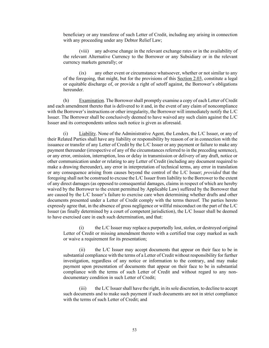 53 beneficiary or any transferee of such Letter of Credit, including any arising in connection with any proceeding under any Debtor Relief Law; (viii) any adverse change in the relevant exchange rates or in the availability of the relevant Alternative Currency to the Borrower or any Subsidiary or in the relevant currency markets generally; or (ix) any other event or circumstance whatsoever, whether or not similar to any of the foregoing, that might, but for the provisions of this Section 2.03, constitute a legal or equitable discharge of, or provide a right of setoff against, the Borrower’s obligations hereunder. (h) Examination. The Borrower shall promptly examine a copy of each Letter of Credit and each amendment thereto that is delivered to it and, in the event of any claim of noncompliance with the Borrower’s instructions or other irregularity, the Borrower will immediately notify the L/C Issuer. The Borrower shall be conclusively deemed to have waived any such claim against the L/C Issuer and its correspondents unless such notice is given as aforesaid. (i) Liability. None of the Administrative Agent, the Lenders, the L/C Issuer, or any of their Related Parties shall have any liability or responsibility by reason of or in connection with the issuance or transfer of any Letter of Credit by the L/C Issuer or any payment or failure to make any payment thereunder (irrespective of any of the circumstances referred to in the preceding sentence), or any error, omission, interruption, loss or delay in transmission or delivery of any draft, notice or other communication under or relating to any Letter of Credit (including any document required to make a drawing thereunder), any error in interpretation of technical terms, any error in translation or any consequence arising from causes beyond the control of the L/C Issuer; provided that the foregoing shall not be construed to excuse the L/C Issuer from liability to the Borrower to the extent of any direct damages (as opposed to consequential damages, claims in respect of which are hereby waived by the Borrower to the extent permitted by Applicable Law) suffered by the Borrower that are caused by the L/C Issuer’s failure to exercise care when determining whether drafts and other documents presented under a Letter of Credit comply with the terms thereof. The parties hereto expressly agree that, in the absence of gross negligence or willful misconduct on the part of the L/C Issuer (as finally determined by a court of competent jurisdiction), the L/C Issuer shall be deemed to have exercised care in each such determination, and that: (i) the L/C Issuer may replace a purportedly lost, stolen, or destroyed original Letter of Credit or missing amendment thereto with a certified true copy marked as such or waive a requirement for its presentation; (ii) the L/C Issuer may accept documents that appear on their face to be in substantial compliance with the terms of a Letter of Credit without responsibility for further investigation, regardless of any notice or information to the contrary, and may make payment upon presentation of documents that appear on their face to be in substantial compliance with the terms of such Letter of Credit and without regard to any non- documentary condition in such Letter of Credit; (iii) the L/C Issuer shall have the right, in its sole discretion, to decline to accept such documents and to make such payment if such documents are not in strict compliance with the terms of such Letter of Credit; and