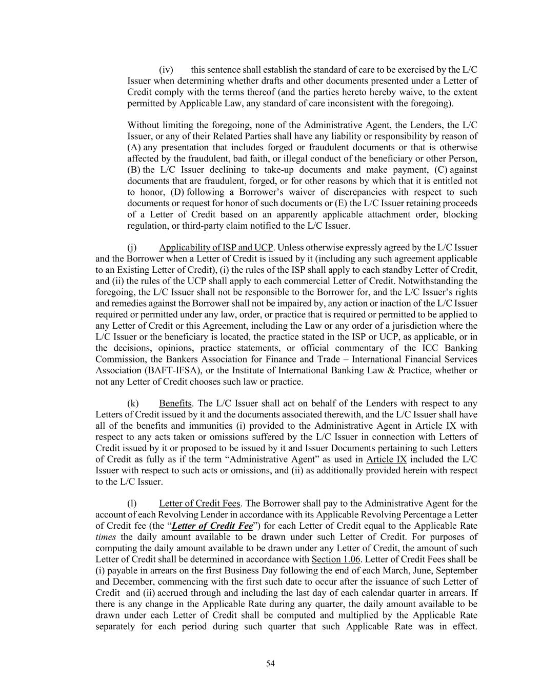 54 (iv) this sentence shall establish the standard of care to be exercised by the L/C Issuer when determining whether drafts and other documents presented under a Letter of Credit comply with the terms thereof (and the parties hereto hereby waive, to the extent permitted by Applicable Law, any standard of care inconsistent with the foregoing). Without limiting the foregoing, none of the Administrative Agent, the Lenders, the L/C Issuer, or any of their Related Parties shall have any liability or responsibility by reason of (A) any presentation that includes forged or fraudulent documents or that is otherwise affected by the fraudulent, bad faith, or illegal conduct of the beneficiary or other Person, (B) the L/C Issuer declining to take-up documents and make payment, (C) against documents that are fraudulent, forged, or for other reasons by which that it is entitled not to honor, (D) following a Borrower’s waiver of discrepancies with respect to such documents or request for honor of such documents or (E) the L/C Issuer retaining proceeds of a Letter of Credit based on an apparently applicable attachment order, blocking regulation, or third-party claim notified to the L/C Issuer. (j) Applicability of ISP and UCP. Unless otherwise expressly agreed by the L/C Issuer and the Borrower when a Letter of Credit is issued by it (including any such agreement applicable to an Existing Letter of Credit), (i) the rules of the ISP shall apply to each standby Letter of Credit, and (ii) the rules of the UCP shall apply to each commercial Letter of Credit. Notwithstanding the foregoing, the L/C Issuer shall not be responsible to the Borrower for, and the L/C Issuer’s rights and remedies against the Borrower shall not be impaired by, any action or inaction of the L/C Issuer required or permitted under any law, order, or practice that is required or permitted to be applied to any Letter of Credit or this Agreement, including the Law or any order of a jurisdiction where the L/C Issuer or the beneficiary is located, the practice stated in the ISP or UCP, as applicable, or in the decisions, opinions, practice statements, or official commentary of the ICC Banking Commission, the Bankers Association for Finance and Trade – International Financial Services Association (BAFT-IFSA), or the Institute of International Banking Law & Practice, whether or not any Letter of Credit chooses such law or practice. (k) Benefits. The L/C Issuer shall act on behalf of the Lenders with respect to any Letters of Credit issued by it and the documents associated therewith, and the L/C Issuer shall have all of the benefits and immunities (i) provided to the Administrative Agent in Article IX with respect to any acts taken or omissions suffered by the L/C Issuer in connection with Letters of Credit issued by it or proposed to be issued by it and Issuer Documents pertaining to such Letters of Credit as fully as if the term “Administrative Agent” as used in Article IX included the L/C Issuer with respect to such acts or omissions, and (ii) as additionally provided herein with respect to the L/C Issuer. (l) Letter of Credit Fees. The Borrower shall pay to the Administrative Agent for the account of each Revolving Lender in accordance with its Applicable Revolving Percentage a Letter of Credit fee (the “Letter of Credit Fee”) for each Letter of Credit equal to the Applicable Rate times the daily amount available to be drawn under such Letter of Credit. For purposes of computing the daily amount available to be drawn under any Letter of Credit, the amount of such Letter of Credit shall be determined in accordance with Section 1.06. Letter of Credit Fees shall be (i) payable in arrears on the first Business Day following the end of each March, June, September and December, commencing with the first such date to occur after the issuance of such Letter of Credit and (ii) accrued through and including the last day of each calendar quarter in arrears. If there is any change in the Applicable Rate during any quarter, the daily amount available to be drawn under each Letter of Credit shall be computed and multiplied by the Applicable Rate separately for each period during such quarter that such Applicable Rate was in effect.
