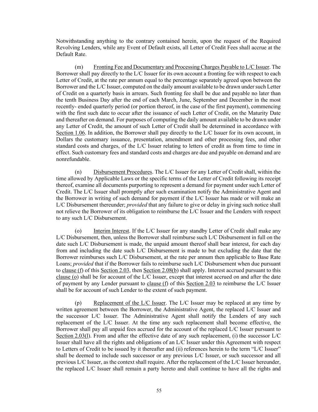55 Notwithstanding anything to the contrary contained herein, upon the request of the Required Revolving Lenders, while any Event of Default exists, all Letter of Credit Fees shall accrue at the Default Rate. (m) Fronting Fee and Documentary and Processing Charges Payable to L/C Issuer. The Borrower shall pay directly to the L/C Issuer for its own account a fronting fee with respect to each Letter of Credit, at the rate per annum equal to the percentage separately agreed upon between the Borrower and the L/C Issuer, computed on the daily amount available to be drawn under such Letter of Credit on a quarterly basis in arrears. Such fronting fee shall be due and payable no later than the tenth Business Day after the end of each March, June, September and December in the most recently- ended quarterly period (or portion thereof, in the case of the first payment), commencing with the first such date to occur after the issuance of such Letter of Credit, on the Maturity Date and thereafter on demand. For purposes of computing the daily amount available to be drawn under any Letter of Credit, the amount of such Letter of Credit shall be determined in accordance with Section 1.06. In addition, the Borrower shall pay directly to the L/C Issuer for its own account, in Dollars the customary issuance, presentation, amendment and other processing fees, and other standard costs and charges, of the L/C Issuer relating to letters of credit as from time to time in effect. Such customary fees and standard costs and charges are due and payable on demand and are nonrefundable. (n) Disbursement Procedures. The L/C Issuer for any Letter of Credit shall, within the time allowed by Applicable Laws or the specific terms of the Letter of Credit following its receipt thereof, examine all documents purporting to represent a demand for payment under such Letter of Credit. The L/C Issuer shall promptly after such examination notify the Administrative Agent and the Borrower in writing of such demand for payment if the L/C Issuer has made or will make an L/C Disbursement thereunder; provided that any failure to give or delay in giving such notice shall not relieve the Borrower of its obligation to reimburse the L/C Issuer and the Lenders with respect to any such L/C Disbursement. (o) Interim Interest. If the L/C Issuer for any standby Letter of Credit shall make any L/C Disbursement, then, unless the Borrower shall reimburse such L/C Disbursement in full on the date such L/C Disbursement is made, the unpaid amount thereof shall bear interest, for each day from and including the date such L/C Disbursement is made to but excluding the date that the Borrower reimburses such L/C Disbursement, at the rate per annum then applicable to Base Rate Loans; provided that if the Borrower fails to reimburse such L/C Disbursement when due pursuant to clause (f) of this Section 2.03, then Section 2.08(b) shall apply. Interest accrued pursuant to this clause (o) shall be for account of the L/C Issuer, except that interest accrued on and after the date of payment by any Lender pursuant to clause (f) of this Section 2.03 to reimburse the L/C Issuer shall be for account of such Lender to the extent of such payment. (p) Replacement of the L/C Issuer. The L/C Issuer may be replaced at any time by written agreement between the Borrower, the Administrative Agent, the replaced L/C Issuer and the successor L/C Issuer. The Administrative Agent shall notify the Lenders of any such replacement of the L/C Issuer. At the time any such replacement shall become effective, the Borrower shall pay all unpaid fees accrued for the account of the replaced L/C Issuer pursuant to Section 2.03(l). From and after the effective date of any such replacement, (i) the successor L/C Issuer shall have all the rights and obligations of an L/C Issuer under this Agreement with respect to Letters of Credit to be issued by it thereafter and (ii) references herein to the term “L/C Issuer” shall be deemed to include such successor or any previous L/C Issuer, or such successor and all previous L/C Issuer, as the context shall require. After the replacement of the L/C Issuer hereunder, the replaced L/C Issuer shall remain a party hereto and shall continue to have all the rights and