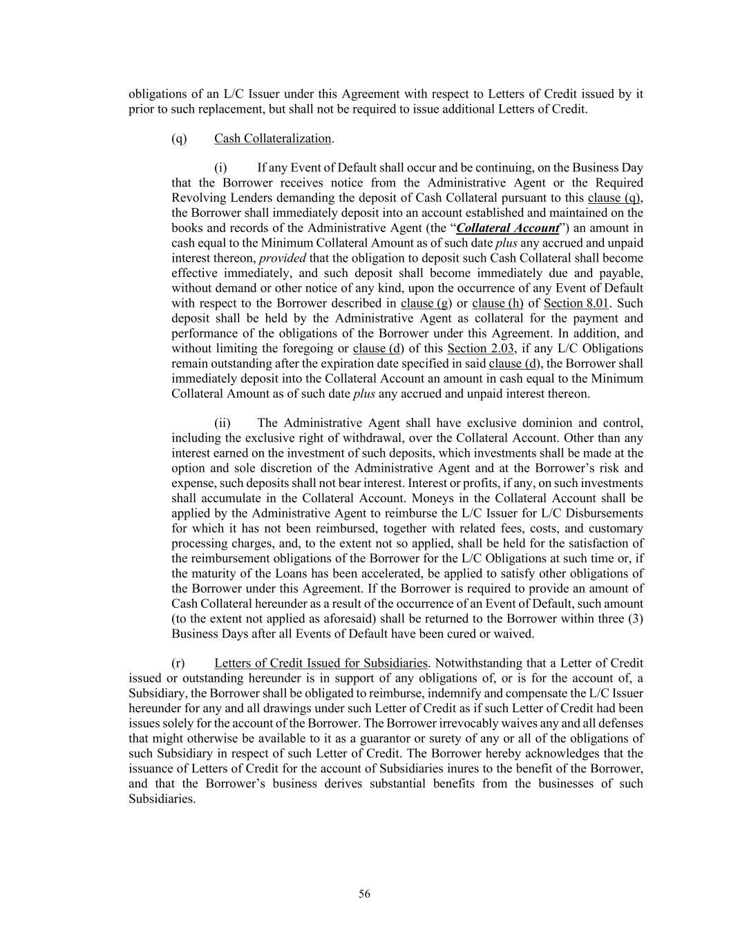 56 obligations of an L/C Issuer under this Agreement with respect to Letters of Credit issued by it prior to such replacement, but shall not be required to issue additional Letters of Credit. (q) Cash Collateralization. (i) If any Event of Default shall occur and be continuing, on the Business Day that the Borrower receives notice from the Administrative Agent or the Required Revolving Lenders demanding the deposit of Cash Collateral pursuant to this clause (q), the Borrower shall immediately deposit into an account established and maintained on the books and records of the Administrative Agent (the “Collateral Account”) an amount in cash equal to the Minimum Collateral Amount as of such date plus any accrued and unpaid interest thereon, provided that the obligation to deposit such Cash Collateral shall become effective immediately, and such deposit shall become immediately due and payable, without demand or other notice of any kind, upon the occurrence of any Event of Default with respect to the Borrower described in clause (g) or clause (h) of Section 8.01. Such deposit shall be held by the Administrative Agent as collateral for the payment and performance of the obligations of the Borrower under this Agreement. In addition, and without limiting the foregoing or clause (d) of this Section 2.03, if any L/C Obligations remain outstanding after the expiration date specified in said clause (d), the Borrower shall immediately deposit into the Collateral Account an amount in cash equal to the Minimum Collateral Amount as of such date plus any accrued and unpaid interest thereon. (ii) The Administrative Agent shall have exclusive dominion and control, including the exclusive right of withdrawal, over the Collateral Account. Other than any interest earned on the investment of such deposits, which investments shall be made at the option and sole discretion of the Administrative Agent and at the Borrower’s risk and expense, such deposits shall not bear interest. Interest or profits, if any, on such investments shall accumulate in the Collateral Account. Moneys in the Collateral Account shall be applied by the Administrative Agent to reimburse the L/C Issuer for L/C Disbursements for which it has not been reimbursed, together with related fees, costs, and customary processing charges, and, to the extent not so applied, shall be held for the satisfaction of the reimbursement obligations of the Borrower for the L/C Obligations at such time or, if the maturity of the Loans has been accelerated, be applied to satisfy other obligations of the Borrower under this Agreement. If the Borrower is required to provide an amount of Cash Collateral hereunder as a result of the occurrence of an Event of Default, such amount (to the extent not applied as aforesaid) shall be returned to the Borrower within three (3) Business Days after all Events of Default have been cured or waived. (r) Letters of Credit Issued for Subsidiaries. Notwithstanding that a Letter of Credit issued or outstanding hereunder is in support of any obligations of, or is for the account of, a Subsidiary, the Borrower shall be obligated to reimburse, indemnify and compensate the L/C Issuer hereunder for any and all drawings under such Letter of Credit as if such Letter of Credit had been issues solely for the account of the Borrower. The Borrower irrevocably waives any and all defenses that might otherwise be available to it as a guarantor or surety of any or all of the obligations of such Subsidiary in respect of such Letter of Credit. The Borrower hereby acknowledges that the issuance of Letters of Credit for the account of Subsidiaries inures to the benefit of the Borrower, and that the Borrower’s business derives substantial benefits from the businesses of such Subsidiaries.