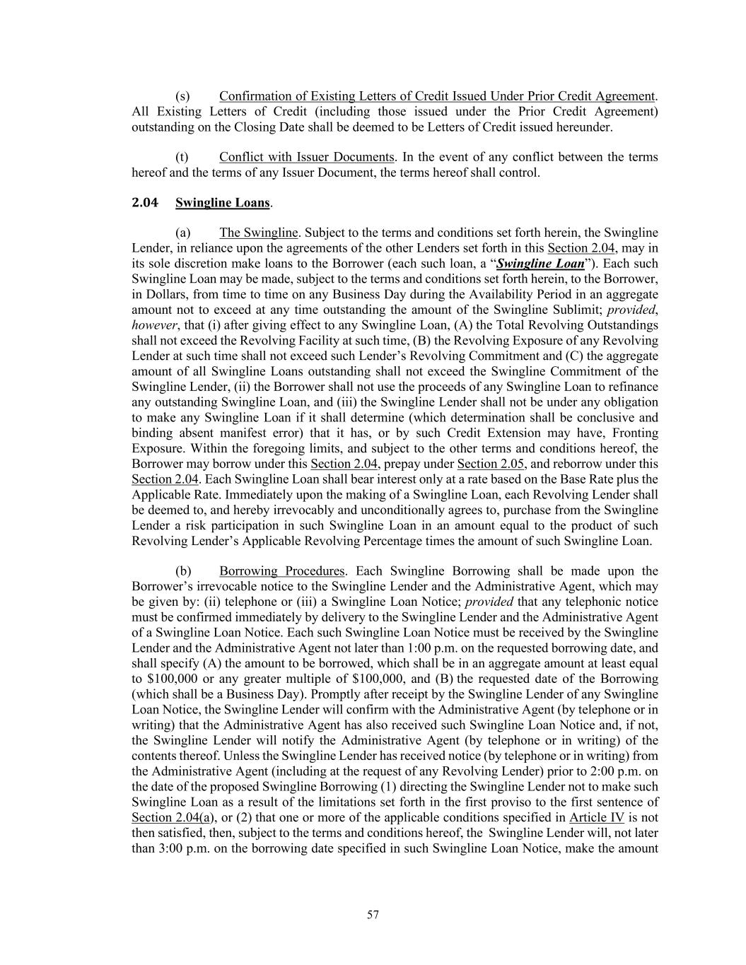 57 (s) Confirmation of Existing Letters of Credit Issued Under Prior Credit Agreement. All Existing Letters of Credit (including those issued under the Prior Credit Agreement) outstanding on the Closing Date shall be deemed to be Letters of Credit issued hereunder. (t) Conflict with Issuer Documents. In the event of any conflict between the terms hereof and the terms of any Issuer Document, the terms hereof shall control. 2.04 Swingline Loans. (a) The Swingline. Subject to the terms and conditions set forth herein, the Swingline Lender, in reliance upon the agreements of the other Lenders set forth in this Section 2.04, may in its sole discretion make loans to the Borrower (each such loan, a “Swingline Loan”). Each such Swingline Loan may be made, subject to the terms and conditions set forth herein, to the Borrower, in Dollars, from time to time on any Business Day during the Availability Period in an aggregate amount not to exceed at any time outstanding the amount of the Swingline Sublimit; provided, however, that (i) after giving effect to any Swingline Loan, (A) the Total Revolving Outstandings shall not exceed the Revolving Facility at such time, (B) the Revolving Exposure of any Revolving Lender at such time shall not exceed such Lender’s Revolving Commitment and (C) the aggregate amount of all Swingline Loans outstanding shall not exceed the Swingline Commitment of the Swingline Lender, (ii) the Borrower shall not use the proceeds of any Swingline Loan to refinance any outstanding Swingline Loan, and (iii) the Swingline Lender shall not be under any obligation to make any Swingline Loan if it shall determine (which determination shall be conclusive and binding absent manifest error) that it has, or by such Credit Extension may have, Fronting Exposure. Within the foregoing limits, and subject to the other terms and conditions hereof, the Borrower may borrow under this Section 2.04, prepay under Section 2.05, and reborrow under this Section 2.04. Each Swingline Loan shall bear interest only at a rate based on the Base Rate plus the Applicable Rate. Immediately upon the making of a Swingline Loan, each Revolving Lender shall be deemed to, and hereby irrevocably and unconditionally agrees to, purchase from the Swingline Lender a risk participation in such Swingline Loan in an amount equal to the product of such Revolving Lender’s Applicable Revolving Percentage times the amount of such Swingline Loan. (b) Borrowing Procedures. Each Swingline Borrowing shall be made upon the Borrower’s irrevocable notice to the Swingline Lender and the Administrative Agent, which may be given by: (ii) telephone or (iii) a Swingline Loan Notice; provided that any telephonic notice must be confirmed immediately by delivery to the Swingline Lender and the Administrative Agent of a Swingline Loan Notice. Each such Swingline Loan Notice must be received by the Swingline Lender and the Administrative Agent not later than 1:00 p.m. on the requested borrowing date, and shall specify (A) the amount to be borrowed, which shall be in an aggregate amount at least equal to $100,000 or any greater multiple of $100,000, and (B) the requested date of the Borrowing (which shall be a Business Day). Promptly after receipt by the Swingline Lender of any Swingline Loan Notice, the Swingline Lender will confirm with the Administrative Agent (by telephone or in writing) that the Administrative Agent has also received such Swingline Loan Notice and, if not, the Swingline Lender will notify the Administrative Agent (by telephone or in writing) of the contents thereof. Unless the Swingline Lender has received notice (by telephone or in writing) from the Administrative Agent (including at the request of any Revolving Lender) prior to 2:00 p.m. on the date of the proposed Swingline Borrowing (1) directing the Swingline Lender not to make such Swingline Loan as a result of the limitations set forth in the first proviso to the first sentence of Section 2.04(a), or (2) that one or more of the applicable conditions specified in Article IV is not then satisfied, then, subject to the terms and conditions hereof, the Swingline Lender will, not later than 3:00 p.m. on the borrowing date specified in such Swingline Loan Notice, make the amount
