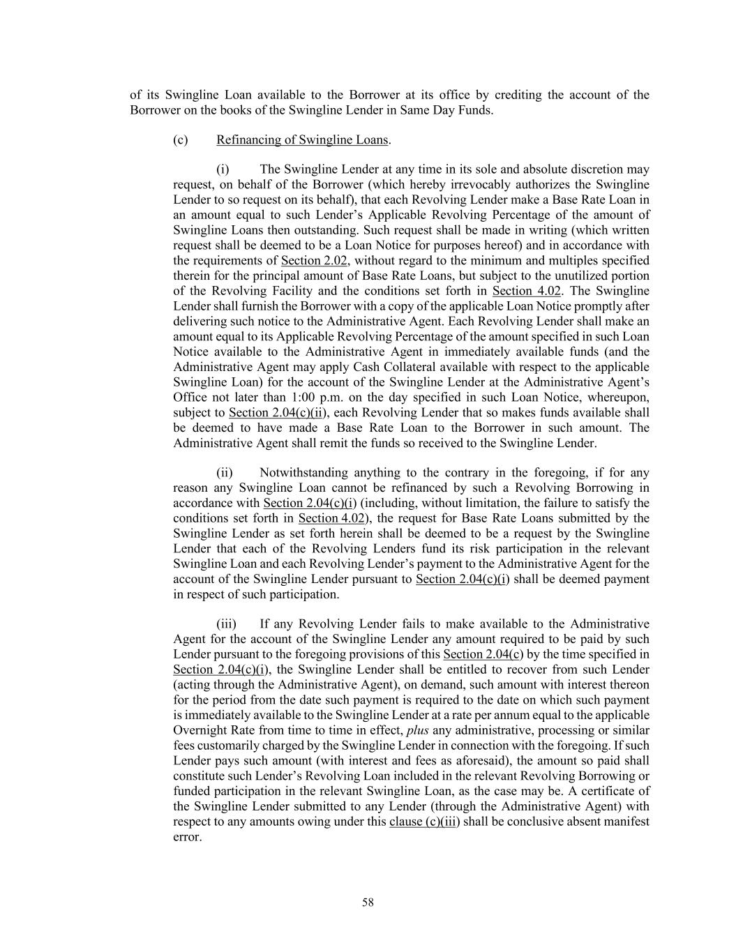 58 of its Swingline Loan available to the Borrower at its office by crediting the account of the Borrower on the books of the Swingline Lender in Same Day Funds. (c) Refinancing of Swingline Loans. (i) The Swingline Lender at any time in its sole and absolute discretion may request, on behalf of the Borrower (which hereby irrevocably authorizes the Swingline Lender to so request on its behalf), that each Revolving Lender make a Base Rate Loan in an amount equal to such Lender’s Applicable Revolving Percentage of the amount of Swingline Loans then outstanding. Such request shall be made in writing (which written request shall be deemed to be a Loan Notice for purposes hereof) and in accordance with the requirements of Section 2.02, without regard to the minimum and multiples specified therein for the principal amount of Base Rate Loans, but subject to the unutilized portion of the Revolving Facility and the conditions set forth in Section 4.02. The Swingline Lender shall furnish the Borrower with a copy of the applicable Loan Notice promptly after delivering such notice to the Administrative Agent. Each Revolving Lender shall make an amount equal to its Applicable Revolving Percentage of the amount specified in such Loan Notice available to the Administrative Agent in immediately available funds (and the Administrative Agent may apply Cash Collateral available with respect to the applicable Swingline Loan) for the account of the Swingline Lender at the Administrative Agent’s Office not later than 1:00 p.m. on the day specified in such Loan Notice, whereupon, subject to Section 2.04(c)(ii), each Revolving Lender that so makes funds available shall be deemed to have made a Base Rate Loan to the Borrower in such amount. The Administrative Agent shall remit the funds so received to the Swingline Lender. (ii) Notwithstanding anything to the contrary in the foregoing, if for any reason any Swingline Loan cannot be refinanced by such a Revolving Borrowing in accordance with Section 2.04(c)(i) (including, without limitation, the failure to satisfy the conditions set forth in Section 4.02), the request for Base Rate Loans submitted by the Swingline Lender as set forth herein shall be deemed to be a request by the Swingline Lender that each of the Revolving Lenders fund its risk participation in the relevant Swingline Loan and each Revolving Lender’s payment to the Administrative Agent for the account of the Swingline Lender pursuant to Section 2.04(c)(i) shall be deemed payment in respect of such participation. (iii) If any Revolving Lender fails to make available to the Administrative Agent for the account of the Swingline Lender any amount required to be paid by such Lender pursuant to the foregoing provisions of this Section 2.04(c) by the time specified in Section 2.04(c)(i), the Swingline Lender shall be entitled to recover from such Lender (acting through the Administrative Agent), on demand, such amount with interest thereon for the period from the date such payment is required to the date on which such payment is immediately available to the Swingline Lender at a rate per annum equal to the applicable Overnight Rate from time to time in effect, plus any administrative, processing or similar fees customarily charged by the Swingline Lender in connection with the foregoing. If such Lender pays such amount (with interest and fees as aforesaid), the amount so paid shall constitute such Lender’s Revolving Loan included in the relevant Revolving Borrowing or funded participation in the relevant Swingline Loan, as the case may be. A certificate of the Swingline Lender submitted to any Lender (through the Administrative Agent) with respect to any amounts owing under this clause (c)(iii) shall be conclusive absent manifest error.
