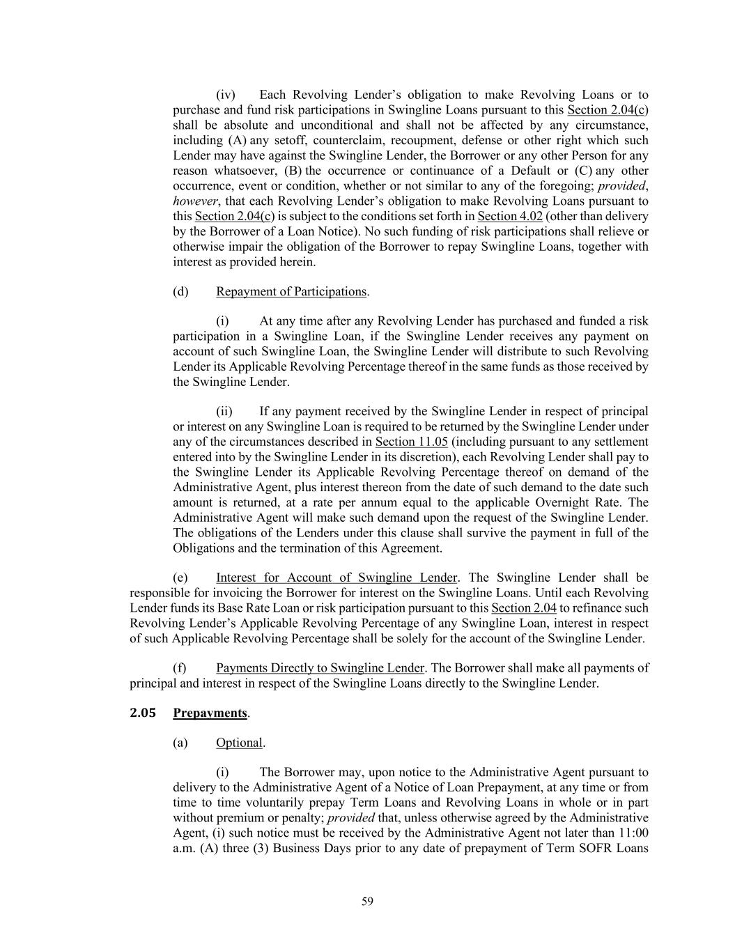 59 (iv) Each Revolving Lender’s obligation to make Revolving Loans or to purchase and fund risk participations in Swingline Loans pursuant to this Section 2.04(c) shall be absolute and unconditional and shall not be affected by any circumstance, including (A) any setoff, counterclaim, recoupment, defense or other right which such Lender may have against the Swingline Lender, the Borrower or any other Person for any reason whatsoever, (B) the occurrence or continuance of a Default or (C) any other occurrence, event or condition, whether or not similar to any of the foregoing; provided, however, that each Revolving Lender’s obligation to make Revolving Loans pursuant to this Section 2.04(c) is subject to the conditions set forth in Section 4.02 (other than delivery by the Borrower of a Loan Notice). No such funding of risk participations shall relieve or otherwise impair the obligation of the Borrower to repay Swingline Loans, together with interest as provided herein. (d) Repayment of Participations. (i) At any time after any Revolving Lender has purchased and funded a risk participation in a Swingline Loan, if the Swingline Lender receives any payment on account of such Swingline Loan, the Swingline Lender will distribute to such Revolving Lender its Applicable Revolving Percentage thereof in the same funds as those received by the Swingline Lender. (ii) If any payment received by the Swingline Lender in respect of principal or interest on any Swingline Loan is required to be returned by the Swingline Lender under any of the circumstances described in Section 11.05 (including pursuant to any settlement entered into by the Swingline Lender in its discretion), each Revolving Lender shall pay to the Swingline Lender its Applicable Revolving Percentage thereof on demand of the Administrative Agent, plus interest thereon from the date of such demand to the date such amount is returned, at a rate per annum equal to the applicable Overnight Rate. The Administrative Agent will make such demand upon the request of the Swingline Lender. The obligations of the Lenders under this clause shall survive the payment in full of the Obligations and the termination of this Agreement. (e) Interest for Account of Swingline Lender. The Swingline Lender shall be responsible for invoicing the Borrower for interest on the Swingline Loans. Until each Revolving Lender funds its Base Rate Loan or risk participation pursuant to this Section 2.04 to refinance such Revolving Lender’s Applicable Revolving Percentage of any Swingline Loan, interest in respect of such Applicable Revolving Percentage shall be solely for the account of the Swingline Lender. (f) Payments Directly to Swingline Lender. The Borrower shall make all payments of principal and interest in respect of the Swingline Loans directly to the Swingline Lender. 2.05 Prepayments. (a) Optional. (i) The Borrower may, upon notice to the Administrative Agent pursuant to delivery to the Administrative Agent of a Notice of Loan Prepayment, at any time or from time to time voluntarily prepay Term Loans and Revolving Loans in whole or in part without premium or penalty; provided that, unless otherwise agreed by the Administrative Agent, (i) such notice must be received by the Administrative Agent not later than 11:00 a.m. (A) three (3) Business Days prior to any date of prepayment of Term SOFR Loans
