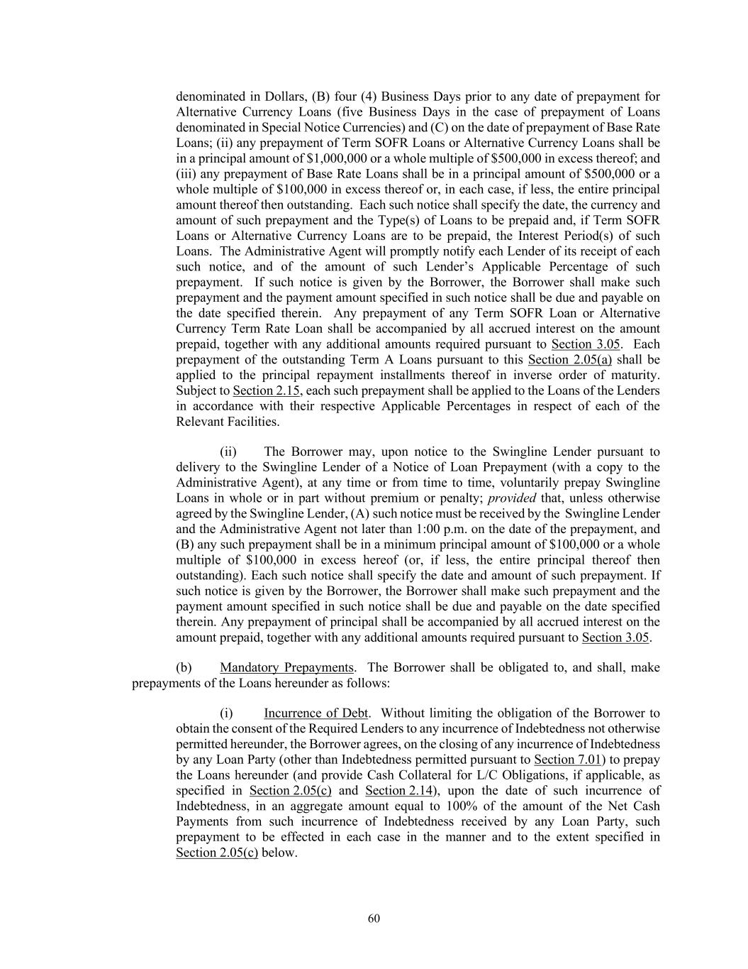 60 denominated in Dollars, (B) four (4) Business Days prior to any date of prepayment for Alternative Currency Loans (five Business Days in the case of prepayment of Loans denominated in Special Notice Currencies) and (C) on the date of prepayment of Base Rate Loans; (ii) any prepayment of Term SOFR Loans or Alternative Currency Loans shall be in a principal amount of $1,000,000 or a whole multiple of $500,000 in excess thereof; and (iii) any prepayment of Base Rate Loans shall be in a principal amount of $500,000 or a whole multiple of $100,000 in excess thereof or, in each case, if less, the entire principal amount thereof then outstanding. Each such notice shall specify the date, the currency and amount of such prepayment and the Type(s) of Loans to be prepaid and, if Term SOFR Loans or Alternative Currency Loans are to be prepaid, the Interest Period(s) of such Loans. The Administrative Agent will promptly notify each Lender of its receipt of each such notice, and of the amount of such Lender’s Applicable Percentage of such prepayment. If such notice is given by the Borrower, the Borrower shall make such prepayment and the payment amount specified in such notice shall be due and payable on the date specified therein. Any prepayment of any Term SOFR Loan or Alternative Currency Term Rate Loan shall be accompanied by all accrued interest on the amount prepaid, together with any additional amounts required pursuant to Section 3.05. Each prepayment of the outstanding Term A Loans pursuant to this Section 2.05(a) shall be applied to the principal repayment installments thereof in inverse order of maturity. Subject to Section 2.15, each such prepayment shall be applied to the Loans of the Lenders in accordance with their respective Applicable Percentages in respect of each of the Relevant Facilities. (ii) The Borrower may, upon notice to the Swingline Lender pursuant to delivery to the Swingline Lender of a Notice of Loan Prepayment (with a copy to the Administrative Agent), at any time or from time to time, voluntarily prepay Swingline Loans in whole or in part without premium or penalty; provided that, unless otherwise agreed by the Swingline Lender, (A) such notice must be received by the Swingline Lender and the Administrative Agent not later than 1:00 p.m. on the date of the prepayment, and (B) any such prepayment shall be in a minimum principal amount of $100,000 or a whole multiple of $100,000 in excess hereof (or, if less, the entire principal thereof then outstanding). Each such notice shall specify the date and amount of such prepayment. If such notice is given by the Borrower, the Borrower shall make such prepayment and the payment amount specified in such notice shall be due and payable on the date specified therein. Any prepayment of principal shall be accompanied by all accrued interest on the amount prepaid, together with any additional amounts required pursuant to Section 3.05. (b) Mandatory Prepayments. The Borrower shall be obligated to, and shall, make prepayments of the Loans hereunder as follows: (i) Incurrence of Debt. Without limiting the obligation of the Borrower to obtain the consent of the Required Lenders to any incurrence of Indebtedness not otherwise permitted hereunder, the Borrower agrees, on the closing of any incurrence of Indebtedness by any Loan Party (other than Indebtedness permitted pursuant to Section 7.01) to prepay the Loans hereunder (and provide Cash Collateral for L/C Obligations, if applicable, as specified in Section 2.05(c) and Section 2.14), upon the date of such incurrence of Indebtedness, in an aggregate amount equal to 100% of the amount of the Net Cash Payments from such incurrence of Indebtedness received by any Loan Party, such prepayment to be effected in each case in the manner and to the extent specified in Section 2.05(c) below.
