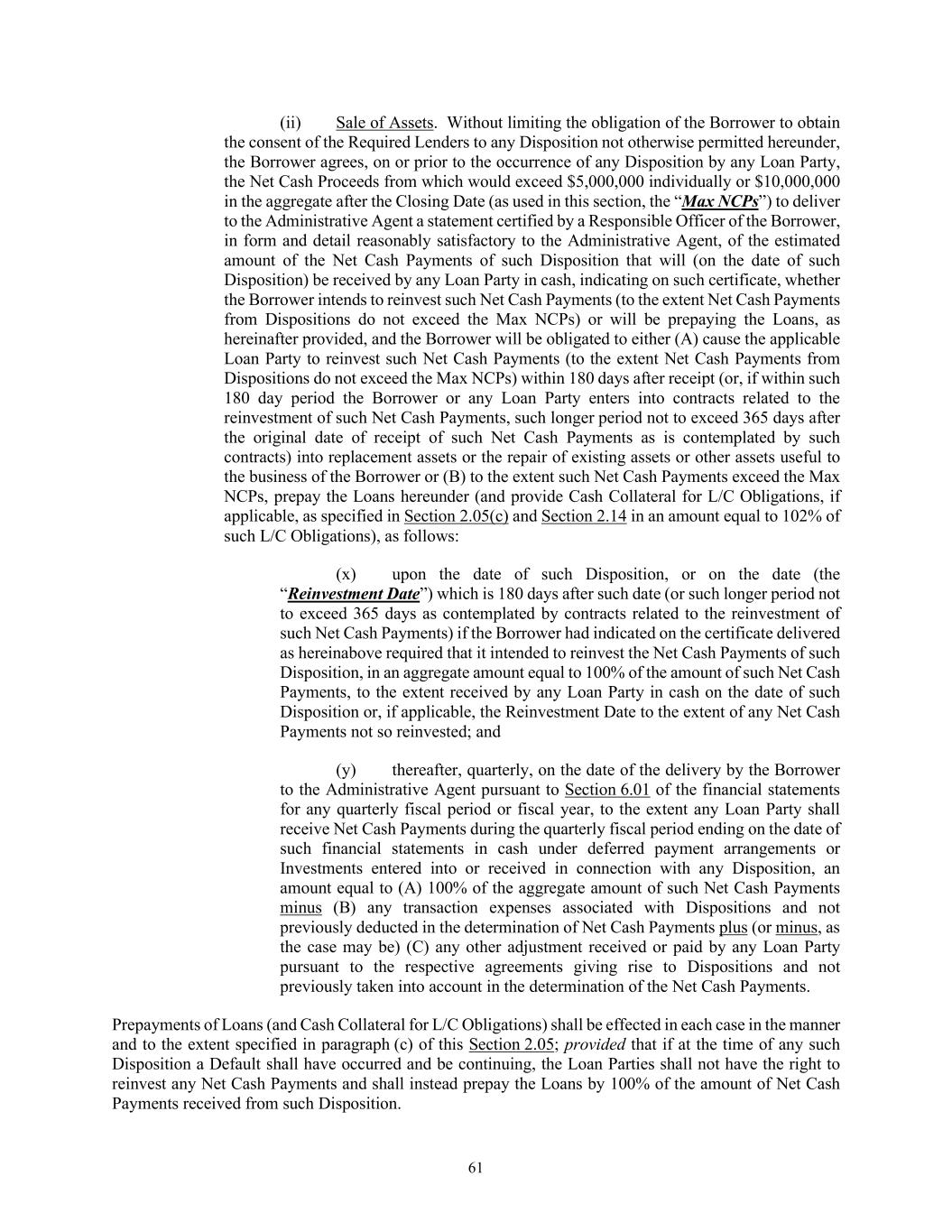 61 (ii) Sale of Assets. Without limiting the obligation of the Borrower to obtain the consent of the Required Lenders to any Disposition not otherwise permitted hereunder, the Borrower agrees, on or prior to the occurrence of any Disposition by any Loan Party, the Net Cash Proceeds from which would exceed $5,000,000 individually or $10,000,000 in the aggregate after the Closing Date (as used in this section, the “Max NCPs”) to deliver to the Administrative Agent a statement certified by a Responsible Officer of the Borrower, in form and detail reasonably satisfactory to the Administrative Agent, of the estimated amount of the Net Cash Payments of such Disposition that will (on the date of such Disposition) be received by any Loan Party in cash, indicating on such certificate, whether the Borrower intends to reinvest such Net Cash Payments (to the extent Net Cash Payments from Dispositions do not exceed the Max NCPs) or will be prepaying the Loans, as hereinafter provided, and the Borrower will be obligated to either (A) cause the applicable Loan Party to reinvest such Net Cash Payments (to the extent Net Cash Payments from Dispositions do not exceed the Max NCPs) within 180 days after receipt (or, if within such 180 day period the Borrower or any Loan Party enters into contracts related to the reinvestment of such Net Cash Payments, such longer period not to exceed 365 days after the original date of receipt of such Net Cash Payments as is contemplated by such contracts) into replacement assets or the repair of existing assets or other assets useful to the business of the Borrower or (B) to the extent such Net Cash Payments exceed the Max NCPs, prepay the Loans hereunder (and provide Cash Collateral for L/C Obligations, if applicable, as specified in Section 2.05(c) and Section 2.14 in an amount equal to 102% of such L/C Obligations), as follows: (x) upon the date of such Disposition, or on the date (the “Reinvestment Date”) which is 180 days after such date (or such longer period not to exceed 365 days as contemplated by contracts related to the reinvestment of such Net Cash Payments) if the Borrower had indicated on the certificate delivered as hereinabove required that it intended to reinvest the Net Cash Payments of such Disposition, in an aggregate amount equal to 100% of the amount of such Net Cash Payments, to the extent received by any Loan Party in cash on the date of such Disposition or, if applicable, the Reinvestment Date to the extent of any Net Cash Payments not so reinvested; and (y) thereafter, quarterly, on the date of the delivery by the Borrower to the Administrative Agent pursuant to Section 6.01 of the financial statements for any quarterly fiscal period or fiscal year, to the extent any Loan Party shall receive Net Cash Payments during the quarterly fiscal period ending on the date of such financial statements in cash under deferred payment arrangements or Investments entered into or received in connection with any Disposition, an amount equal to (A) 100% of the aggregate amount of such Net Cash Payments minus (B) any transaction expenses associated with Dispositions and not previously deducted in the determination of Net Cash Payments plus (or minus, as the case may be) (C) any other adjustment received or paid by any Loan Party pursuant to the respective agreements giving rise to Dispositions and not previously taken into account in the determination of the Net Cash Payments. Prepayments of Loans (and Cash Collateral for L/C Obligations) shall be effected in each case in the manner and to the extent specified in paragraph (c) of this Section 2.05; provided that if at the time of any such Disposition a Default shall have occurred and be continuing, the Loan Parties shall not have the right to reinvest any Net Cash Payments and shall instead prepay the Loans by 100% of the amount of Net Cash Payments received from such Disposition.