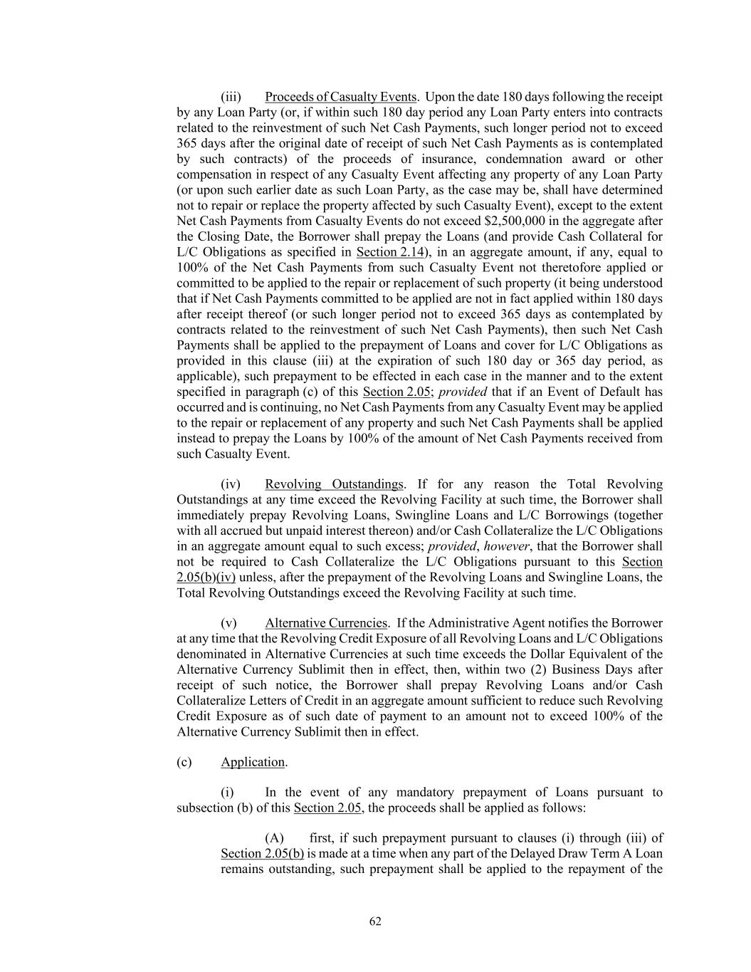 62 (iii) Proceeds of Casualty Events. Upon the date 180 days following the receipt by any Loan Party (or, if within such 180 day period any Loan Party enters into contracts related to the reinvestment of such Net Cash Payments, such longer period not to exceed 365 days after the original date of receipt of such Net Cash Payments as is contemplated by such contracts) of the proceeds of insurance, condemnation award or other compensation in respect of any Casualty Event affecting any property of any Loan Party (or upon such earlier date as such Loan Party, as the case may be, shall have determined not to repair or replace the property affected by such Casualty Event), except to the extent Net Cash Payments from Casualty Events do not exceed $2,500,000 in the aggregate after the Closing Date, the Borrower shall prepay the Loans (and provide Cash Collateral for L/C Obligations as specified in Section 2.14), in an aggregate amount, if any, equal to 100% of the Net Cash Payments from such Casualty Event not theretofore applied or committed to be applied to the repair or replacement of such property (it being understood that if Net Cash Payments committed to be applied are not in fact applied within 180 days after receipt thereof (or such longer period not to exceed 365 days as contemplated by contracts related to the reinvestment of such Net Cash Payments), then such Net Cash Payments shall be applied to the prepayment of Loans and cover for L/C Obligations as provided in this clause (iii) at the expiration of such 180 day or 365 day period, as applicable), such prepayment to be effected in each case in the manner and to the extent specified in paragraph (c) of this Section 2.05; provided that if an Event of Default has occurred and is continuing, no Net Cash Payments from any Casualty Event may be applied to the repair or replacement of any property and such Net Cash Payments shall be applied instead to prepay the Loans by 100% of the amount of Net Cash Payments received from such Casualty Event. (iv) Revolving Outstandings. If for any reason the Total Revolving Outstandings at any time exceed the Revolving Facility at such time, the Borrower shall immediately prepay Revolving Loans, Swingline Loans and L/C Borrowings (together with all accrued but unpaid interest thereon) and/or Cash Collateralize the L/C Obligations in an aggregate amount equal to such excess; provided, however, that the Borrower shall not be required to Cash Collateralize the L/C Obligations pursuant to this Section 2.05(b)(iv) unless, after the prepayment of the Revolving Loans and Swingline Loans, the Total Revolving Outstandings exceed the Revolving Facility at such time. (v) Alternative Currencies. If the Administrative Agent notifies the Borrower at any time that the Revolving Credit Exposure of all Revolving Loans and L/C Obligations denominated in Alternative Currencies at such time exceeds the Dollar Equivalent of the Alternative Currency Sublimit then in effect, then, within two (2) Business Days after receipt of such notice, the Borrower shall prepay Revolving Loans and/or Cash Collateralize Letters of Credit in an aggregate amount sufficient to reduce such Revolving Credit Exposure as of such date of payment to an amount not to exceed 100% of the Alternative Currency Sublimit then in effect. (c) Application. (i) In the event of any mandatory prepayment of Loans pursuant to subsection (b) of this Section 2.05, the proceeds shall be applied as follows: (A) first, if such prepayment pursuant to clauses (i) through (iii) of Section 2.05(b) is made at a time when any part of the Delayed Draw Term A Loan remains outstanding, such prepayment shall be applied to the repayment of the