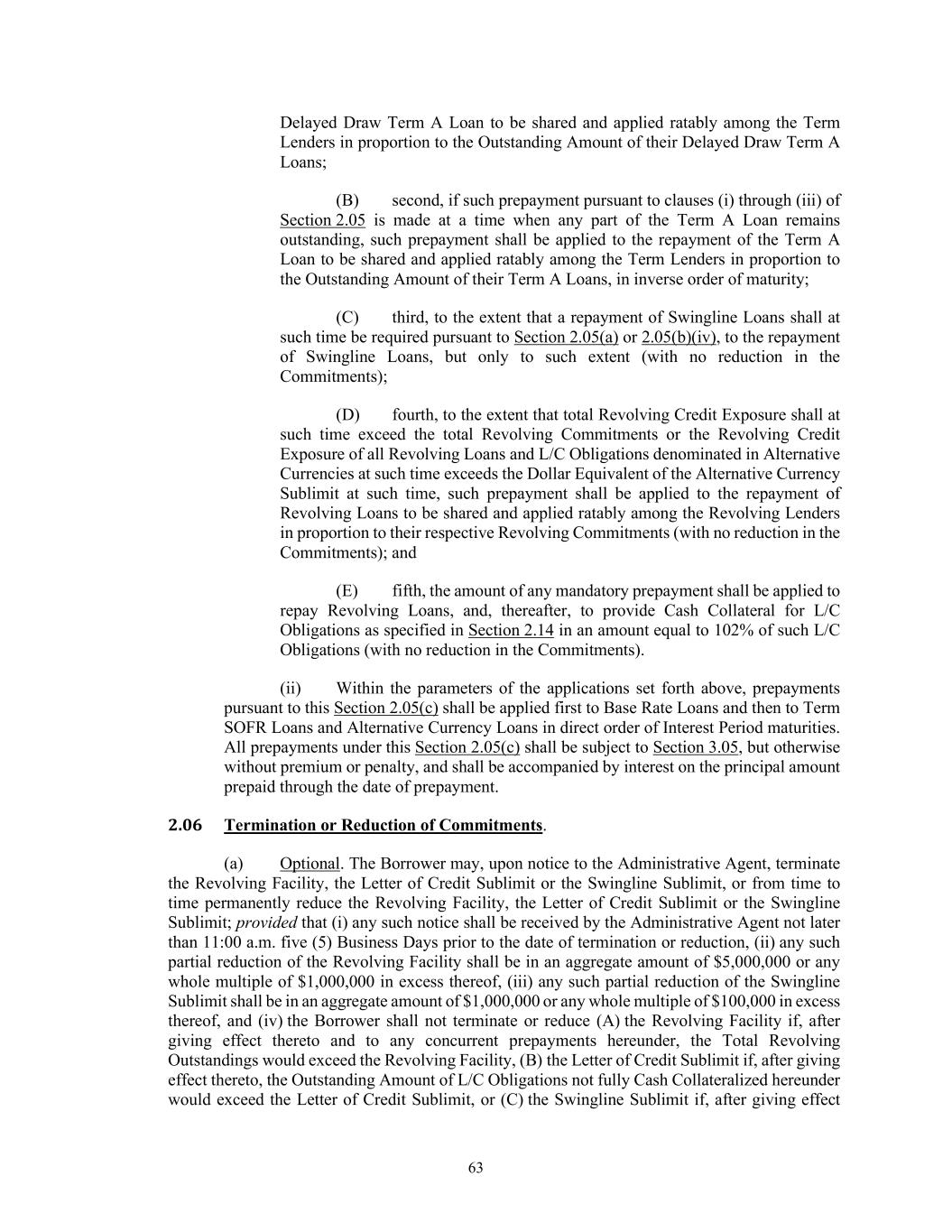 63 Delayed Draw Term A Loan to be shared and applied ratably among the Term Lenders in proportion to the Outstanding Amount of their Delayed Draw Term A Loans; (B) second, if such prepayment pursuant to clauses (i) through (iii) of Section 2.05 is made at a time when any part of the Term A Loan remains outstanding, such prepayment shall be applied to the repayment of the Term A Loan to be shared and applied ratably among the Term Lenders in proportion to the Outstanding Amount of their Term A Loans, in inverse order of maturity; (C) third, to the extent that a repayment of Swingline Loans shall at such time be required pursuant to Section 2.05(a) or 2.05(b)(iv), to the repayment of Swingline Loans, but only to such extent (with no reduction in the Commitments); (D) fourth, to the extent that total Revolving Credit Exposure shall at such time exceed the total Revolving Commitments or the Revolving Credit Exposure of all Revolving Loans and L/C Obligations denominated in Alternative Currencies at such time exceeds the Dollar Equivalent of the Alternative Currency Sublimit at such time, such prepayment shall be applied to the repayment of Revolving Loans to be shared and applied ratably among the Revolving Lenders in proportion to their respective Revolving Commitments (with no reduction in the Commitments); and (E) fifth, the amount of any mandatory prepayment shall be applied to repay Revolving Loans, and, thereafter, to provide Cash Collateral for L/C Obligations as specified in Section 2.14 in an amount equal to 102% of such L/C Obligations (with no reduction in the Commitments). (ii) Within the parameters of the applications set forth above, prepayments pursuant to this Section 2.05(c) shall be applied first to Base Rate Loans and then to Term SOFR Loans and Alternative Currency Loans in direct order of Interest Period maturities. All prepayments under this Section 2.05(c) shall be subject to Section 3.05, but otherwise without premium or penalty, and shall be accompanied by interest on the principal amount prepaid through the date of prepayment. 2.06 Termination or Reduction of Commitments. (a) Optional. The Borrower may, upon notice to the Administrative Agent, terminate the Revolving Facility, the Letter of Credit Sublimit or the Swingline Sublimit, or from time to time permanently reduce the Revolving Facility, the Letter of Credit Sublimit or the Swingline Sublimit; provided that (i) any such notice shall be received by the Administrative Agent not later than 11:00 a.m. five (5) Business Days prior to the date of termination or reduction, (ii) any such partial reduction of the Revolving Facility shall be in an aggregate amount of $5,000,000 or any whole multiple of $1,000,000 in excess thereof, (iii) any such partial reduction of the Swingline Sublimit shall be in an aggregate amount of $1,000,000 or any whole multiple of $100,000 in excess thereof, and (iv) the Borrower shall not terminate or reduce (A) the Revolving Facility if, after giving effect thereto and to any concurrent prepayments hereunder, the Total Revolving Outstandings would exceed the Revolving Facility, (B) the Letter of Credit Sublimit if, after giving effect thereto, the Outstanding Amount of L/C Obligations not fully Cash Collateralized hereunder would exceed the Letter of Credit Sublimit, or (C) the Swingline Sublimit if, after giving effect