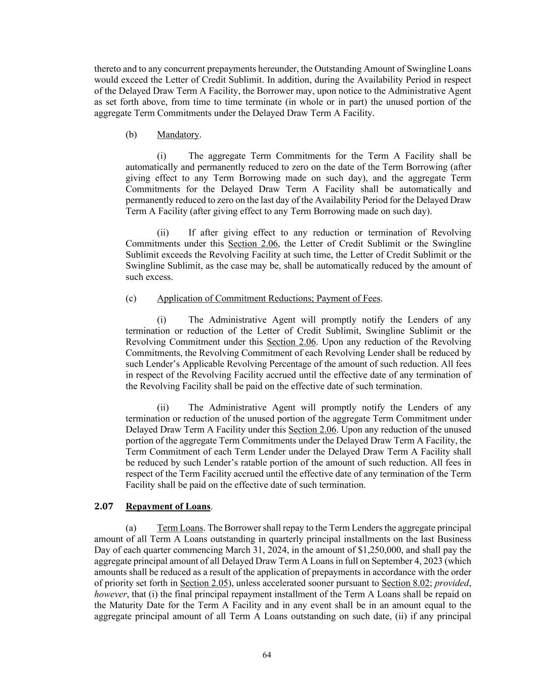 64 thereto and to any concurrent prepayments hereunder, the Outstanding Amount of Swingline Loans would exceed the Letter of Credit Sublimit. In addition, during the Availability Period in respect of the Delayed Draw Term A Facility, the Borrower may, upon notice to the Administrative Agent as set forth above, from time to time terminate (in whole or in part) the unused portion of the aggregate Term Commitments under the Delayed Draw Term A Facility. (b) Mandatory. (i) The aggregate Term Commitments for the Term A Facility shall be automatically and permanently reduced to zero on the date of the Term Borrowing (after giving effect to any Term Borrowing made on such day), and the aggregate Term Commitments for the Delayed Draw Term A Facility shall be automatically and permanently reduced to zero on the last day of the Availability Period for the Delayed Draw Term A Facility (after giving effect to any Term Borrowing made on such day). (ii) If after giving effect to any reduction or termination of Revolving Commitments under this Section 2.06, the Letter of Credit Sublimit or the Swingline Sublimit exceeds the Revolving Facility at such time, the Letter of Credit Sublimit or the Swingline Sublimit, as the case may be, shall be automatically reduced by the amount of such excess. (c) Application of Commitment Reductions; Payment of Fees. (i) The Administrative Agent will promptly notify the Lenders of any termination or reduction of the Letter of Credit Sublimit, Swingline Sublimit or the Revolving Commitment under this Section 2.06. Upon any reduction of the Revolving Commitments, the Revolving Commitment of each Revolving Lender shall be reduced by such Lender’s Applicable Revolving Percentage of the amount of such reduction. All fees in respect of the Revolving Facility accrued until the effective date of any termination of the Revolving Facility shall be paid on the effective date of such termination. (ii) The Administrative Agent will promptly notify the Lenders of any termination or reduction of the unused portion of the aggregate Term Commitment under Delayed Draw Term A Facility under this Section 2.06. Upon any reduction of the unused portion of the aggregate Term Commitments under the Delayed Draw Term A Facility, the Term Commitment of each Term Lender under the Delayed Draw Term A Facility shall be reduced by such Lender’s ratable portion of the amount of such reduction. All fees in respect of the Term Facility accrued until the effective date of any termination of the Term Facility shall be paid on the effective date of such termination. 2.07 Repayment of Loans. (a) Term Loans. The Borrower shall repay to the Term Lenders the aggregate principal amount of all Term A Loans outstanding in quarterly principal installments on the last Business Day of each quarter commencing March 31, 2024, in the amount of $1,250,000, and shall pay the aggregate principal amount of all Delayed Draw Term A Loans in full on September 4, 2023 (which amounts shall be reduced as a result of the application of prepayments in accordance with the order of priority set forth in Section 2.05), unless accelerated sooner pursuant to Section 8.02; provided, however, that (i) the final principal repayment installment of the Term A Loans shall be repaid on the Maturity Date for the Term A Facility and in any event shall be in an amount equal to the aggregate principal amount of all Term A Loans outstanding on such date, (ii) if any principal