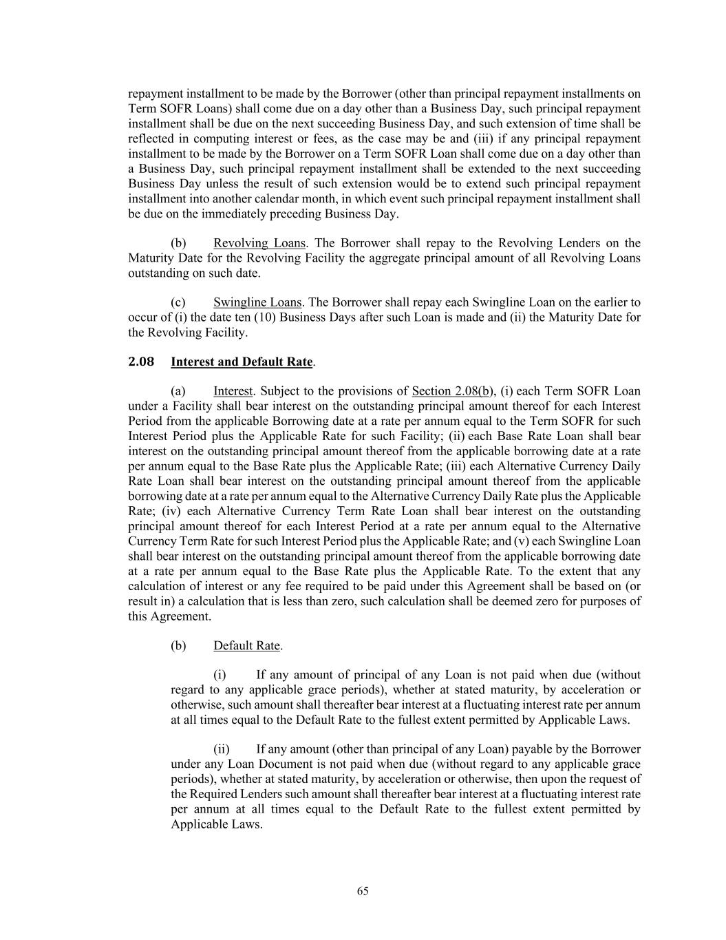 65 repayment installment to be made by the Borrower (other than principal repayment installments on Term SOFR Loans) shall come due on a day other than a Business Day, such principal repayment installment shall be due on the next succeeding Business Day, and such extension of time shall be reflected in computing interest or fees, as the case may be and (iii) if any principal repayment installment to be made by the Borrower on a Term SOFR Loan shall come due on a day other than a Business Day, such principal repayment installment shall be extended to the next succeeding Business Day unless the result of such extension would be to extend such principal repayment installment into another calendar month, in which event such principal repayment installment shall be due on the immediately preceding Business Day. (b) Revolving Loans. The Borrower shall repay to the Revolving Lenders on the Maturity Date for the Revolving Facility the aggregate principal amount of all Revolving Loans outstanding on such date. (c) Swingline Loans. The Borrower shall repay each Swingline Loan on the earlier to occur of (i) the date ten (10) Business Days after such Loan is made and (ii) the Maturity Date for the Revolving Facility. 2.08 Interest and Default Rate. (a) Interest. Subject to the provisions of Section 2.08(b), (i) each Term SOFR Loan under a Facility shall bear interest on the outstanding principal amount thereof for each Interest Period from the applicable Borrowing date at a rate per annum equal to the Term SOFR for such Interest Period plus the Applicable Rate for such Facility; (ii) each Base Rate Loan shall bear interest on the outstanding principal amount thereof from the applicable borrowing date at a rate per annum equal to the Base Rate plus the Applicable Rate; (iii) each Alternative Currency Daily Rate Loan shall bear interest on the outstanding principal amount thereof from the applicable borrowing date at a rate per annum equal to the Alternative Currency Daily Rate plus the Applicable Rate; (iv) each Alternative Currency Term Rate Loan shall bear interest on the outstanding principal amount thereof for each Interest Period at a rate per annum equal to the Alternative Currency Term Rate for such Interest Period plus the Applicable Rate; and (v) each Swingline Loan shall bear interest on the outstanding principal amount thereof from the applicable borrowing date at a rate per annum equal to the Base Rate plus the Applicable Rate. To the extent that any calculation of interest or any fee required to be paid under this Agreement shall be based on (or result in) a calculation that is less than zero, such calculation shall be deemed zero for purposes of this Agreement. (b) Default Rate. (i) If any amount of principal of any Loan is not paid when due (without regard to any applicable grace periods), whether at stated maturity, by acceleration or otherwise, such amount shall thereafter bear interest at a fluctuating interest rate per annum at all times equal to the Default Rate to the fullest extent permitted by Applicable Laws. (ii) If any amount (other than principal of any Loan) payable by the Borrower under any Loan Document is not paid when due (without regard to any applicable grace periods), whether at stated maturity, by acceleration or otherwise, then upon the request of the Required Lenders such amount shall thereafter bear interest at a fluctuating interest rate per annum at all times equal to the Default Rate to the fullest extent permitted by Applicable Laws.