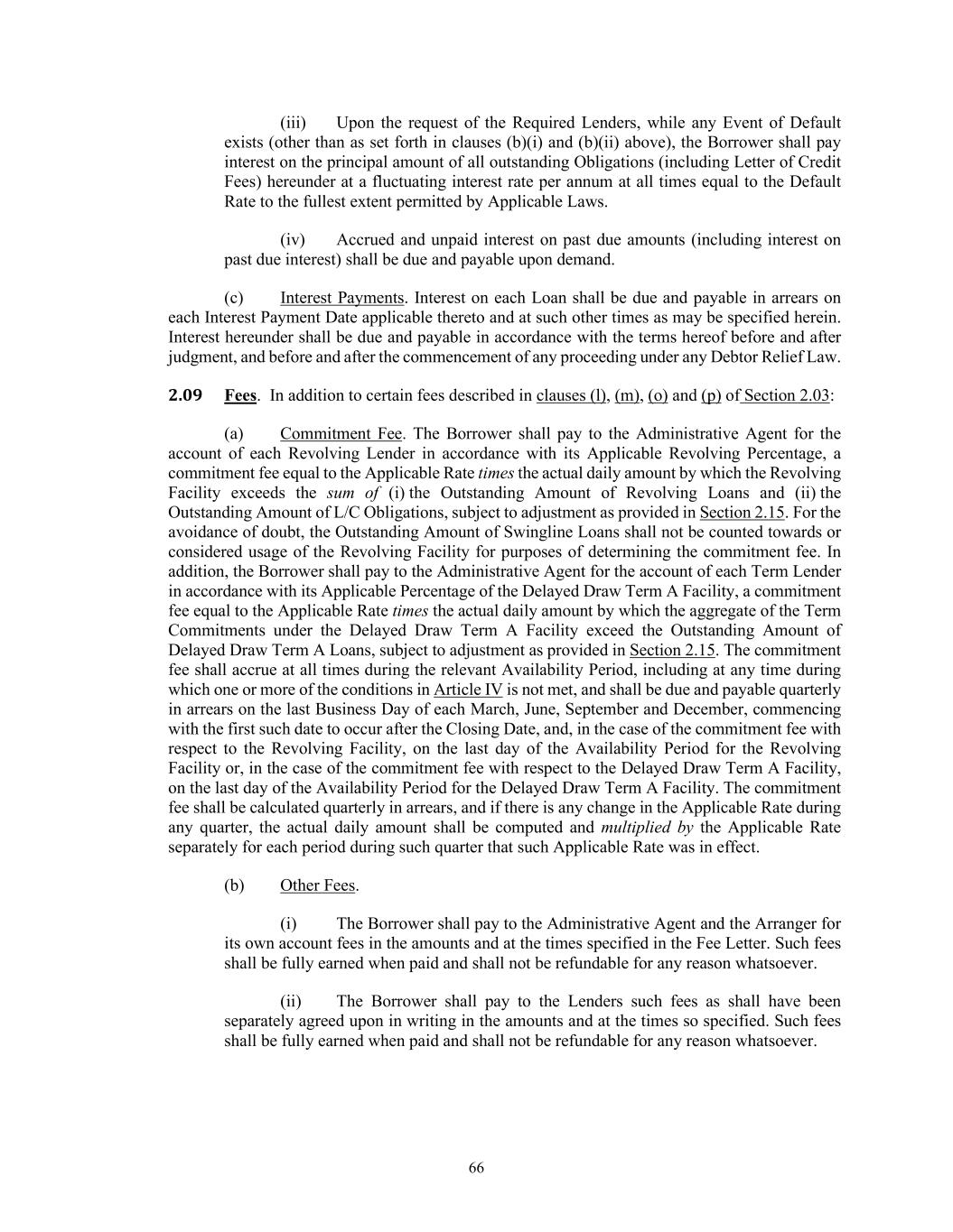 66 (iii) Upon the request of the Required Lenders, while any Event of Default exists (other than as set forth in clauses (b)(i) and (b)(ii) above), the Borrower shall pay interest on the principal amount of all outstanding Obligations (including Letter of Credit Fees) hereunder at a fluctuating interest rate per annum at all times equal to the Default Rate to the fullest extent permitted by Applicable Laws. (iv) Accrued and unpaid interest on past due amounts (including interest on past due interest) shall be due and payable upon demand. (c) Interest Payments. Interest on each Loan shall be due and payable in arrears on each Interest Payment Date applicable thereto and at such other times as may be specified herein. Interest hereunder shall be due and payable in accordance with the terms hereof before and after judgment, and before and after the commencement of any proceeding under any Debtor Relief Law. 2.09 Fees. In addition to certain fees described in clauses (l), (m), (o) and (p) of Section 2.03: (a) Commitment Fee. The Borrower shall pay to the Administrative Agent for the account of each Revolving Lender in accordance with its Applicable Revolving Percentage, a commitment fee equal to the Applicable Rate times the actual daily amount by which the Revolving Facility exceeds the sum of (i) the Outstanding Amount of Revolving Loans and (ii) the Outstanding Amount of L/C Obligations, subject to adjustment as provided in Section 2.15. For the avoidance of doubt, the Outstanding Amount of Swingline Loans shall not be counted towards or considered usage of the Revolving Facility for purposes of determining the commitment fee. In addition, the Borrower shall pay to the Administrative Agent for the account of each Term Lender in accordance with its Applicable Percentage of the Delayed Draw Term A Facility, a commitment fee equal to the Applicable Rate times the actual daily amount by which the aggregate of the Term Commitments under the Delayed Draw Term A Facility exceed the Outstanding Amount of Delayed Draw Term A Loans, subject to adjustment as provided in Section 2.15. The commitment fee shall accrue at all times during the relevant Availability Period, including at any time during which one or more of the conditions in Article IV is not met, and shall be due and payable quarterly in arrears on the last Business Day of each March, June, September and December, commencing with the first such date to occur after the Closing Date, and, in the case of the commitment fee with respect to the Revolving Facility, on the last day of the Availability Period for the Revolving Facility or, in the case of the commitment fee with respect to the Delayed Draw Term A Facility, on the last day of the Availability Period for the Delayed Draw Term A Facility. The commitment fee shall be calculated quarterly in arrears, and if there is any change in the Applicable Rate during any quarter, the actual daily amount shall be computed and multiplied by the Applicable Rate separately for each period during such quarter that such Applicable Rate was in effect. (b) Other Fees. (i) The Borrower shall pay to the Administrative Agent and the Arranger for its own account fees in the amounts and at the times specified in the Fee Letter. Such fees shall be fully earned when paid and shall not be refundable for any reason whatsoever. (ii) The Borrower shall pay to the Lenders such fees as shall have been separately agreed upon in writing in the amounts and at the times so specified. Such fees shall be fully earned when paid and shall not be refundable for any reason whatsoever.
