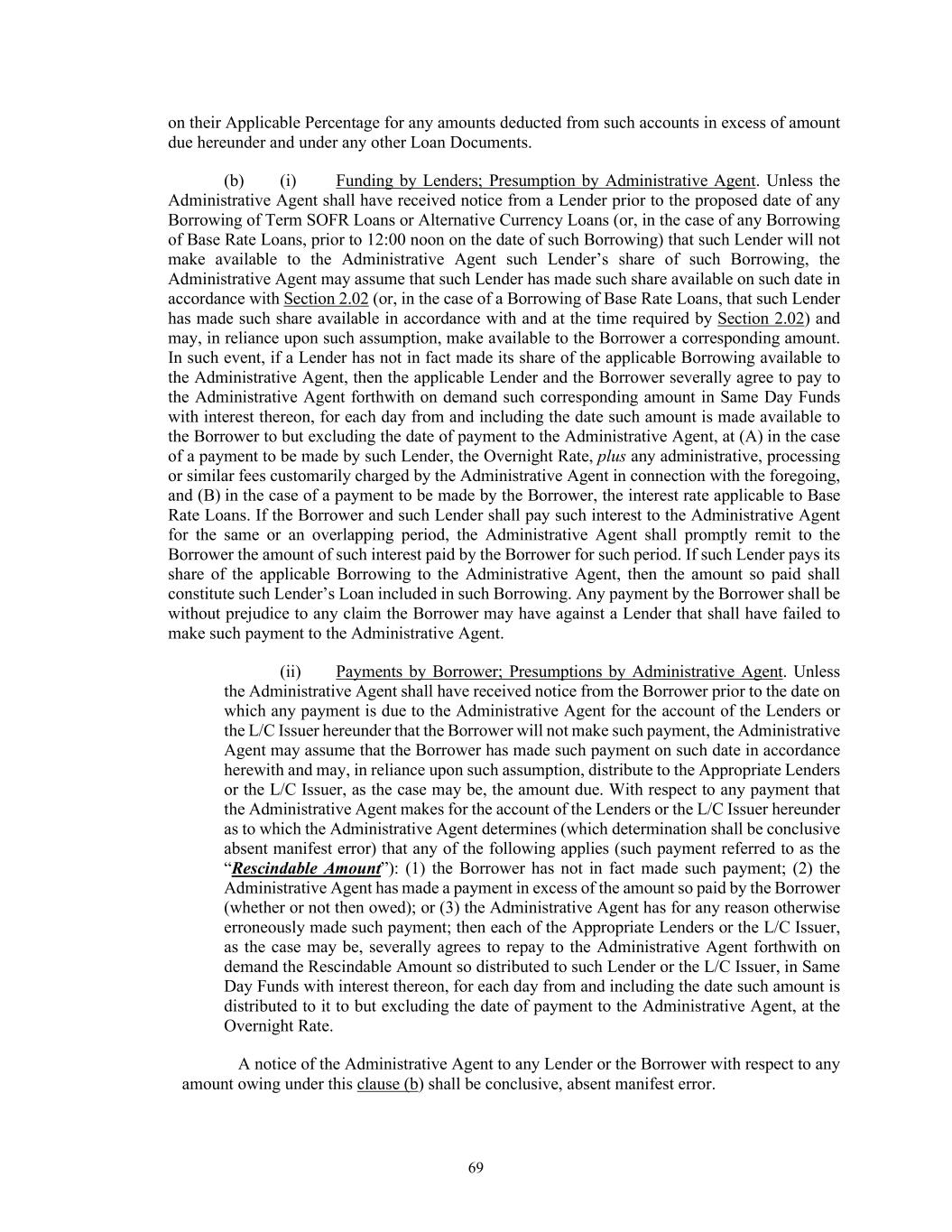 69 on their Applicable Percentage for any amounts deducted from such accounts in excess of amount due hereunder and under any other Loan Documents. (b) (i) Funding by Lenders; Presumption by Administrative Agent. Unless the Administrative Agent shall have received notice from a Lender prior to the proposed date of any Borrowing of Term SOFR Loans or Alternative Currency Loans (or, in the case of any Borrowing of Base Rate Loans, prior to 12:00 noon on the date of such Borrowing) that such Lender will not make available to the Administrative Agent such Lender’s share of such Borrowing, the Administrative Agent may assume that such Lender has made such share available on such date in accordance with Section 2.02 (or, in the case of a Borrowing of Base Rate Loans, that such Lender has made such share available in accordance with and at the time required by Section 2.02) and may, in reliance upon such assumption, make available to the Borrower a corresponding amount. In such event, if a Lender has not in fact made its share of the applicable Borrowing available to the Administrative Agent, then the applicable Lender and the Borrower severally agree to pay to the Administrative Agent forthwith on demand such corresponding amount in Same Day Funds with interest thereon, for each day from and including the date such amount is made available to the Borrower to but excluding the date of payment to the Administrative Agent, at (A) in the case of a payment to be made by such Lender, the Overnight Rate, plus any administrative, processing or similar fees customarily charged by the Administrative Agent in connection with the foregoing, and (B) in the case of a payment to be made by the Borrower, the interest rate applicable to Base Rate Loans. If the Borrower and such Lender shall pay such interest to the Administrative Agent for the same or an overlapping period, the Administrative Agent shall promptly remit to the Borrower the amount of such interest paid by the Borrower for such period. If such Lender pays its share of the applicable Borrowing to the Administrative Agent, then the amount so paid shall constitute such Lender’s Loan included in such Borrowing. Any payment by the Borrower shall be without prejudice to any claim the Borrower may have against a Lender that shall have failed to make such payment to the Administrative Agent. (ii) Payments by Borrower; Presumptions by Administrative Agent. Unless the Administrative Agent shall have received notice from the Borrower prior to the date on which any payment is due to the Administrative Agent for the account of the Lenders or the L/C Issuer hereunder that the Borrower will not make such payment, the Administrative Agent may assume that the Borrower has made such payment on such date in accordance herewith and may, in reliance upon such assumption, distribute to the Appropriate Lenders or the L/C Issuer, as the case may be, the amount due. With respect to any payment that the Administrative Agent makes for the account of the Lenders or the L/C Issuer hereunder as to which the Administrative Agent determines (which determination shall be conclusive absent manifest error) that any of the following applies (such payment referred to as the “Rescindable Amount”): (1) the Borrower has not in fact made such payment; (2) the Administrative Agent has made a payment in excess of the amount so paid by the Borrower (whether or not then owed); or (3) the Administrative Agent has for any reason otherwise erroneously made such payment; then each of the Appropriate Lenders or the L/C Issuer, as the case may be, severally agrees to repay to the Administrative Agent forthwith on demand the Rescindable Amount so distributed to such Lender or the L/C Issuer, in Same Day Funds with interest thereon, for each day from and including the date such amount is distributed to it to but excluding the date of payment to the Administrative Agent, at the Overnight Rate. A notice of the Administrative Agent to any Lender or the Borrower with respect to any amount owing under this clause (b) shall be conclusive, absent manifest error.