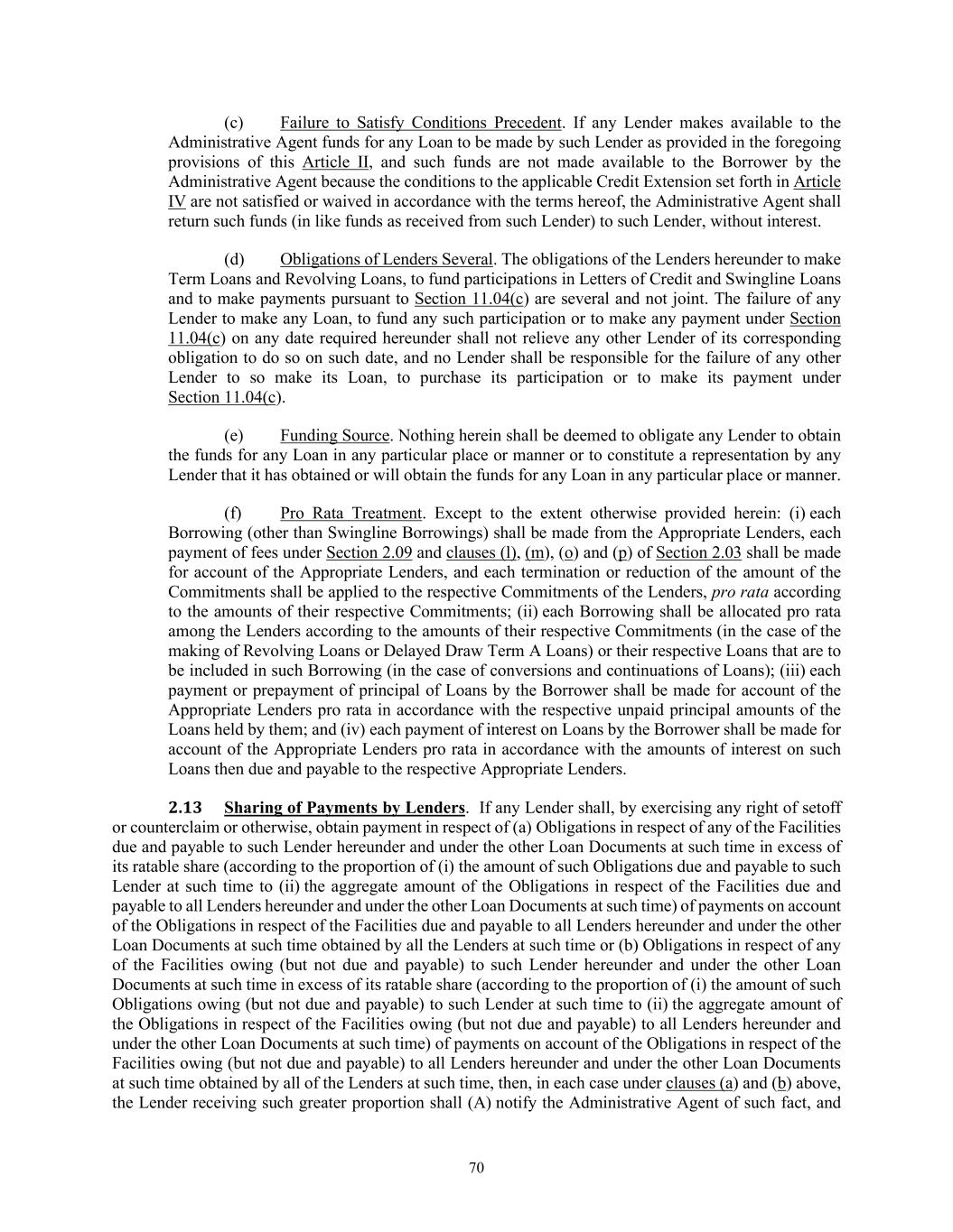 70 (c) Failure to Satisfy Conditions Precedent. If any Lender makes available to the Administrative Agent funds for any Loan to be made by such Lender as provided in the foregoing provisions of this Article II, and such funds are not made available to the Borrower by the Administrative Agent because the conditions to the applicable Credit Extension set forth in Article IV are not satisfied or waived in accordance with the terms hereof, the Administrative Agent shall return such funds (in like funds as received from such Lender) to such Lender, without interest. (d) Obligations of Lenders Several. The obligations of the Lenders hereunder to make Term Loans and Revolving Loans, to fund participations in Letters of Credit and Swingline Loans and to make payments pursuant to Section 11.04(c) are several and not joint. The failure of any Lender to make any Loan, to fund any such participation or to make any payment under Section 11.04(c) on any date required hereunder shall not relieve any other Lender of its corresponding obligation to do so on such date, and no Lender shall be responsible for the failure of any other Lender to so make its Loan, to purchase its participation or to make its payment under Section 11.04(c). (e) Funding Source. Nothing herein shall be deemed to obligate any Lender to obtain the funds for any Loan in any particular place or manner or to constitute a representation by any Lender that it has obtained or will obtain the funds for any Loan in any particular place or manner. (f) Pro Rata Treatment. Except to the extent otherwise provided herein: (i) each Borrowing (other than Swingline Borrowings) shall be made from the Appropriate Lenders, each payment of fees under Section 2.09 and clauses (l), (m), (o) and (p) of Section 2.03 shall be made for account of the Appropriate Lenders, and each termination or reduction of the amount of the Commitments shall be applied to the respective Commitments of the Lenders, pro rata according to the amounts of their respective Commitments; (ii) each Borrowing shall be allocated pro rata among the Lenders according to the amounts of their respective Commitments (in the case of the making of Revolving Loans or Delayed Draw Term A Loans) or their respective Loans that are to be included in such Borrowing (in the case of conversions and continuations of Loans); (iii) each payment or prepayment of principal of Loans by the Borrower shall be made for account of the Appropriate Lenders pro rata in accordance with the respective unpaid principal amounts of the Loans held by them; and (iv) each payment of interest on Loans by the Borrower shall be made for account of the Appropriate Lenders pro rata in accordance with the amounts of interest on such Loans then due and payable to the respective Appropriate Lenders. 2.13 Sharing of Payments by Lenders. If any Lender shall, by exercising any right of setoff or counterclaim or otherwise, obtain payment in respect of (a) Obligations in respect of any of the Facilities due and payable to such Lender hereunder and under the other Loan Documents at such time in excess of its ratable share (according to the proportion of (i) the amount of such Obligations due and payable to such Lender at such time to (ii) the aggregate amount of the Obligations in respect of the Facilities due and payable to all Lenders hereunder and under the other Loan Documents at such time) of payments on account of the Obligations in respect of the Facilities due and payable to all Lenders hereunder and under the other Loan Documents at such time obtained by all the Lenders at such time or (b) Obligations in respect of any of the Facilities owing (but not due and payable) to such Lender hereunder and under the other Loan Documents at such time in excess of its ratable share (according to the proportion of (i) the amount of such Obligations owing (but not due and payable) to such Lender at such time to (ii) the aggregate amount of the Obligations in respect of the Facilities owing (but not due and payable) to all Lenders hereunder and under the other Loan Documents at such time) of payments on account of the Obligations in respect of the Facilities owing (but not due and payable) to all Lenders hereunder and under the other Loan Documents at such time obtained by all of the Lenders at such time, then, in each case under clauses (a) and (b) above, the Lender receiving such greater proportion shall (A) notify the Administrative Agent of such fact, and