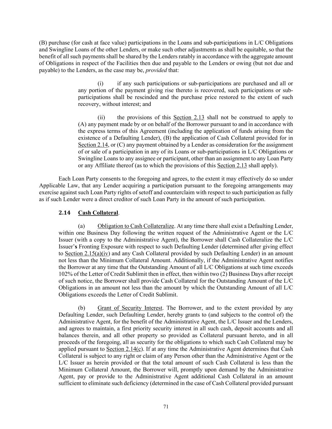 71 (B) purchase (for cash at face value) participations in the Loans and sub-participations in L/C Obligations and Swingline Loans of the other Lenders, or make such other adjustments as shall be equitable, so that the benefit of all such payments shall be shared by the Lenders ratably in accordance with the aggregate amount of Obligations in respect of the Facilities then due and payable to the Lenders or owing (but not due and payable) to the Lenders, as the case may be, provided that: (i) if any such participations or sub-participations are purchased and all or any portion of the payment giving rise thereto is recovered, such participations or sub- participations shall be rescinded and the purchase price restored to the extent of such recovery, without interest; and (ii) the provisions of this Section 2.13 shall not be construed to apply to (A) any payment made by or on behalf of the Borrower pursuant to and in accordance with the express terms of this Agreement (including the application of funds arising from the existence of a Defaulting Lender), (B) the application of Cash Collateral provided for in Section 2.14, or (C) any payment obtained by a Lender as consideration for the assignment of or sale of a participation in any of its Loans or sub-participations in L/C Obligations or Swingline Loans to any assignee or participant, other than an assignment to any Loan Party or any Affiliate thereof (as to which the provisions of this Section 2.13 shall apply). Each Loan Party consents to the foregoing and agrees, to the extent it may effectively do so under Applicable Law, that any Lender acquiring a participation pursuant to the foregoing arrangements may exercise against such Loan Party rights of setoff and counterclaim with respect to such participation as fully as if such Lender were a direct creditor of such Loan Party in the amount of such participation. 2.14 Cash Collateral. (a) Obligation to Cash Collateralize. At any time there shall exist a Defaulting Lender, within one Business Day following the written request of the Administrative Agent or the L/C Issuer (with a copy to the Administrative Agent), the Borrower shall Cash Collateralize the L/C Issuer’s Fronting Exposure with respect to such Defaulting Lender (determined after giving effect to Section 2.15(a)(iv) and any Cash Collateral provided by such Defaulting Lender) in an amount not less than the Minimum Collateral Amount. Additionally, if the Administrative Agent notifies the Borrower at any time that the Outstanding Amount of all L/C Obligations at such time exceeds 102% of the Letter of Credit Sublimit then in effect, then within two (2) Business Days after receipt of such notice, the Borrower shall provide Cash Collateral for the Outstanding Amount of the L/C Obligations in an amount not less than the amount by which the Outstanding Amount of all L/C Obligations exceeds the Letter of Credit Sublimit. (b) Grant of Security Interest. The Borrower, and to the extent provided by any Defaulting Lender, such Defaulting Lender, hereby grants to (and subjects to the control of) the Administrative Agent, for the benefit of the Administrative Agent, the L/C Issuer and the Lenders, and agrees to maintain, a first priority security interest in all such cash, deposit accounts and all balances therein, and all other property so provided as Collateral pursuant hereto, and in all proceeds of the foregoing, all as security for the obligations to which such Cash Collateral may be applied pursuant to Section 2.14(c). If at any time the Administrative Agent determines that Cash Collateral is subject to any right or claim of any Person other than the Administrative Agent or the L/C Issuer as herein provided or that the total amount of such Cash Collateral is less than the Minimum Collateral Amount, the Borrower will, promptly upon demand by the Administrative Agent, pay or provide to the Administrative Agent additional Cash Collateral in an amount sufficient to eliminate such deficiency (determined in the case of Cash Collateral provided pursuant