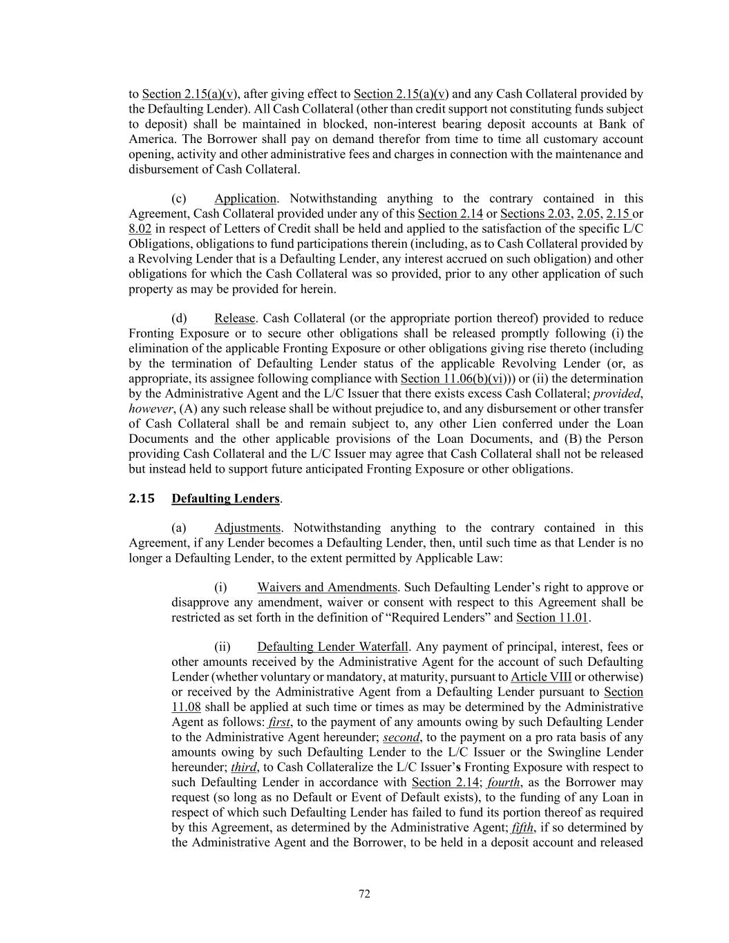 72 to Section 2.15(a)(v), after giving effect to Section 2.15(a)(v) and any Cash Collateral provided by the Defaulting Lender). All Cash Collateral (other than credit support not constituting funds subject to deposit) shall be maintained in blocked, non-interest bearing deposit accounts at Bank of America. The Borrower shall pay on demand therefor from time to time all customary account opening, activity and other administrative fees and charges in connection with the maintenance and disbursement of Cash Collateral. (c) Application. Notwithstanding anything to the contrary contained in this Agreement, Cash Collateral provided under any of this Section 2.14 or Sections 2.03, 2.05, 2.15 or 8.02 in respect of Letters of Credit shall be held and applied to the satisfaction of the specific L/C Obligations, obligations to fund participations therein (including, as to Cash Collateral provided by a Revolving Lender that is a Defaulting Lender, any interest accrued on such obligation) and other obligations for which the Cash Collateral was so provided, prior to any other application of such property as may be provided for herein. (d) Release. Cash Collateral (or the appropriate portion thereof) provided to reduce Fronting Exposure or to secure other obligations shall be released promptly following (i) the elimination of the applicable Fronting Exposure or other obligations giving rise thereto (including by the termination of Defaulting Lender status of the applicable Revolving Lender (or, as appropriate, its assignee following compliance with Section 11.06(b)(vi))) or (ii) the determination by the Administrative Agent and the L/C Issuer that there exists excess Cash Collateral; provided, however, (A) any such release shall be without prejudice to, and any disbursement or other transfer of Cash Collateral shall be and remain subject to, any other Lien conferred under the Loan Documents and the other applicable provisions of the Loan Documents, and (B) the Person providing Cash Collateral and the L/C Issuer may agree that Cash Collateral shall not be released but instead held to support future anticipated Fronting Exposure or other obligations. 2.15 Defaulting Lenders. (a) Adjustments. Notwithstanding anything to the contrary contained in this Agreement, if any Lender becomes a Defaulting Lender, then, until such time as that Lender is no longer a Defaulting Lender, to the extent permitted by Applicable Law: (i) Waivers and Amendments. Such Defaulting Lender’s right to approve or disapprove any amendment, waiver or consent with respect to this Agreement shall be restricted as set forth in the definition of “Required Lenders” and Section 11.01. (ii) Defaulting Lender Waterfall. Any payment of principal, interest, fees or other amounts received by the Administrative Agent for the account of such Defaulting Lender (whether voluntary or mandatory, at maturity, pursuant to Article VIII or otherwise) or received by the Administrative Agent from a Defaulting Lender pursuant to Section 11.08 shall be applied at such time or times as may be determined by the Administrative Agent as follows: first, to the payment of any amounts owing by such Defaulting Lender to the Administrative Agent hereunder; second, to the payment on a pro rata basis of any amounts owing by such Defaulting Lender to the L/C Issuer or the Swingline Lender hereunder; third, to Cash Collateralize the L/C Issuer’s Fronting Exposure with respect to such Defaulting Lender in accordance with Section 2.14; fourth, as the Borrower may request (so long as no Default or Event of Default exists), to the funding of any Loan in respect of which such Defaulting Lender has failed to fund its portion thereof as required by this Agreement, as determined by the Administrative Agent; fifth, if so determined by the Administrative Agent and the Borrower, to be held in a deposit account and released