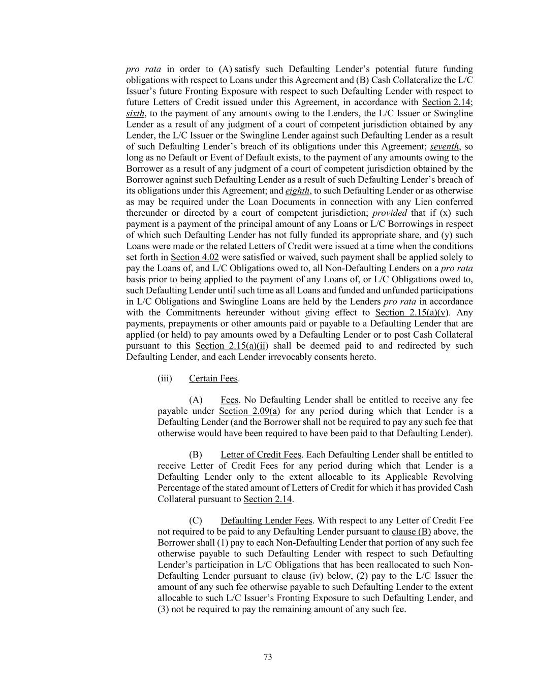 73 pro rata in order to (A) satisfy such Defaulting Lender’s potential future funding obligations with respect to Loans under this Agreement and (B) Cash Collateralize the L/C Issuer’s future Fronting Exposure with respect to such Defaulting Lender with respect to future Letters of Credit issued under this Agreement, in accordance with Section 2.14; sixth, to the payment of any amounts owing to the Lenders, the L/C Issuer or Swingline Lender as a result of any judgment of a court of competent jurisdiction obtained by any Lender, the L/C Issuer or the Swingline Lender against such Defaulting Lender as a result of such Defaulting Lender’s breach of its obligations under this Agreement; seventh, so long as no Default or Event of Default exists, to the payment of any amounts owing to the Borrower as a result of any judgment of a court of competent jurisdiction obtained by the Borrower against such Defaulting Lender as a result of such Defaulting Lender’s breach of its obligations under this Agreement; and eighth, to such Defaulting Lender or as otherwise as may be required under the Loan Documents in connection with any Lien conferred thereunder or directed by a court of competent jurisdiction; provided that if (x) such payment is a payment of the principal amount of any Loans or L/C Borrowings in respect of which such Defaulting Lender has not fully funded its appropriate share, and (y) such Loans were made or the related Letters of Credit were issued at a time when the conditions set forth in Section 4.02 were satisfied or waived, such payment shall be applied solely to pay the Loans of, and L/C Obligations owed to, all Non-Defaulting Lenders on a pro rata basis prior to being applied to the payment of any Loans of, or L/C Obligations owed to, such Defaulting Lender until such time as all Loans and funded and unfunded participations in L/C Obligations and Swingline Loans are held by the Lenders pro rata in accordance with the Commitments hereunder without giving effect to Section 2.15(a)(v). Any payments, prepayments or other amounts paid or payable to a Defaulting Lender that are applied (or held) to pay amounts owed by a Defaulting Lender or to post Cash Collateral pursuant to this Section 2.15(a)(ii) shall be deemed paid to and redirected by such Defaulting Lender, and each Lender irrevocably consents hereto. (iii) Certain Fees. (A) Fees. No Defaulting Lender shall be entitled to receive any fee payable under Section 2.09(a) for any period during which that Lender is a Defaulting Lender (and the Borrower shall not be required to pay any such fee that otherwise would have been required to have been paid to that Defaulting Lender). (B) Letter of Credit Fees. Each Defaulting Lender shall be entitled to receive Letter of Credit Fees for any period during which that Lender is a Defaulting Lender only to the extent allocable to its Applicable Revolving Percentage of the stated amount of Letters of Credit for which it has provided Cash Collateral pursuant to Section 2.14. (C) Defaulting Lender Fees. With respect to any Letter of Credit Fee not required to be paid to any Defaulting Lender pursuant to clause (B) above, the Borrower shall (1) pay to each Non-Defaulting Lender that portion of any such fee otherwise payable to such Defaulting Lender with respect to such Defaulting Lender’s participation in L/C Obligations that has been reallocated to such Non- Defaulting Lender pursuant to clause (iv) below, (2) pay to the L/C Issuer the amount of any such fee otherwise payable to such Defaulting Lender to the extent allocable to such L/C Issuer’s Fronting Exposure to such Defaulting Lender, and (3) not be required to pay the remaining amount of any such fee.