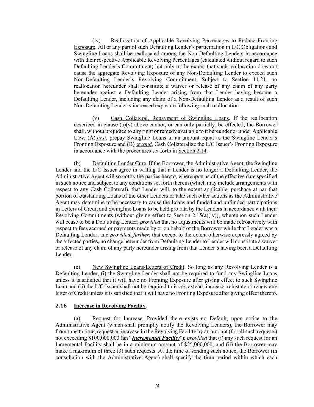 74 (iv) Reallocation of Applicable Revolving Percentages to Reduce Fronting Exposure. All or any part of such Defaulting Lender’s participation in L/C Obligations and Swingline Loans shall be reallocated among the Non-Defaulting Lenders in accordance with their respective Applicable Revolving Percentages (calculated without regard to such Defaulting Lender’s Commitment) but only to the extent that such reallocation does not cause the aggregate Revolving Exposure of any Non-Defaulting Lender to exceed such Non-Defaulting Lender’s Revolving Commitment. Subject to Section 11.21, no reallocation hereunder shall constitute a waiver or release of any claim of any party hereunder against a Defaulting Lender arising from that Lender having become a Defaulting Lender, including any claim of a Non-Defaulting Lender as a result of such Non-Defaulting Lender’s increased exposure following such reallocation. (v) Cash Collateral, Repayment of Swingline Loans. If the reallocation described in clause (a)(v) above cannot, or can only partially, be effected, the Borrower shall, without prejudice to any right or remedy available to it hereunder or under Applicable Law, (A) first, prepay Swingline Loans in an amount equal to the Swingline Lender’s Fronting Exposure and (B) second, Cash Collateralize the L/C Issuer’s Fronting Exposure in accordance with the procedures set forth in Section 2.14. (b) Defaulting Lender Cure. If the Borrower, the Administrative Agent, the Swingline Lender and the L/C Issuer agree in writing that a Lender is no longer a Defaulting Lender, the Administrative Agent will so notify the parties hereto, whereupon as of the effective date specified in such notice and subject to any conditions set forth therein (which may include arrangements with respect to any Cash Collateral), that Lender will, to the extent applicable, purchase at par that portion of outstanding Loans of the other Lenders or take such other actions as the Administrative Agent may determine to be necessary to cause the Loans and funded and unfunded participations in Letters of Credit and Swingline Loans to be held pro rata by the Lenders in accordance with their Revolving Commitments (without giving effect to Section 2.15(a)(iv)), whereupon such Lender will cease to be a Defaulting Lender; provided that no adjustments will be made retroactively with respect to fees accrued or payments made by or on behalf of the Borrower while that Lender was a Defaulting Lender; and provided, further, that except to the extent otherwise expressly agreed by the affected parties, no change hereunder from Defaulting Lender to Lender will constitute a waiver or release of any claim of any party hereunder arising from that Lender’s having been a Defaulting Lender. (c) New Swingline Loans/Letters of Credit. So long as any Revolving Lender is a Defaulting Lender, (i) the Swingline Lender shall not be required to fund any Swingline Loans unless it is satisfied that it will have no Fronting Exposure after giving effect to such Swingline Loan and (ii) the L/C Issuer shall not be required to issue, extend, increase, reinstate or renew any letter of Credit unless it is satisfied that it will have no Fronting Exposure after giving effect thereto. 2.16 Increase in Revolving Facility. (a) Request for Increase. Provided there exists no Default, upon notice to the Administrative Agent (which shall promptly notify the Revolving Lenders), the Borrower may from time to time, request an increase in the Revolving Facility by an amount (for all such requests) not exceeding $100,000,000 (an “Incremental Facility”); provided that (i) any such request for an Incremental Facility shall be in a minimum amount of $25,000,000, and (ii) the Borrower may make a maximum of three (3) such requests. At the time of sending such notice, the Borrower (in consultation with the Administrative Agent) shall specify the time period within which each
