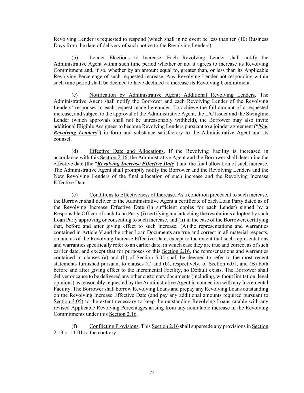 75 Revolving Lender is requested to respond (which shall in no event be less than ten (10) Business Days from the date of delivery of such notice to the Revolving Lenders). (b) Lender Elections to Increase. Each Revolving Lender shall notify the Administrative Agent within such time period whether or not it agrees to increase its Revolving Commitment and, if so, whether by an amount equal to, greater than, or less than its Applicable Revolving Percentage of such requested increase. Any Revolving Lender not responding within such time period shall be deemed to have declined to increase its Revolving Commitment. (c) Notification by Administrative Agent; Additional Revolving Lenders. The Administrative Agent shall notify the Borrower and each Revolving Lender of the Revolving Lenders’ responses to each request made hereunder. To achieve the full amount of a requested increase, and subject to the approval of the Administrative Agent, the L/C Issuer and the Swingline Lender (which approvals shall not be unreasonably withheld), the Borrower may also invite additional Eligible Assignees to become Revolving Lenders pursuant to a joinder agreement (“New Revolving Lenders”) in form and substance satisfactory to the Administrative Agent and its counsel. (d) Effective Date and Allocations. If the Revolving Facility is increased in accordance with this Section 2.16, the Administrative Agent and the Borrower shall determine the effective date (the “Revolving Increase Effective Date”) and the final allocation of such increase. The Administrative Agent shall promptly notify the Borrower and the Revolving Lenders and the New Revolving Lenders of the final allocation of such increase and the Revolving Increase Effective Date. (e) Conditions to Effectiveness of Increase. As a condition precedent to such increase, the Borrower shall deliver to the Administrative Agent a certificate of each Loan Party dated as of the Revolving Increase Effective Date (in sufficient copies for each Lender) signed by a Responsible Officer of such Loan Party (i) certifying and attaching the resolutions adopted by such Loan Party approving or consenting to such increase, and (ii) in the case of the Borrower, certifying that, before and after giving effect to such increase, (A) the representations and warranties contained in Article V and the other Loan Documents are true and correct in all material respects, on and as of the Revolving Increase Effective Date, except to the extent that such representations and warranties specifically refer to an earlier date, in which case they are true and correct as of such earlier date, and except that for purposes of this Section 2.16, the representations and warranties contained in clauses (a) and (b) of Section 5.05 shall be deemed to refer to the most recent statements furnished pursuant to clauses (a) and (b), respectively, of Section 6.01, and (B) both before and after giving effect to the Incremental Facility, no Default exists. The Borrower shall deliver or cause to be delivered any other customary documents (including, without limitation, legal opinions) as reasonably requested by the Administrative Agent in connection with any Incremental Facility. The Borrower shall borrow Revolving Loans and prepay any Revolving Loans outstanding on the Revolving Increase Effective Date (and pay any additional amounts required pursuant to Section 3.05) to the extent necessary to keep the outstanding Revolving Loans ratable with any revised Applicable Revolving Percentages arising from any nonratable increase in the Revolving Commitments under this Section 2.16. (f) Conflicting Provisions. This Section 2.16 shall supersede any provisions in Section 2.13 or 11.01 to the contrary.
