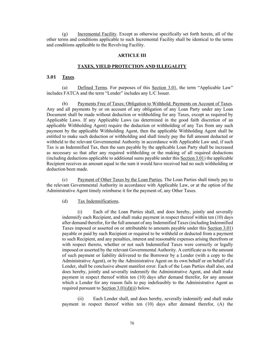 76 (g) Incremental Facility. Except as otherwise specifically set forth herein, all of the other terms and conditions applicable to such Incremental Facility shall be identical to the terms and conditions applicable to the Revolving Facility. ARTICLE III TAXES, YIELD PROTECTION AND ILLEGALITY 3.01 Taxes. (a) Defined Terms. For purposes of this Section 3.01, the term “Applicable Law” includes FATCA and the term “Lender” includes any L/C Issuer. (b) Payments Free of Taxes; Obligation to Withhold; Payments on Account of Taxes. Any and all payments by or on account of any obligation of any Loan Party under any Loan Document shall be made without deduction or withholding for any Taxes, except as required by Applicable Laws. If any Applicable Laws (as determined in the good faith discretion of an applicable Withholding Agent) require the deduction or withholding of any Tax from any such payment by the applicable Withholding Agent, then the applicable Withholding Agent shall be entitled to make such deduction or withholding and shall timely pay the full amount deducted or withheld to the relevant Governmental Authority in accordance with Applicable Law and, if such Tax is an Indemnified Tax, then the sum payable by the applicable Loan Party shall be increased as necessary so that after any required withholding or the making of all required deductions (including deductions applicable to additional sums payable under this Section 3.01) the applicable Recipient receives an amount equal to the sum it would have received had no such withholding or deduction been made. (c) Payment of Other Taxes by the Loan Parties. The Loan Parties shall timely pay to the relevant Governmental Authority in accordance with Applicable Law, or at the option of the Administrative Agent timely reimburse it for the payment of, any Other Taxes. (d) Tax Indemnifications. (i) Each of the Loan Parties shall, and does hereby, jointly and severally indemnify each Recipient, and shall make payment in respect thereof within ten (10) days after demand therefor, for the full amount of any Indemnified Taxes (including Indemnified Taxes imposed or asserted on or attributable to amounts payable under this Section 3.01) payable or paid by such Recipient or required to be withheld or deducted from a payment to such Recipient, and any penalties, interest and reasonable expenses arising therefrom or with respect thereto, whether or not such Indemnified Taxes were correctly or legally imposed or asserted by the relevant Governmental Authority. A certificate as to the amount of such payment or liability delivered to the Borrower by a Lender (with a copy to the Administrative Agent), or by the Administrative Agent on its own behalf or on behalf of a Lender, shall be conclusive absent manifest error. Each of the Loan Parties shall also, and does hereby, jointly and severally indemnify the Administrative Agent, and shall make payment in respect thereof within ten (10) days after demand therefor, for any amount which a Lender for any reason fails to pay indefeasibly to the Administrative Agent as required pursuant to Section 3.01(d)(ii) below. (ii) Each Lender shall, and does hereby, severally indemnify and shall make payment in respect thereof within ten (10) days after demand therefor, (A) the