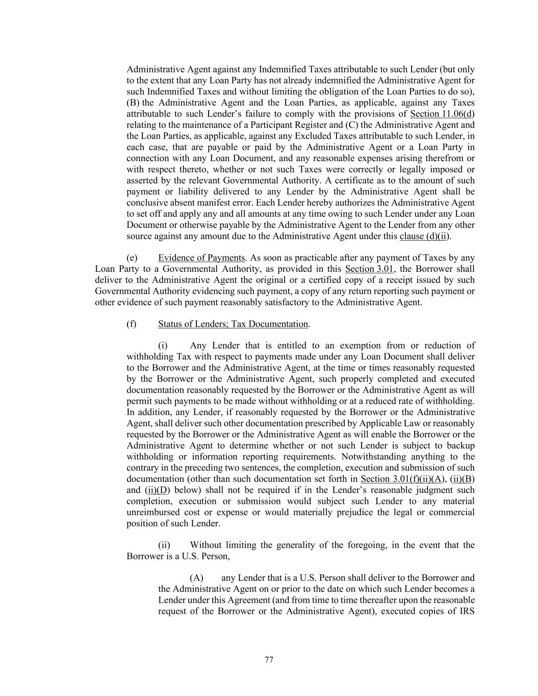 77 Administrative Agent against any Indemnified Taxes attributable to such Lender (but only to the extent that any Loan Party has not already indemnified the Administrative Agent for such Indemnified Taxes and without limiting the obligation of the Loan Parties to do so), (B) the Administrative Agent and the Loan Parties, as applicable, against any Taxes attributable to such Lender’s failure to comply with the provisions of Section 11.06(d) relating to the maintenance of a Participant Register and (C) the Administrative Agent and the Loan Parties, as applicable, against any Excluded Taxes attributable to such Lender, in each case, that are payable or paid by the Administrative Agent or a Loan Party in connection with any Loan Document, and any reasonable expenses arising therefrom or with respect thereto, whether or not such Taxes were correctly or legally imposed or asserted by the relevant Governmental Authority. A certificate as to the amount of such payment or liability delivered to any Lender by the Administrative Agent shall be conclusive absent manifest error. Each Lender hereby authorizes the Administrative Agent to set off and apply any and all amounts at any time owing to such Lender under any Loan Document or otherwise payable by the Administrative Agent to the Lender from any other source against any amount due to the Administrative Agent under this clause (d)(ii). (e) Evidence of Payments. As soon as practicable after any payment of Taxes by any Loan Party to a Governmental Authority, as provided in this Section 3.01, the Borrower shall deliver to the Administrative Agent the original or a certified copy of a receipt issued by such Governmental Authority evidencing such payment, a copy of any return reporting such payment or other evidence of such payment reasonably satisfactory to the Administrative Agent. (f) Status of Lenders; Tax Documentation. (i) Any Lender that is entitled to an exemption from or reduction of withholding Tax with respect to payments made under any Loan Document shall deliver to the Borrower and the Administrative Agent, at the time or times reasonably requested by the Borrower or the Administrative Agent, such properly completed and executed documentation reasonably requested by the Borrower or the Administrative Agent as will permit such payments to be made without withholding or at a reduced rate of withholding. In addition, any Lender, if reasonably requested by the Borrower or the Administrative Agent, shall deliver such other documentation prescribed by Applicable Law or reasonably requested by the Borrower or the Administrative Agent as will enable the Borrower or the Administrative Agent to determine whether or not such Lender is subject to backup withholding or information reporting requirements. Notwithstanding anything to the contrary in the preceding two sentences, the completion, execution and submission of such documentation (other than such documentation set forth in Section 3.01(f)(ii)(A), (ii)(B) and (ii)(D) below) shall not be required if in the Lender’s reasonable judgment such completion, execution or submission would subject such Lender to any material unreimbursed cost or expense or would materially prejudice the legal or commercial position of such Lender. (ii) Without limiting the generality of the foregoing, in the event that the Borrower is a U.S. Person, (A) any Lender that is a U.S. Person shall deliver to the Borrower and the Administrative Agent on or prior to the date on which such Lender becomes a Lender under this Agreement (and from time to time thereafter upon the reasonable request of the Borrower or the Administrative Agent), executed copies of IRS