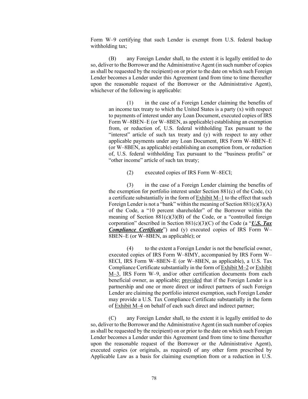78 Form W–9 certifying that such Lender is exempt from U.S. federal backup withholding tax; (B) any Foreign Lender shall, to the extent it is legally entitled to do so, deliver to the Borrower and the Administrative Agent (in such number of copies as shall be requested by the recipient) on or prior to the date on which such Foreign Lender becomes a Lender under this Agreement (and from time to time thereafter upon the reasonable request of the Borrower or the Administrative Agent), whichever of the following is applicable: (1) in the case of a Foreign Lender claiming the benefits of an income tax treaty to which the United States is a party (x) with respect to payments of interest under any Loan Document, executed copies of IRS Form W–8BEN–E (or W–8BEN, as applicable) establishing an exemption from, or reduction of, U.S. federal withholding Tax pursuant to the “interest” article of such tax treaty and (y) with respect to any other applicable payments under any Loan Document, IRS Form W–8BEN–E (or W–8BEN, as applicable) establishing an exemption from, or reduction of, U.S. federal withholding Tax pursuant to the “business profits” or “other income” article of such tax treaty; (2) executed copies of IRS Form W–8ECI; (3) in the case of a Foreign Lender claiming the benefits of the exemption for portfolio interest under Section 881(c) of the Code, (x) a certificate substantially in the form of Exhibit M–1 to the effect that such Foreign Lender is not a “bank” within the meaning of Section 881(c)(3)(A) of the Code, a “10 percent shareholder” of the Borrower within the meaning of Section 881(c)(3)(B) of the Code, or a “controlled foreign corporation” described in Section 881(c)(3)(C) of the Code (a “U.S. Tax Compliance Certificate”) and (y) executed copies of IRS Form W– 8BEN–E (or W–8BEN, as applicable); or (4) to the extent a Foreign Lender is not the beneficial owner, executed copies of IRS Form W–8IMY, accompanied by IRS Form W– 8ECI, IRS Form W–8BEN–E (or W–8BEN, as applicable), a U.S. Tax Compliance Certificate substantially in the form of Exhibit M–2 or Exhibit M–3, IRS Form W–9, and/or other certification documents from each beneficial owner, as applicable; provided that if the Foreign Lender is a partnership and one or more direct or indirect partners of such Foreign Lender are claiming the portfolio interest exemption, such Foreign Lender may provide a U.S. Tax Compliance Certificate substantially in the form of Exhibit M–4 on behalf of each such direct and indirect partner; (C) any Foreign Lender shall, to the extent it is legally entitled to do so, deliver to the Borrower and the Administrative Agent (in such number of copies as shall be requested by the recipient) on or prior to the date on which such Foreign Lender becomes a Lender under this Agreement (and from time to time thereafter upon the reasonable request of the Borrower or the Administrative Agent), executed copies (or originals, as required) of any other form prescribed by Applicable Law as a basis for claiming exemption from or a reduction in U.S.