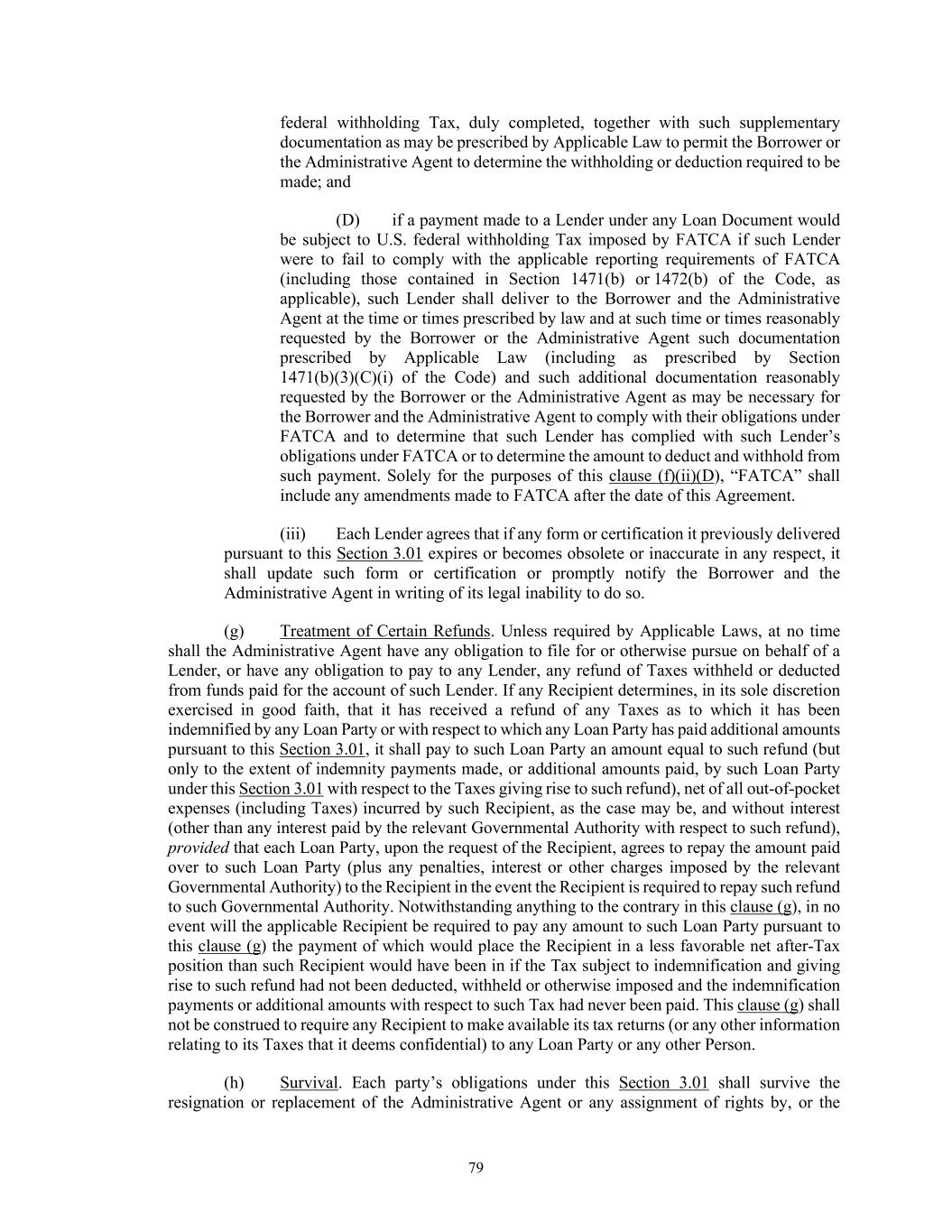 79 federal withholding Tax, duly completed, together with such supplementary documentation as may be prescribed by Applicable Law to permit the Borrower or the Administrative Agent to determine the withholding or deduction required to be made; and (D) if a payment made to a Lender under any Loan Document would be subject to U.S. federal withholding Tax imposed by FATCA if such Lender were to fail to comply with the applicable reporting requirements of FATCA (including those contained in Section 1471(b) or 1472(b) of the Code, as applicable), such Lender shall deliver to the Borrower and the Administrative Agent at the time or times prescribed by law and at such time or times reasonably requested by the Borrower or the Administrative Agent such documentation prescribed by Applicable Law (including as prescribed by Section 1471(b)(3)(C)(i) of the Code) and such additional documentation reasonably requested by the Borrower or the Administrative Agent as may be necessary for the Borrower and the Administrative Agent to comply with their obligations under FATCA and to determine that such Lender has complied with such Lender’s obligations under FATCA or to determine the amount to deduct and withhold from such payment. Solely for the purposes of this clause (f)(ii)(D), “FATCA” shall include any amendments made to FATCA after the date of this Agreement. (iii) Each Lender agrees that if any form or certification it previously delivered pursuant to this Section 3.01 expires or becomes obsolete or inaccurate in any respect, it shall update such form or certification or promptly notify the Borrower and the Administrative Agent in writing of its legal inability to do so. (g) Treatment of Certain Refunds. Unless required by Applicable Laws, at no time shall the Administrative Agent have any obligation to file for or otherwise pursue on behalf of a Lender, or have any obligation to pay to any Lender, any refund of Taxes withheld or deducted from funds paid for the account of such Lender. If any Recipient determines, in its sole discretion exercised in good faith, that it has received a refund of any Taxes as to which it has been indemnified by any Loan Party or with respect to which any Loan Party has paid additional amounts pursuant to this Section 3.01, it shall pay to such Loan Party an amount equal to such refund (but only to the extent of indemnity payments made, or additional amounts paid, by such Loan Party under this Section 3.01 with respect to the Taxes giving rise to such refund), net of all out-of-pocket expenses (including Taxes) incurred by such Recipient, as the case may be, and without interest (other than any interest paid by the relevant Governmental Authority with respect to such refund), provided that each Loan Party, upon the request of the Recipient, agrees to repay the amount paid over to such Loan Party (plus any penalties, interest or other charges imposed by the relevant Governmental Authority) to the Recipient in the event the Recipient is required to repay such refund to such Governmental Authority. Notwithstanding anything to the contrary in this clause (g), in no event will the applicable Recipient be required to pay any amount to such Loan Party pursuant to this clause (g) the payment of which would place the Recipient in a less favorable net after-Tax position than such Recipient would have been in if the Tax subject to indemnification and giving rise to such refund had not been deducted, withheld or otherwise imposed and the indemnification payments or additional amounts with respect to such Tax had never been paid. This clause (g) shall not be construed to require any Recipient to make available its tax returns (or any other information relating to its Taxes that it deems confidential) to any Loan Party or any other Person. (h) Survival. Each party’s obligations under this Section 3.01 shall survive the resignation or replacement of the Administrative Agent or any assignment of rights by, or the
