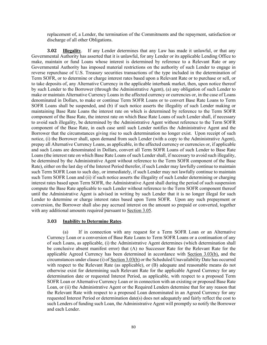 80 replacement of, a Lender, the termination of the Commitments and the repayment, satisfaction or discharge of all other Obligations. 3.02 Illegality. If any Lender determines that any Law has made it unlawful, or that any Governmental Authority has asserted that it is unlawful, for any Lender or its applicable Lending Office to make, maintain or fund Loans whose interest is determined by reference to a Relevant Rate or any Governmental Authority has imposed material restrictions on the authority of such Lender to engage in reverse repurchase of U.S. Treasury securities transactions of the type included in the determination of Term SOFR, or to determine or charge interest rates based upon a Relevant Rate or to purchase or sell, or to take deposits of, any Alternative Currency in the applicable interbank market, then, upon notice thereof by such Lender to the Borrower (through the Administrative Agent), (a) any obligation of such Lender to make or maintain Alternative Currency Loans in the affected currency or currencies or, in the case of Loans denominated in Dollars, to make or continue Term SOFR Loans or to convert Base Rate Loans to Term SOFR Loans shall be suspended, and (b) if such notice asserts the illegality of such Lender making or maintaining Base Rate Loans the interest rate on which is determined by reference to the Term SOFR component of the Base Rate, the interest rate on which Base Rate Loans of such Lender shall, if necessary to avoid such illegality, be determined by the Administrative Agent without reference to the Term SOFR component of the Base Rate, in each case until such Lender notifies the Administrative Agent and the Borrower that the circumstances giving rise to such determination no longer exist. Upon receipt of such notice, (i) the Borrower shall, upon demand from such Lender (with a copy to the Administrative Agent), prepay all Alternative Currency Loans, as applicable, in the affected currency or currencies or, if applicable and such Loans are denominated in Dollars, convert all Term SOFR Loans of such Lender to Base Rate Loans (the interest rate on which Base Rate Loans of such Lender shall, if necessary to avoid such illegality, be determined by the Administrative Agent without reference to the Term SOFR component of the Base Rate), either on the last day of the Interest Period therefor, if such Lender may lawfully continue to maintain such Term SOFR Loan to such day, or immediately, if such Lender may not lawfully continue to maintain such Term SOFR Loan and (ii) if such notice asserts the illegality of such Lender determining or charging interest rates based upon Term SOFR, the Administrative Agent shall during the period of such suspension compute the Base Rate applicable to such Lender without reference to the Term SOFR component thereof until the Administrative Agent is advised in writing by such Lender that it is no longer illegal for such Lender to determine or charge interest rates based upon Term SOFR. Upon any such prepayment or conversion, the Borrower shall also pay accrued interest on the amount so prepaid or converted, together with any additional amounts required pursuant to Section 3.05. 3.03 Inability to Determine Rates. (a) If in connection with any request for a Term SOFR Loan or an Alternative Currency Loan or a conversion of Base Rate Loans to Term SOFR Loans or a continuation of any of such Loans, as applicable, (i) the Administrative Agent determines (which determination shall be conclusive absent manifest error) that (A) no Successor Rate for the Relevant Rate for the applicable Agreed Currency has been determined in accordance with Section 3.03(b), and the circumstances under clause (i) of Section 3.03(b) or the Scheduled Unavailability Date has occurred with respect to the Relevant Rate (as applicable), or (B) adequate and reasonable means do not otherwise exist for determining such Relevant Rate for the applicable Agreed Currency for any determination date or requested Interest Period, as applicable, with respect to a proposed Term SOFR Loan or Alternative Currency Loan or in connection with an existing or proposed Base Rate Loan, or (ii) the Administrative Agent or the Required Lenders determine that for any reason that the Relevant Rate with respect to a proposed Loan denominated in an Agreed Currency for any requested Interest Period or determination date(s) does not adequately and fairly reflect the cost to such Lenders of funding such Loan, the Administrative Agent will promptly so notify the Borrower and each Lender.