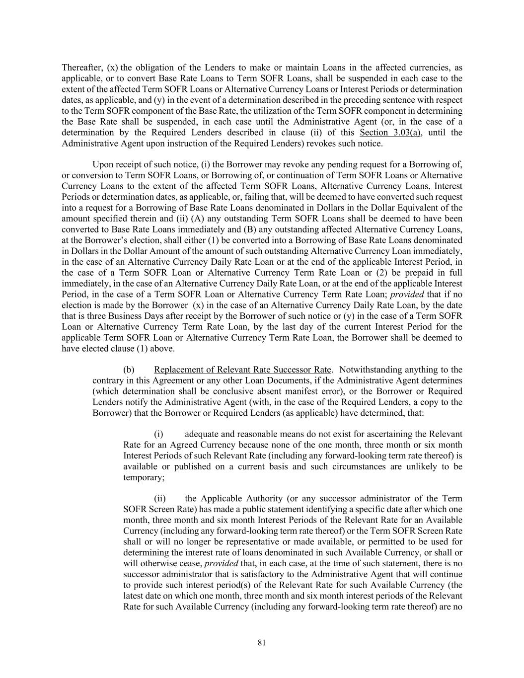 81 Thereafter, (x) the obligation of the Lenders to make or maintain Loans in the affected currencies, as applicable, or to convert Base Rate Loans to Term SOFR Loans, shall be suspended in each case to the extent of the affected Term SOFR Loans or Alternative Currency Loans or Interest Periods or determination dates, as applicable, and (y) in the event of a determination described in the preceding sentence with respect to the Term SOFR component of the Base Rate, the utilization of the Term SOFR component in determining the Base Rate shall be suspended, in each case until the Administrative Agent (or, in the case of a determination by the Required Lenders described in clause (ii) of this Section 3.03(a), until the Administrative Agent upon instruction of the Required Lenders) revokes such notice. Upon receipt of such notice, (i) the Borrower may revoke any pending request for a Borrowing of, or conversion to Term SOFR Loans, or Borrowing of, or continuation of Term SOFR Loans or Alternative Currency Loans to the extent of the affected Term SOFR Loans, Alternative Currency Loans, Interest Periods or determination dates, as applicable, or, failing that, will be deemed to have converted such request into a request for a Borrowing of Base Rate Loans denominated in Dollars in the Dollar Equivalent of the amount specified therein and (ii) (A) any outstanding Term SOFR Loans shall be deemed to have been converted to Base Rate Loans immediately and (B) any outstanding affected Alternative Currency Loans, at the Borrower’s election, shall either (1) be converted into a Borrowing of Base Rate Loans denominated in Dollars in the Dollar Amount of the amount of such outstanding Alternative Currency Loan immediately, in the case of an Alternative Currency Daily Rate Loan or at the end of the applicable Interest Period, in the case of a Term SOFR Loan or Alternative Currency Term Rate Loan or (2) be prepaid in full immediately, in the case of an Alternative Currency Daily Rate Loan, or at the end of the applicable Interest Period, in the case of a Term SOFR Loan or Alternative Currency Term Rate Loan; provided that if no election is made by the Borrower (x) in the case of an Alternative Currency Daily Rate Loan, by the date that is three Business Days after receipt by the Borrower of such notice or (y) in the case of a Term SOFR Loan or Alternative Currency Term Rate Loan, by the last day of the current Interest Period for the applicable Term SOFR Loan or Alternative Currency Term Rate Loan, the Borrower shall be deemed to have elected clause (1) above. (b) Replacement of Relevant Rate Successor Rate. Notwithstanding anything to the contrary in this Agreement or any other Loan Documents, if the Administrative Agent determines (which determination shall be conclusive absent manifest error), or the Borrower or Required Lenders notify the Administrative Agent (with, in the case of the Required Lenders, a copy to the Borrower) that the Borrower or Required Lenders (as applicable) have determined, that: (i) adequate and reasonable means do not exist for ascertaining the Relevant Rate for an Agreed Currency because none of the one month, three month or six month Interest Periods of such Relevant Rate (including any forward-looking term rate thereof) is available or published on a current basis and such circumstances are unlikely to be temporary; (ii) the Applicable Authority (or any successor administrator of the Term SOFR Screen Rate) has made a public statement identifying a specific date after which one month, three month and six month Interest Periods of the Relevant Rate for an Available Currency (including any forward-looking term rate thereof) or the Term SOFR Screen Rate shall or will no longer be representative or made available, or permitted to be used for determining the interest rate of loans denominated in such Available Currency, or shall or will otherwise cease, provided that, in each case, at the time of such statement, there is no successor administrator that is satisfactory to the Administrative Agent that will continue to provide such interest period(s) of the Relevant Rate for such Available Currency (the latest date on which one month, three month and six month interest periods of the Relevant Rate for such Available Currency (including any forward-looking term rate thereof) are no